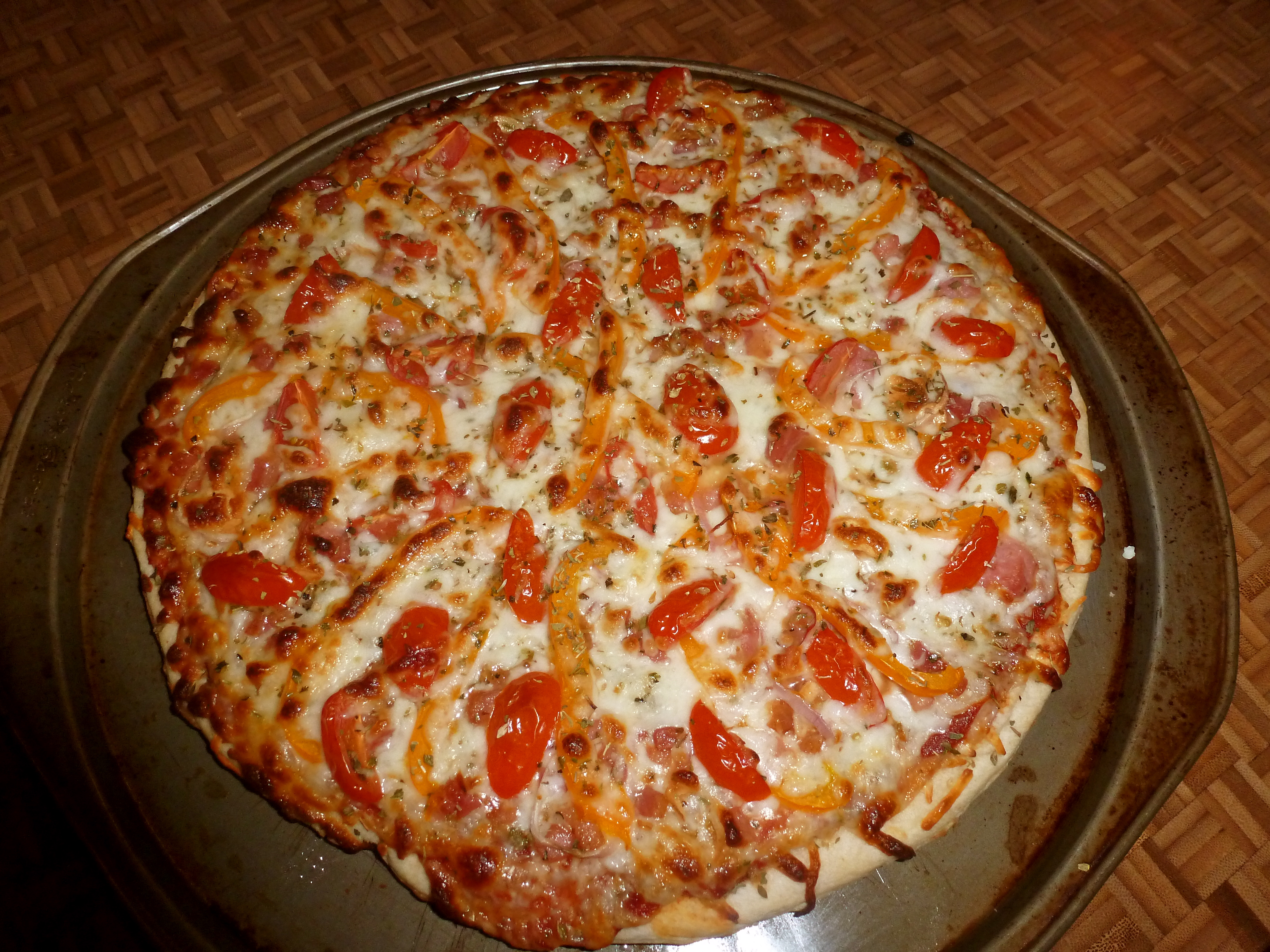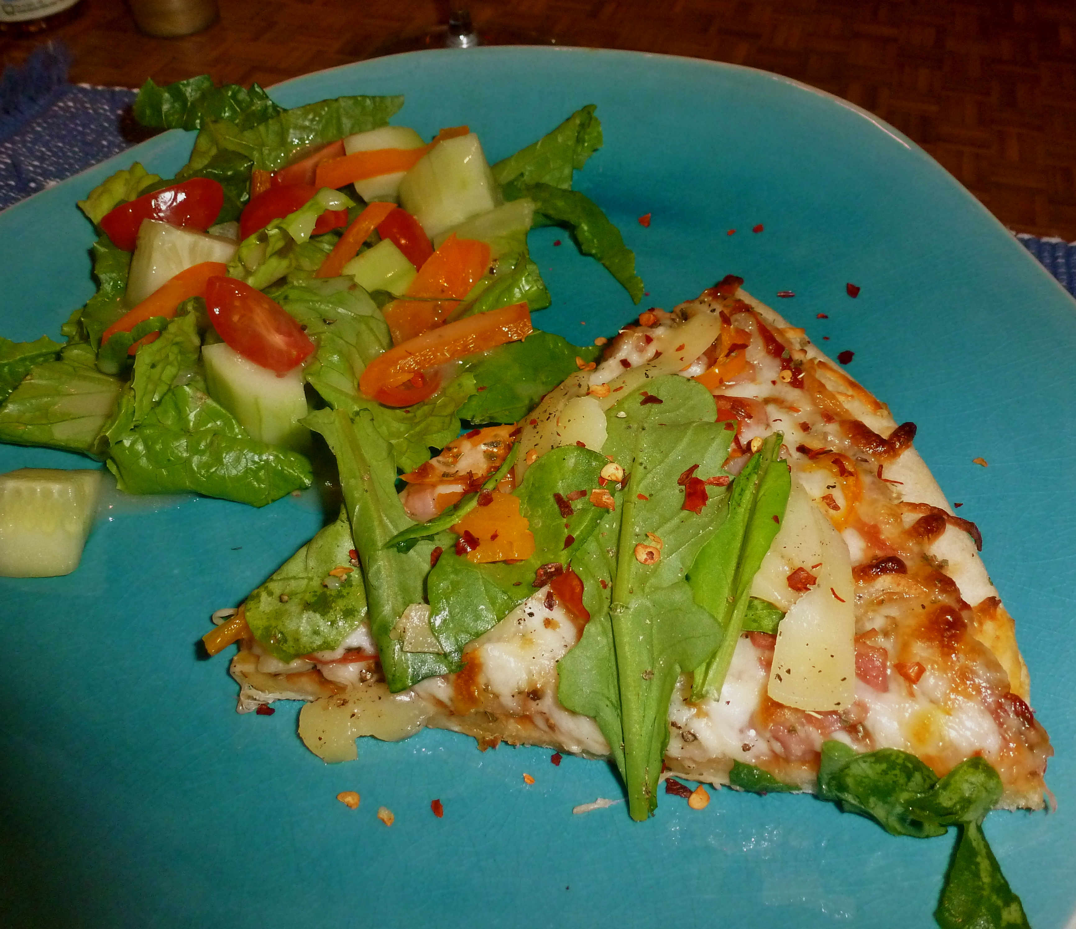 Tonight’s pizza had pancetta, garlic, orange pepper, shallot, tomato and mozzarella. I topped it with fresh arugula and shaved parmesan once it was baked and bubbly. (When the pancetta came out, I suddenly had a kitchen assistant. Shocking.) Foxglove Zinfandel was a perfect date for my slice.