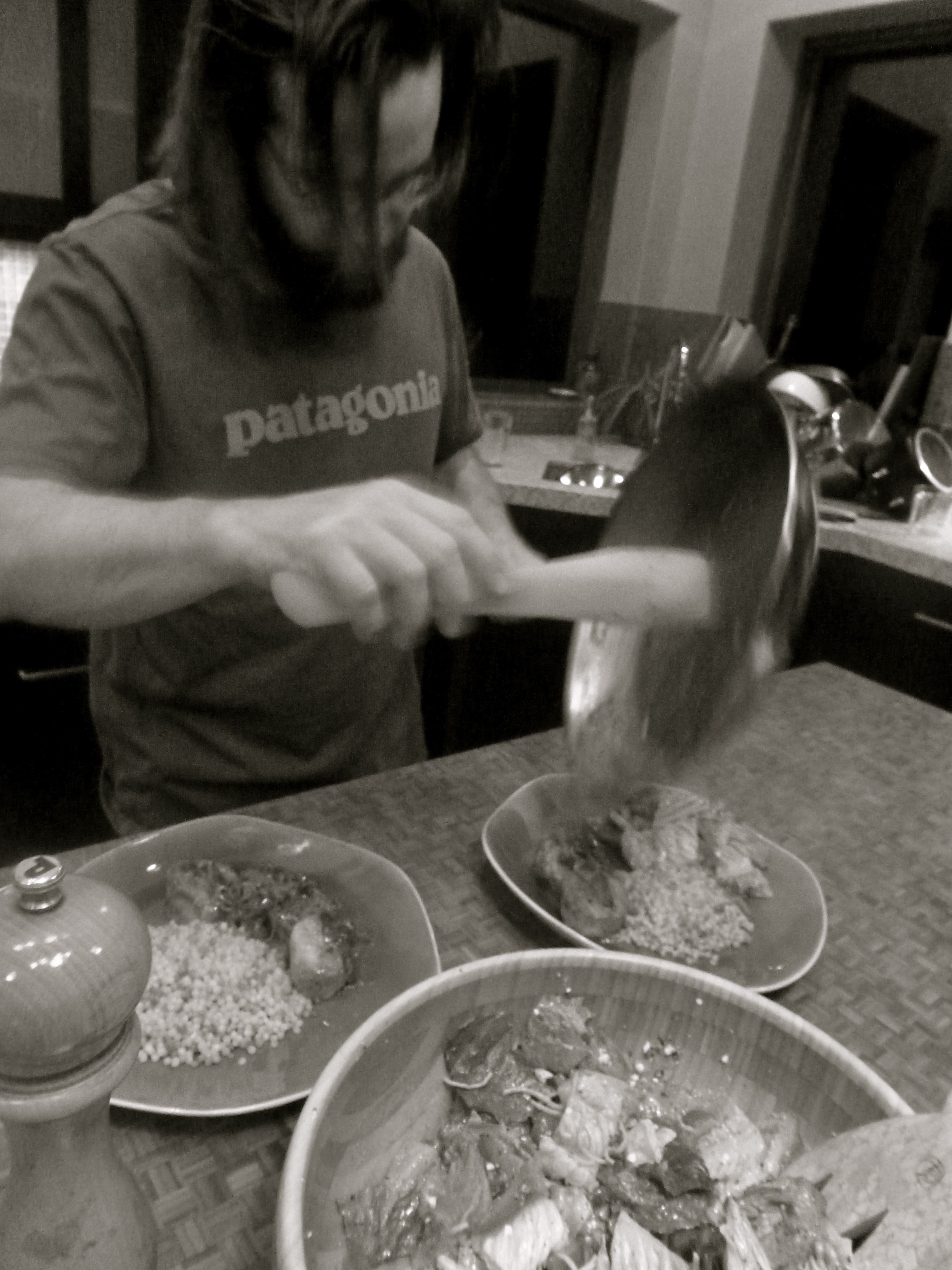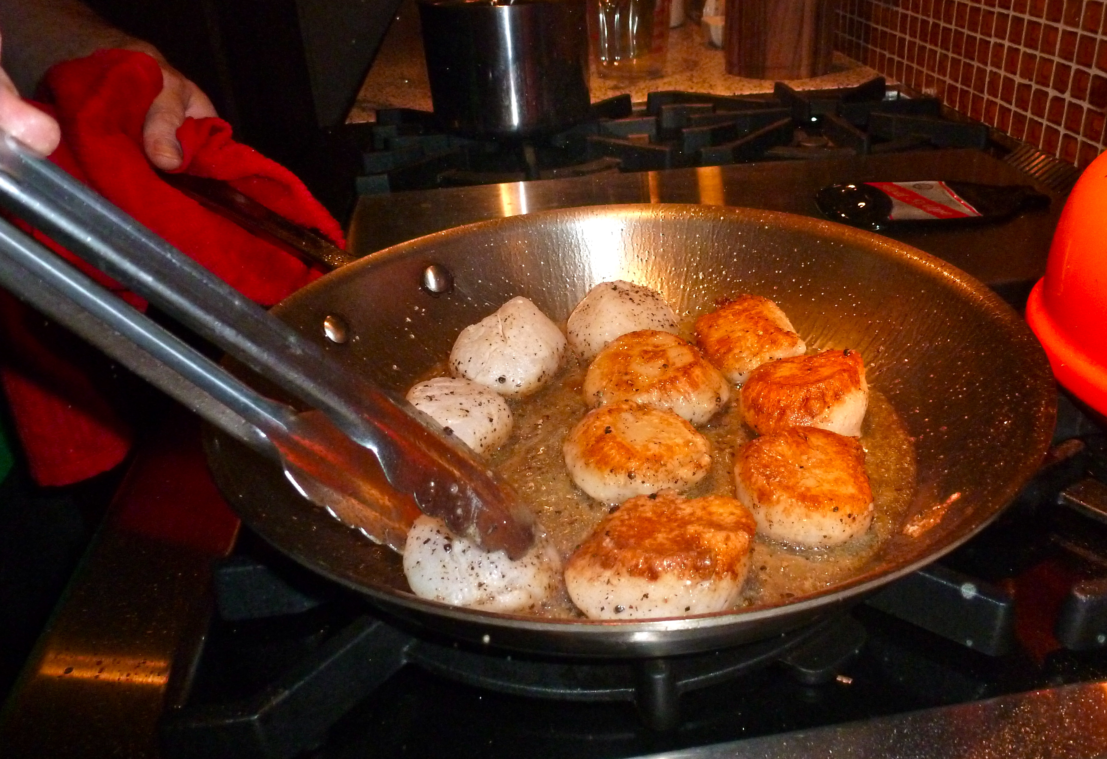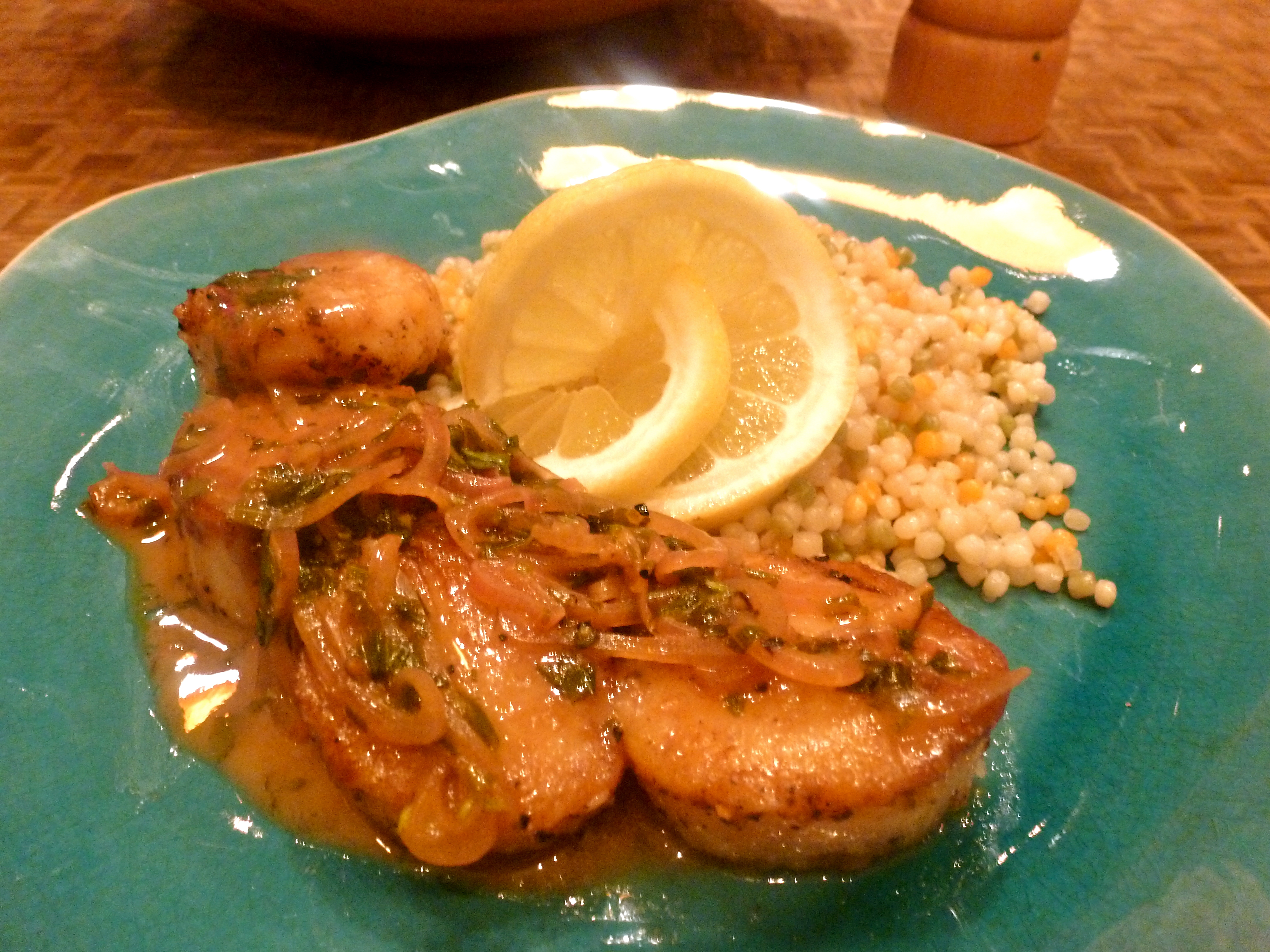 As if that wasn’t enough, Cholula and I played with new puppy toys while my handsome live-in chef created a delectable meal of seared scallops in a white wine, shallot and tarragon sauce over israeli cous cous.