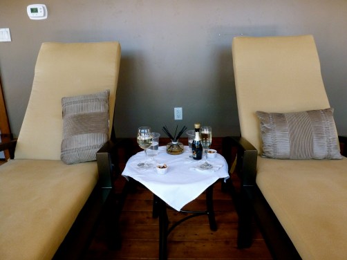 Champagne and wine, flowers on the tray, delectable sandwiches, dining in our robes with a view of the resort- it was quite luxurious and we hadn’t even had our treatments yet!