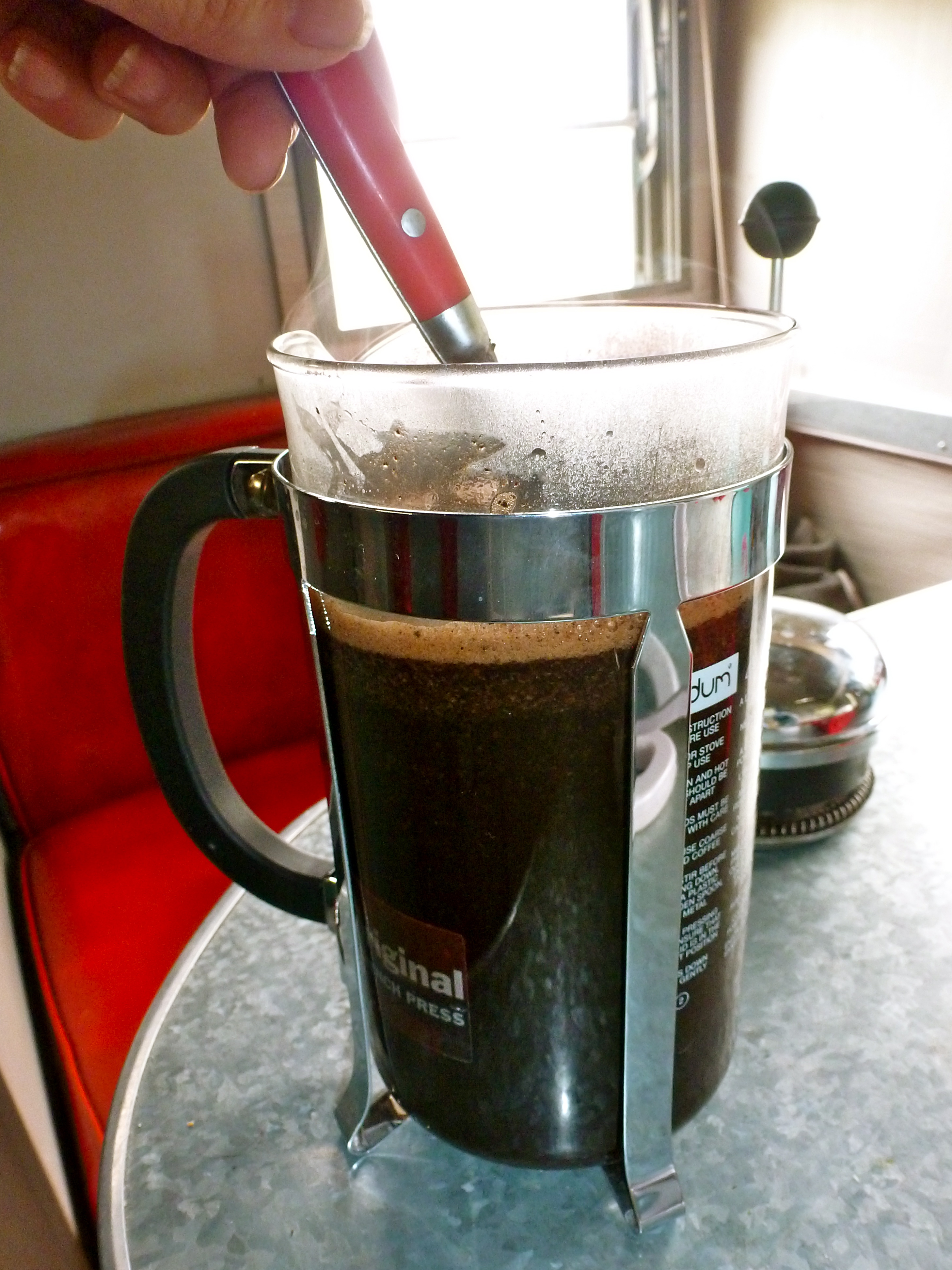 We slept late, taking advantage of the cloudy morning and extra furball providing warmth. French-pressed coffee is one of the great joys of camping for me. I sat in the sun, soaking in the view and playing ball with my happy hound, while John created something magical in the tiny kitchen.