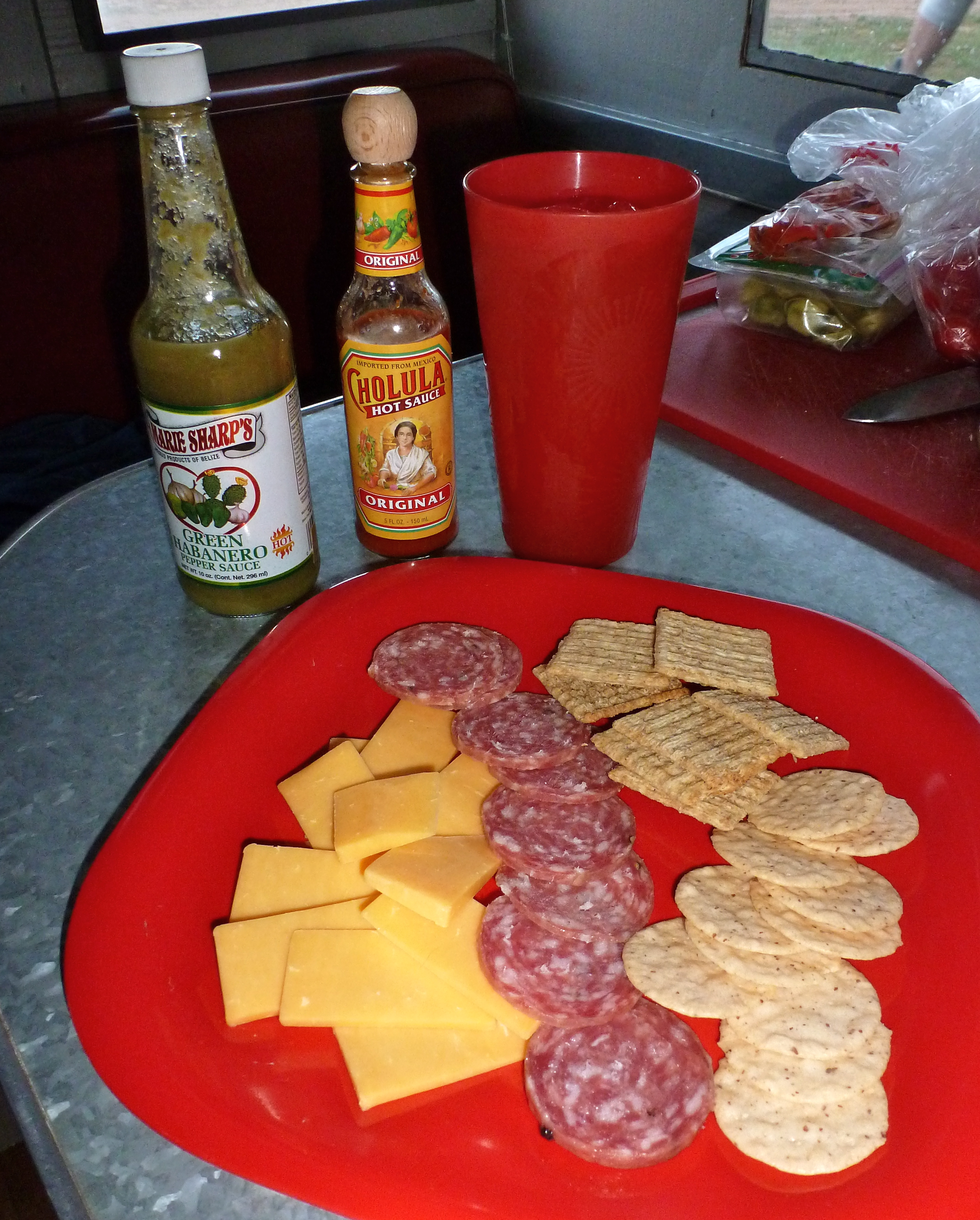 If there’s something John and I do well on the road, it’s FOOD. We both love to eat. We both love to cook. We don’t do the basic can of chili or burritos or pre-made burgers that are standard camp food. We eat just as well as when we’re home- sometimes better. This trip, we opted to keep it pretty simple: John’s gourmet cheeseburgers one night and a tortellini pasta dish with fresh veggies and grilled sausages the next. Cholula supervised while John got the fire going.
