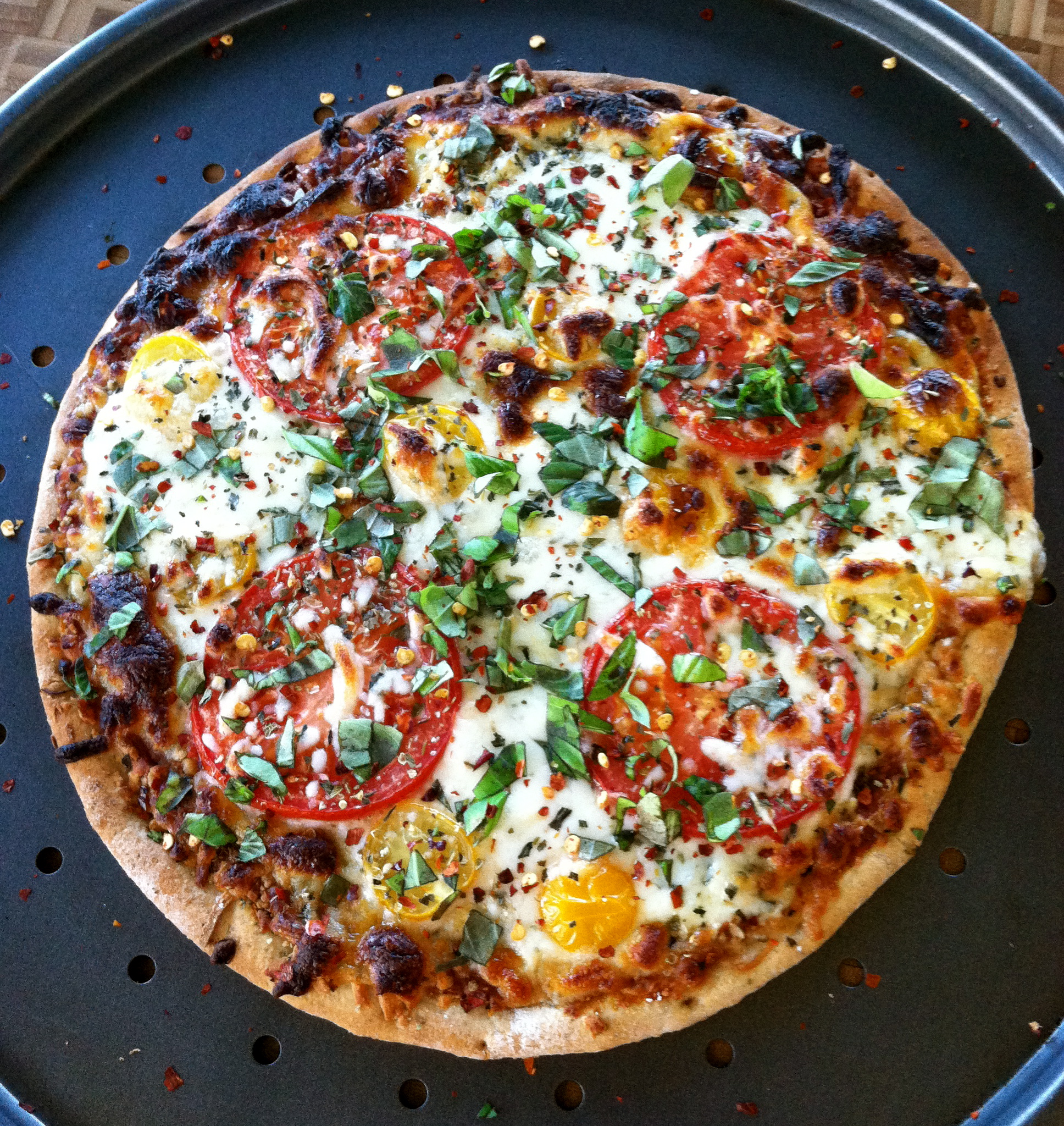Dinner and a movie was the plan. On the menu for Cholula was Lamb and Rice a la Eukanuba, which she nibbled delicately like a lady. I upgraded a Kashi pizza to ‘stay-in gourmet’ status by adding fresh ingredients (and keeping to my commitment to ‘Meatless Monday’).