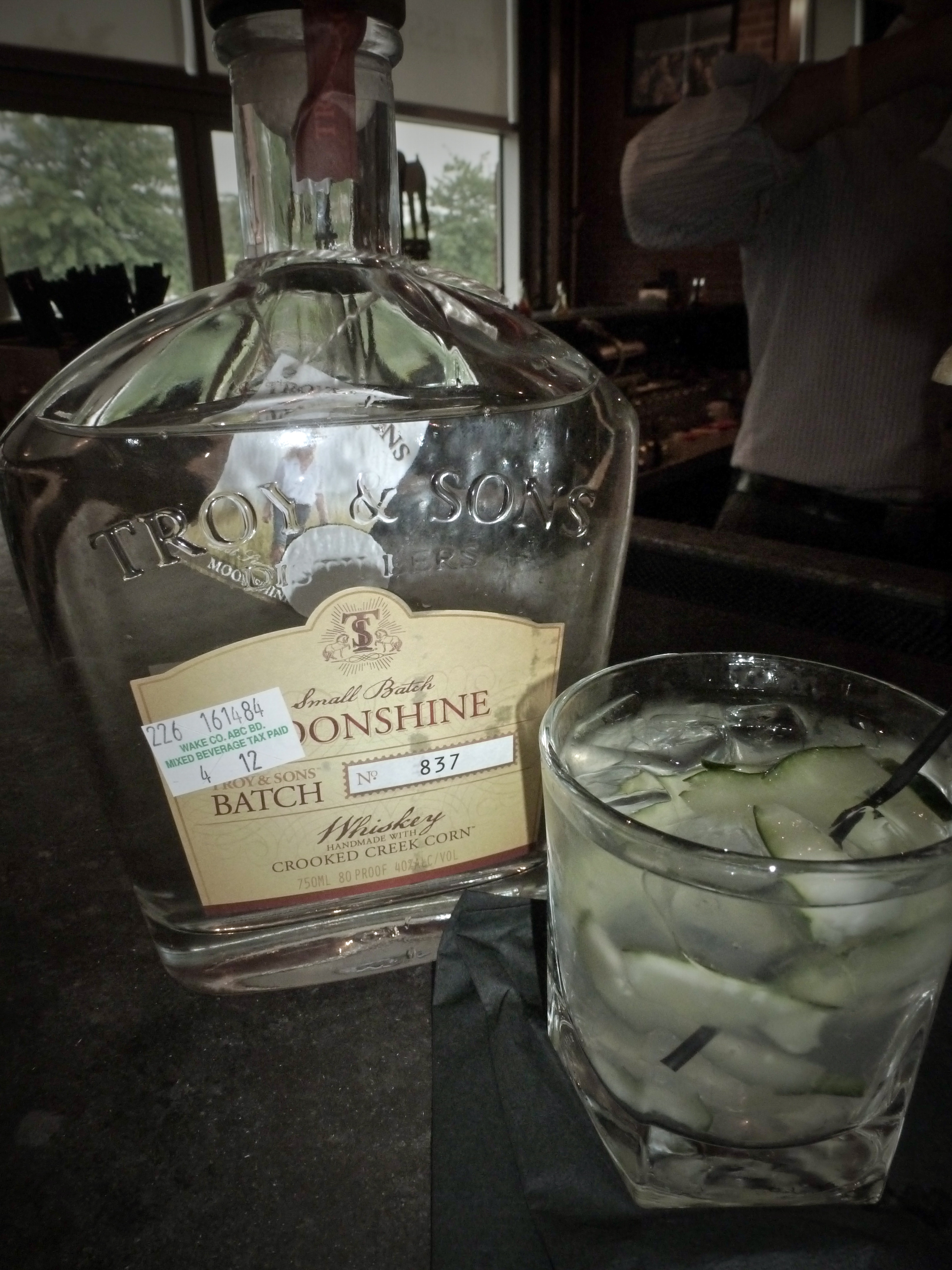 Being in a state that pours real drinks, I asked the bartender for a recommendation. He presented me with a muddled concoction of cucumber, simple syrup, and moonshine.