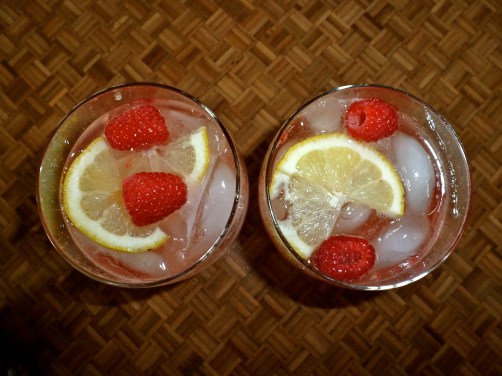 After adding the vodka (from High West Distillery), John poured the hot pink concoction into our glasses. I added the bubbly (Cava) and garnished our masterpieces with more raspberries and lemon.