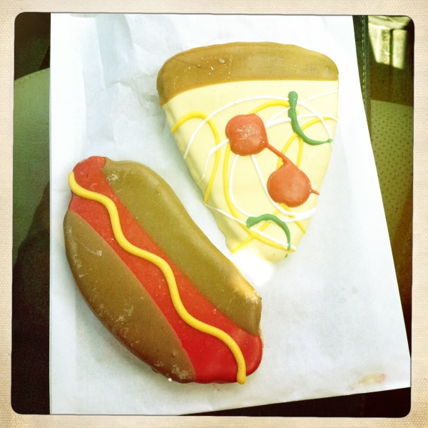 Puppy cookies! In the shape of HUMAN JUNK FOOD! There’s so much there to giggle about. Cholula was pretty into them (shocker). Note the nibbley teeth marks on the faux hot dog.