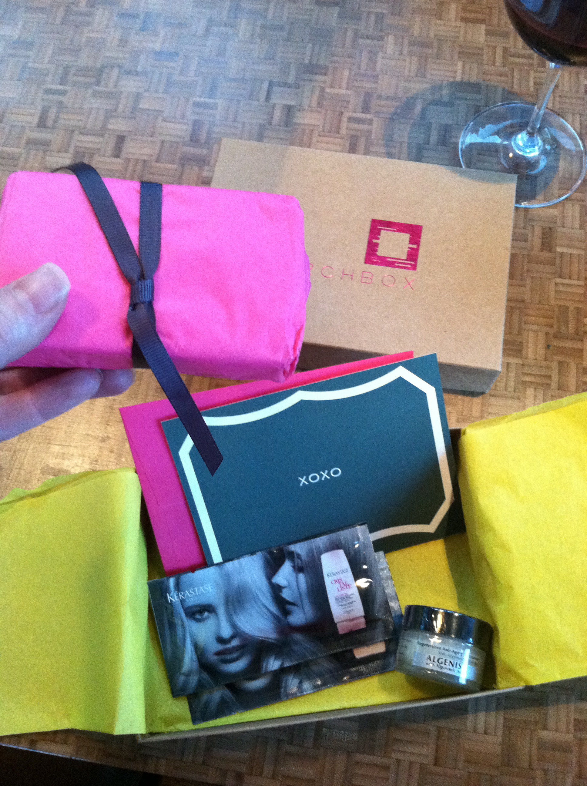 Last month, I learned about Birchbox randomly through one of my favorite blogs, Hungry Girl Por Vida. Well, the box for May arrived, filled with tiny product samples. I’m one of those people who stashes hotel shampoos and lotions and soaps, every time I stay somewhere (I have a large drawer full of them). So this is super fun! Plus, who wouldn’t love to get a beautifully wrapped box of girlie treats? Mini-Christmas! Eeeee!