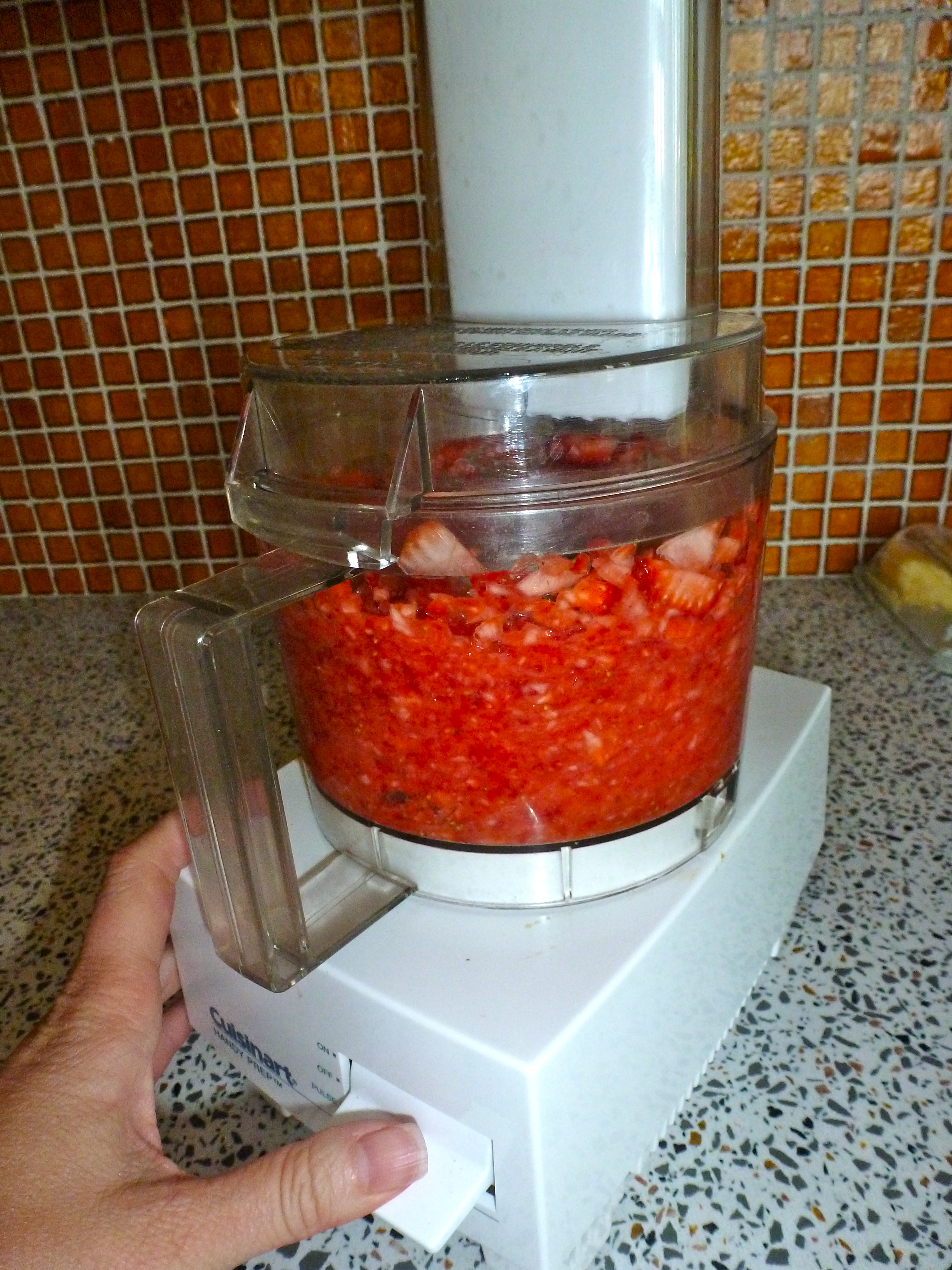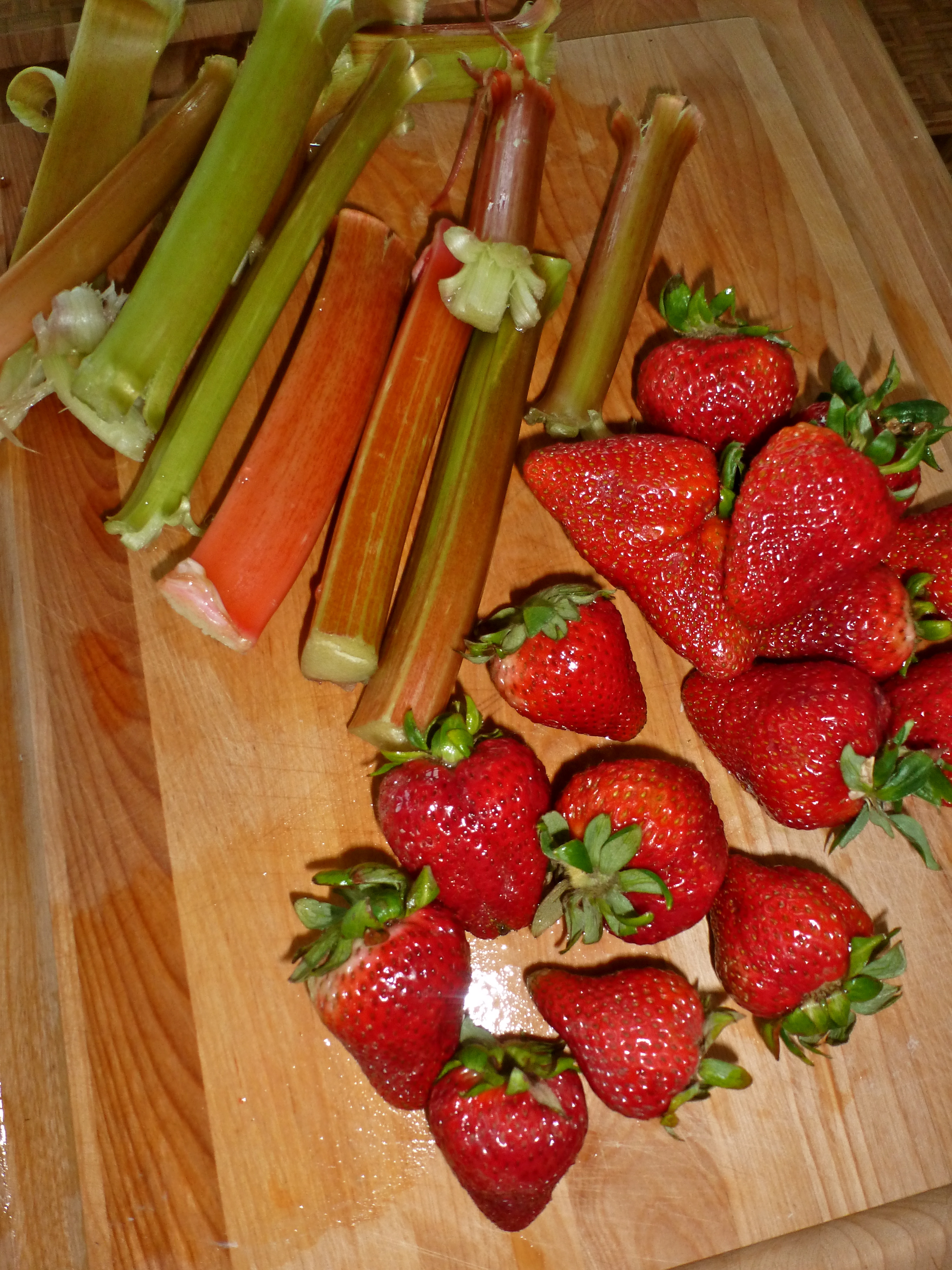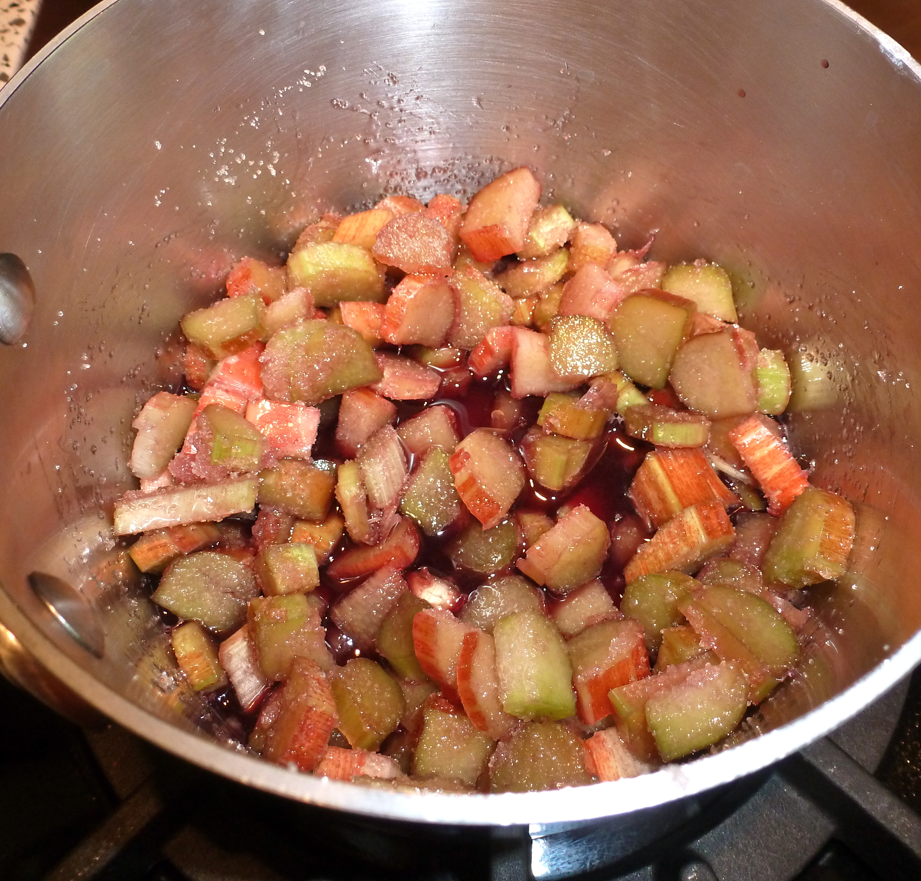 I started on the fruit. I simmered chopped rhubarb with wine and sugar as directed, then blended it with chopped strawberries. The fuchsia color brightened the kitchen and it tasted yummy. After straining it through a sieve, this step was complete. So far, so good.