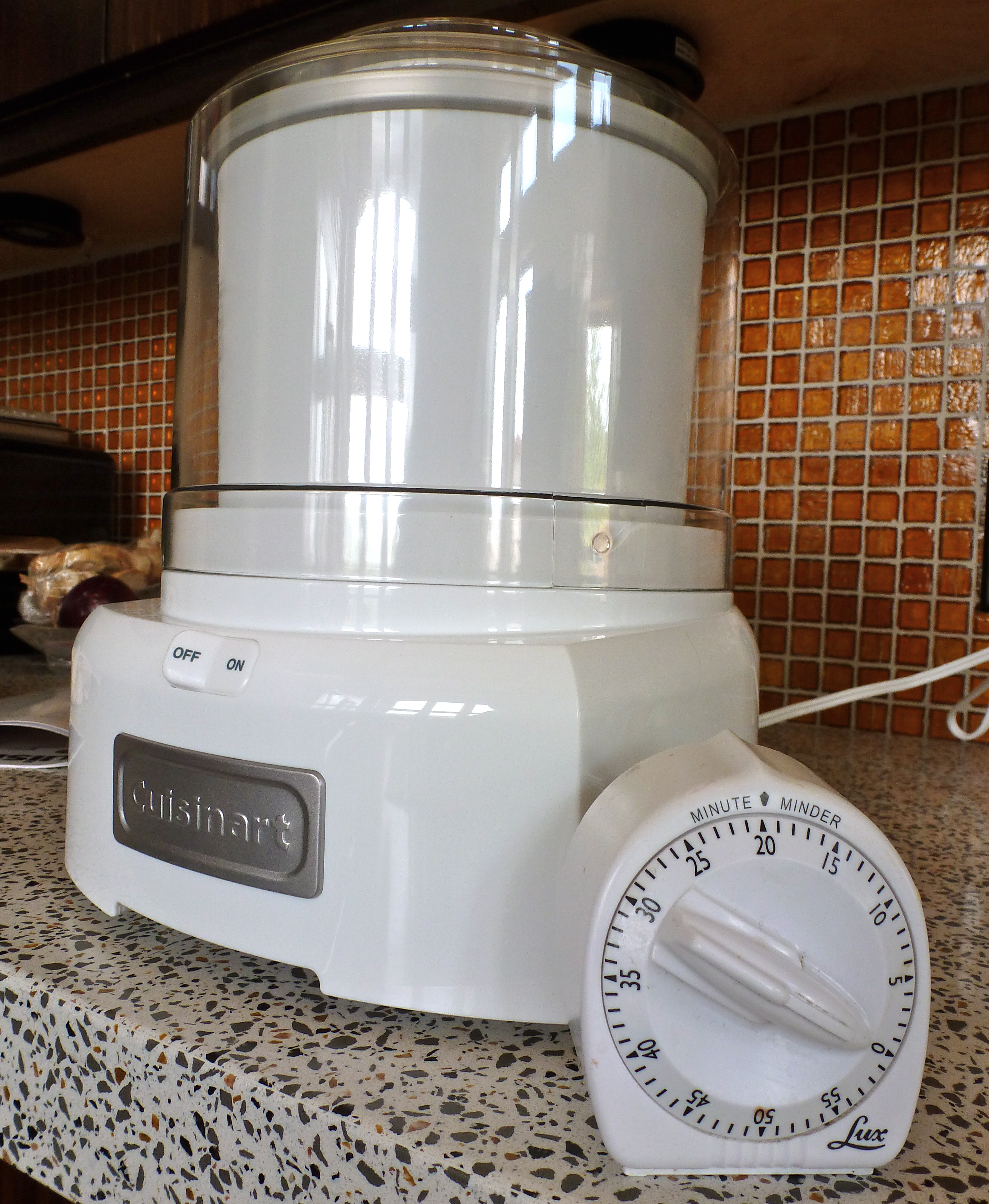 I picked up the ingredients, got my kitchen all situated, and pulled the ice cream maker down from the top shelf in the pantry. It was a housewarming gift from one of my best friends and her hubby, and it was still in the box. As I unpacked it, I was flooded with memories of my childhood when we’d have homemade ice cream at my grandparents’ house. Fresh peach was a favorite flavor. I remember the whir-whir-whir of the electric version, but even before that, we kids took turns helping my Grandpa turn the crank or pour ice and salt around the wooden container. When I pulled out the Cuisinart machine, it looked nothing like what I remembered. Hmm.