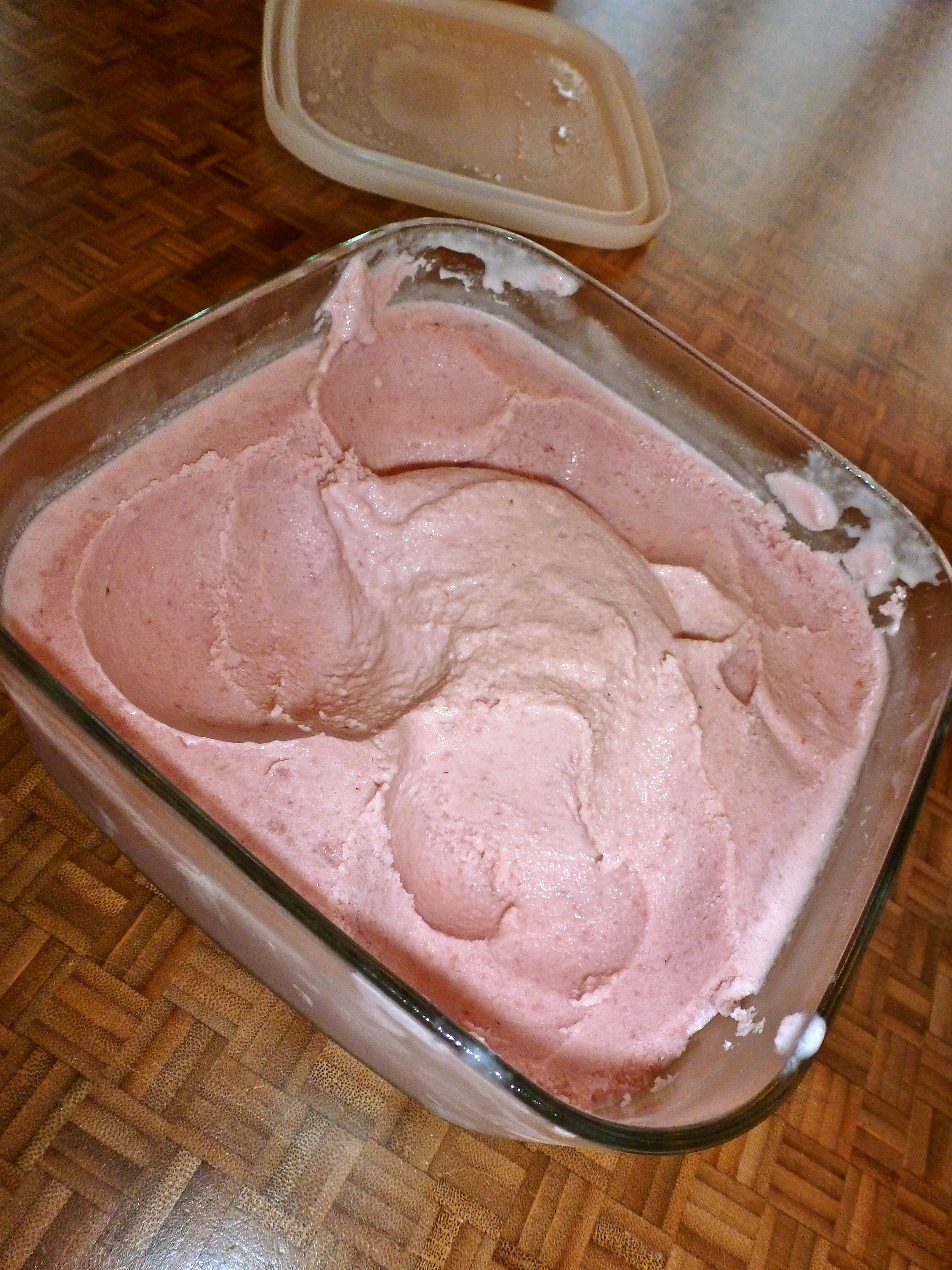 After it cooled, I mixed in the rhubarb-strawberry mixture and got the thumbs up from my taste-tester. (Let me translate the look on his face: “Mmmmm!”) I must be doing something right.