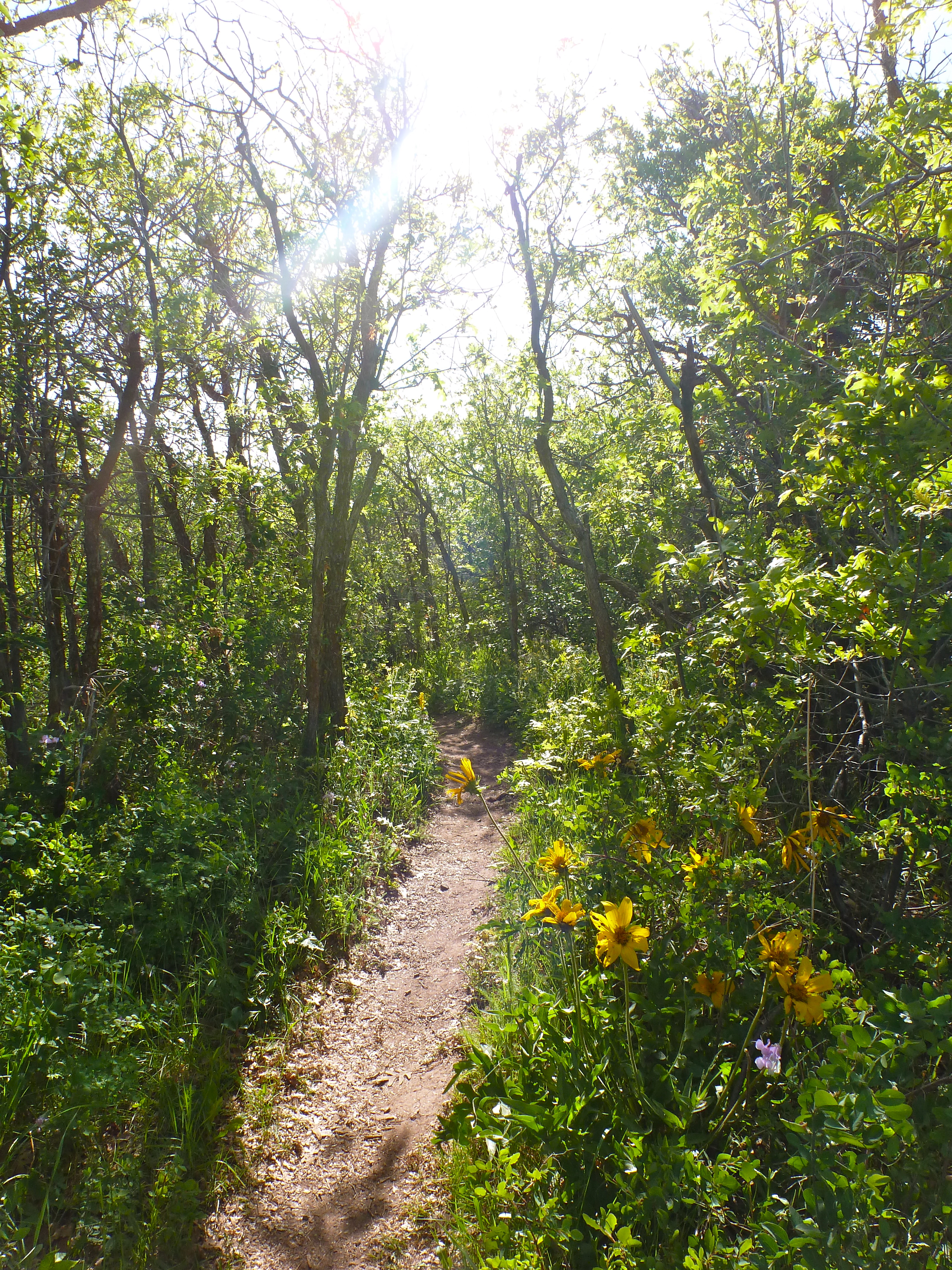 We climbed a bit higher than the last time we explored this trail, and were rewarded. With each step, the types of flowers would change. There was wild sweet pea everywhere. The trail led us through tree-shaded tunnels or to sun-kissed rocky overlooks. I felt miles away from home, though I could actually SEE home on the far hillside.