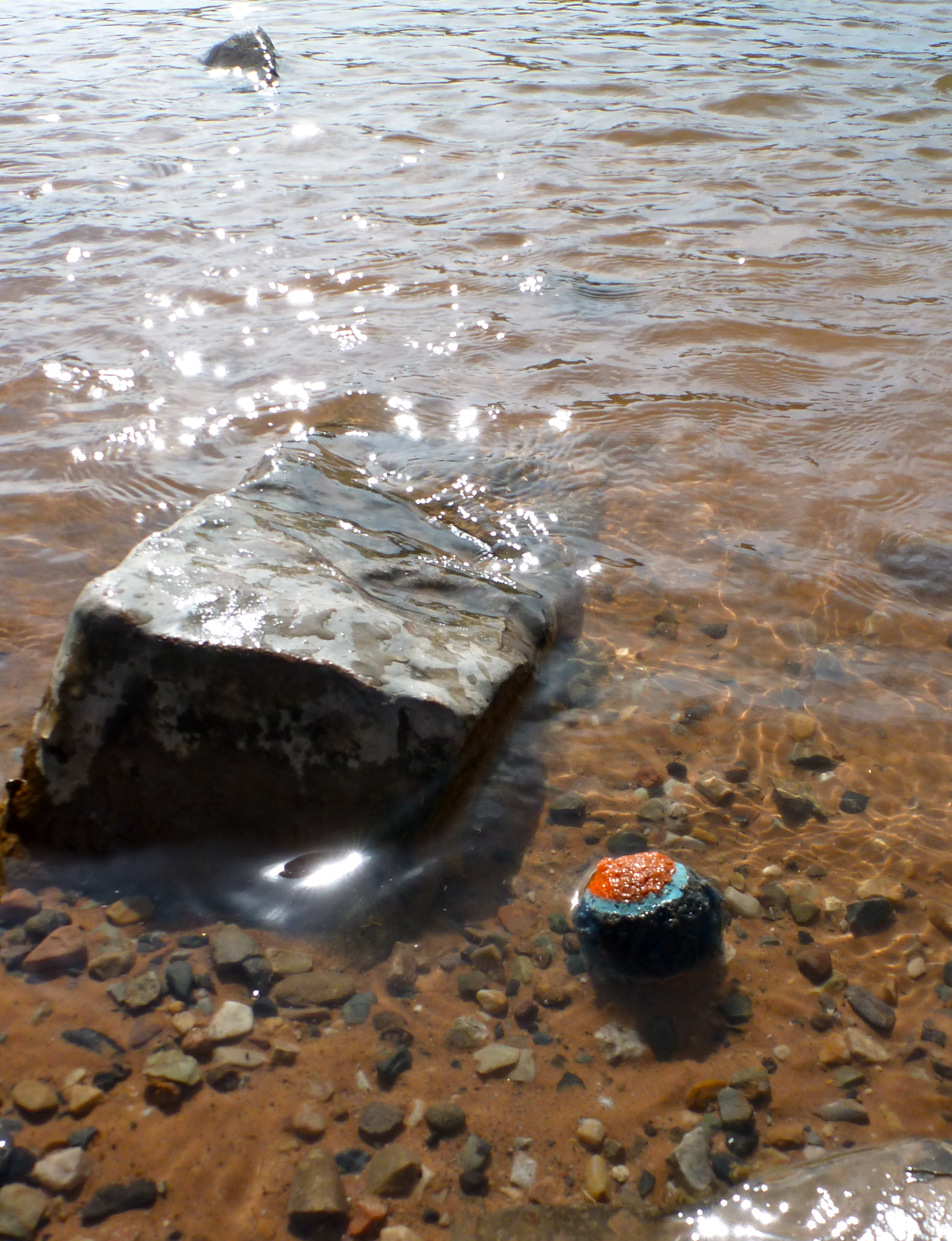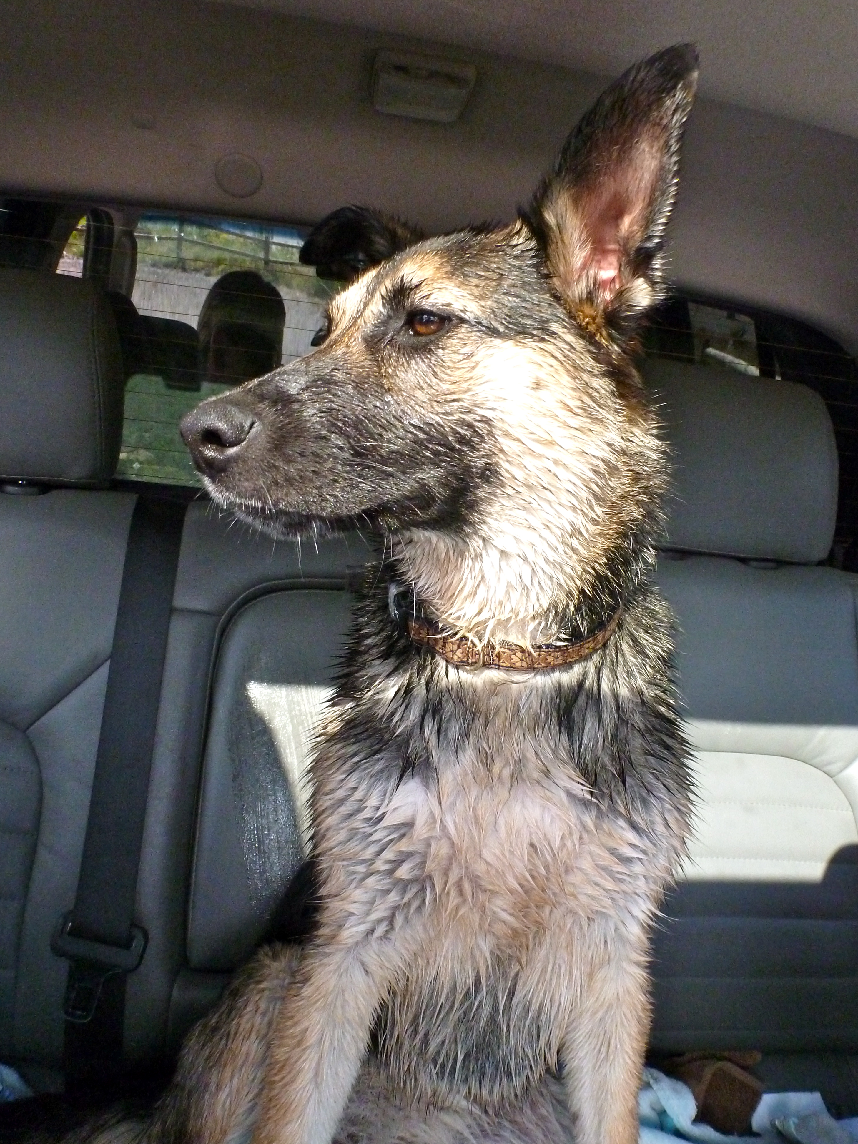 We almost got her to swim after her ball at one point. Still too timid to dive in after it, she splashed around the shore , chased birds, wagged her tail a lot. When we got into the truck to head home, she seemed content.