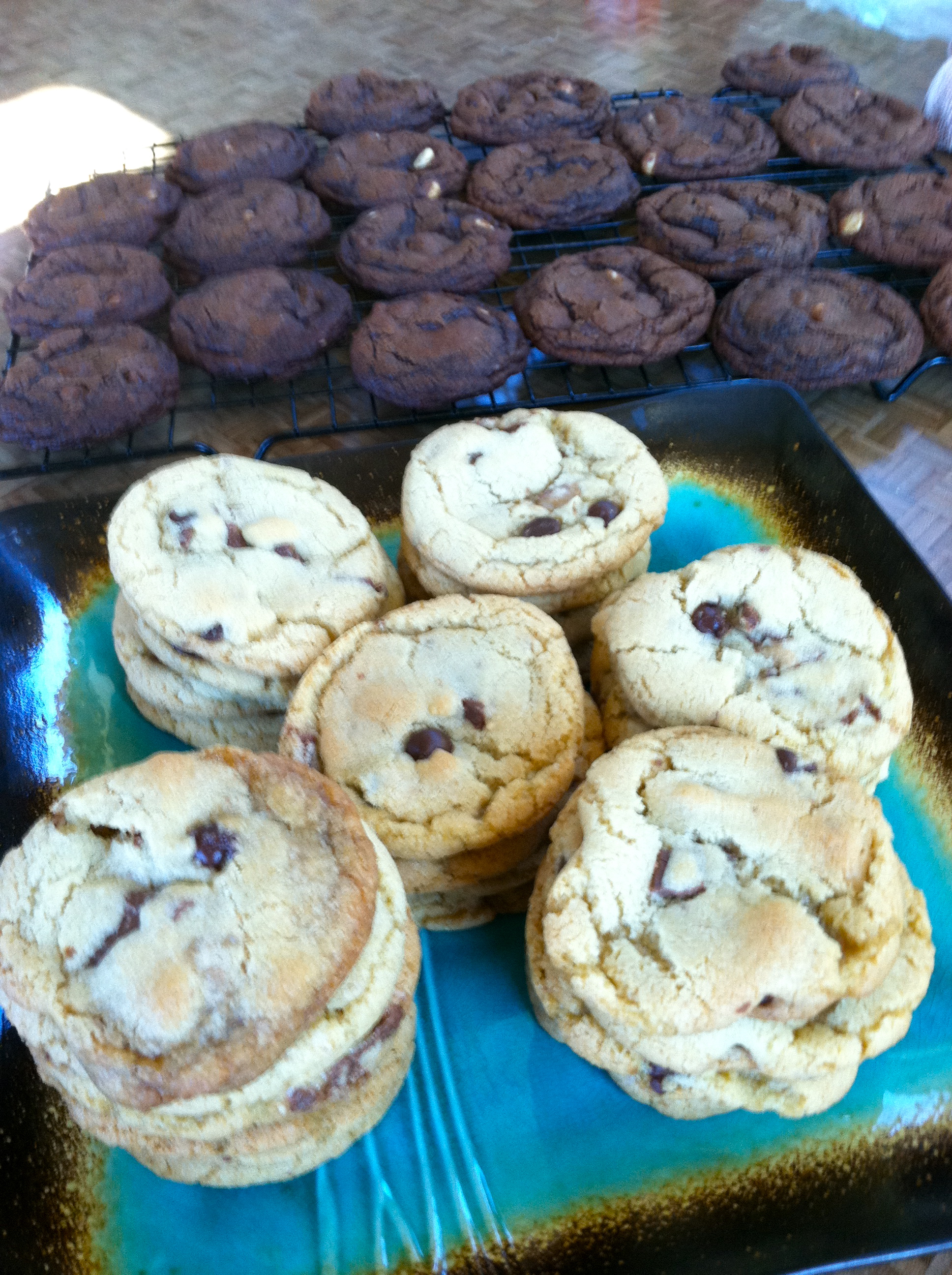 Party Day! I got up early (gag) and got to work. I was so focused, that I had a batch of cookies in the oven before I had a cup of coffee in my hand. (This frightened John.) In between baking espresso chocolate chunk cookies and chocolate chip toffee cookies, I decorated the pies.