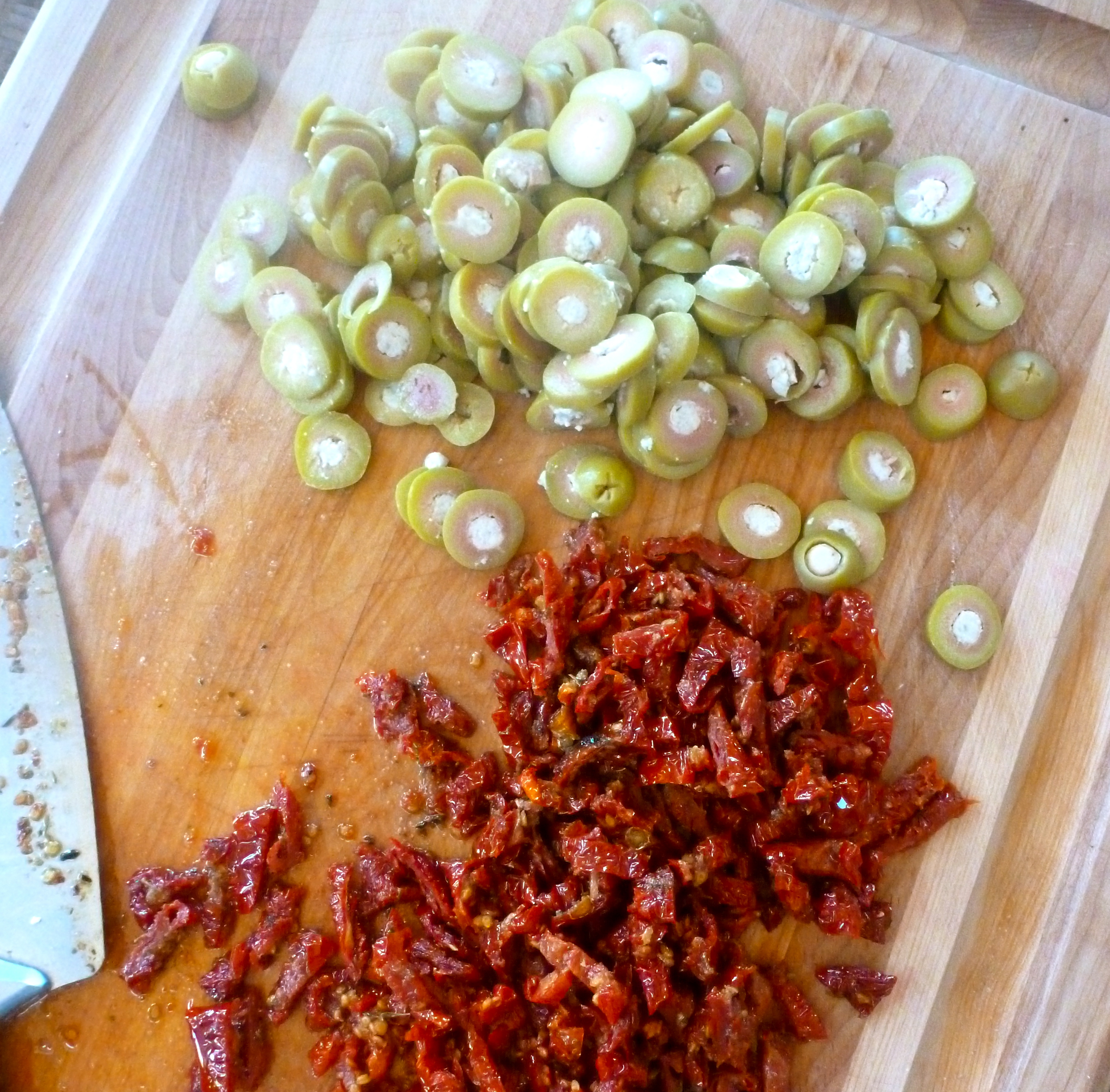 • Kalamata or green olives, sliced (I used the pre-pitted ones and this time, feta-stuffed)
