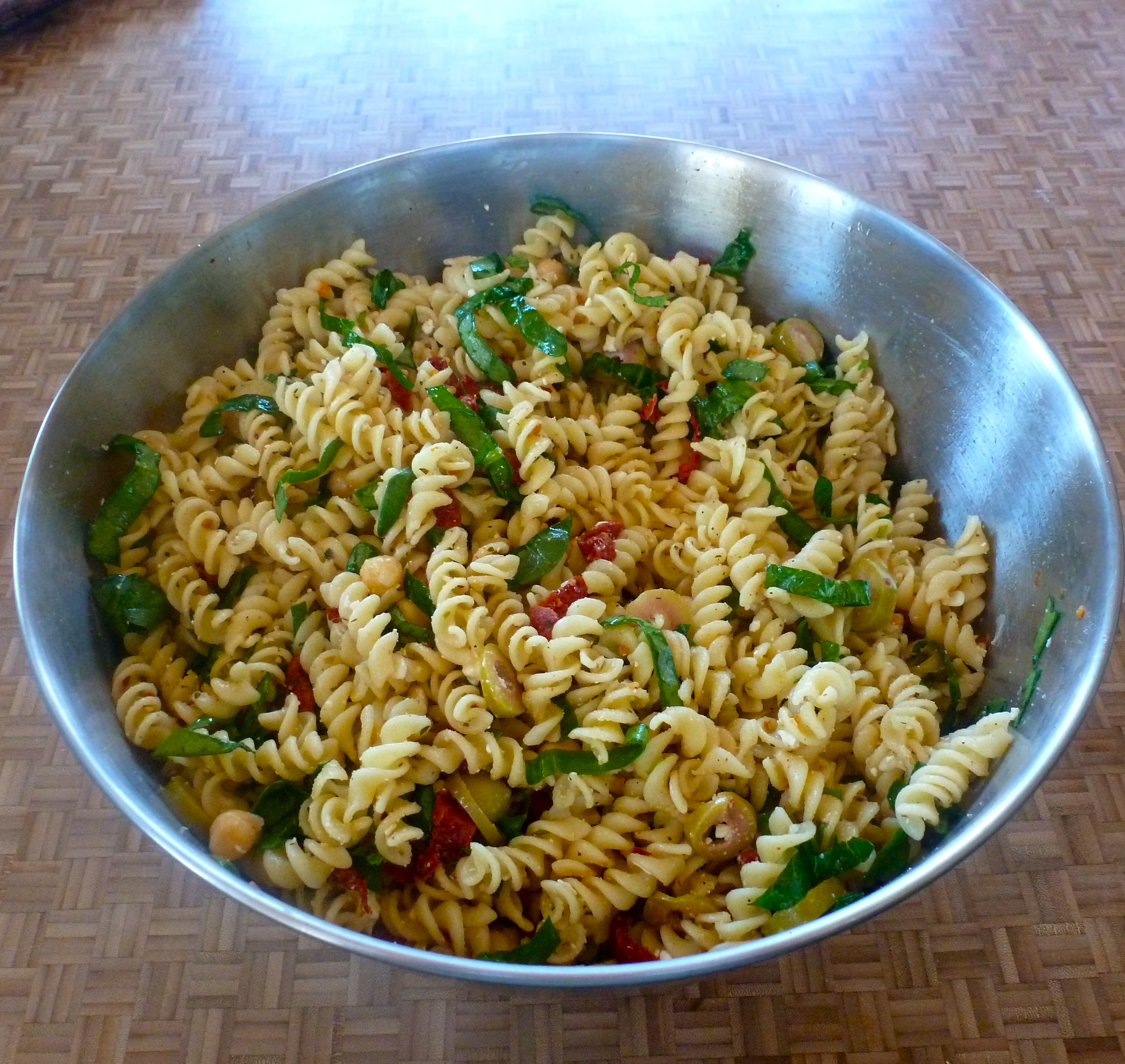 This pasta is easy, yummy, and can be served hot OR cold. I like to use pasta with shapes, like fusilli (corkscrew). Once the pasta is boiled, you simply stir in the prepped ingredients. They are: