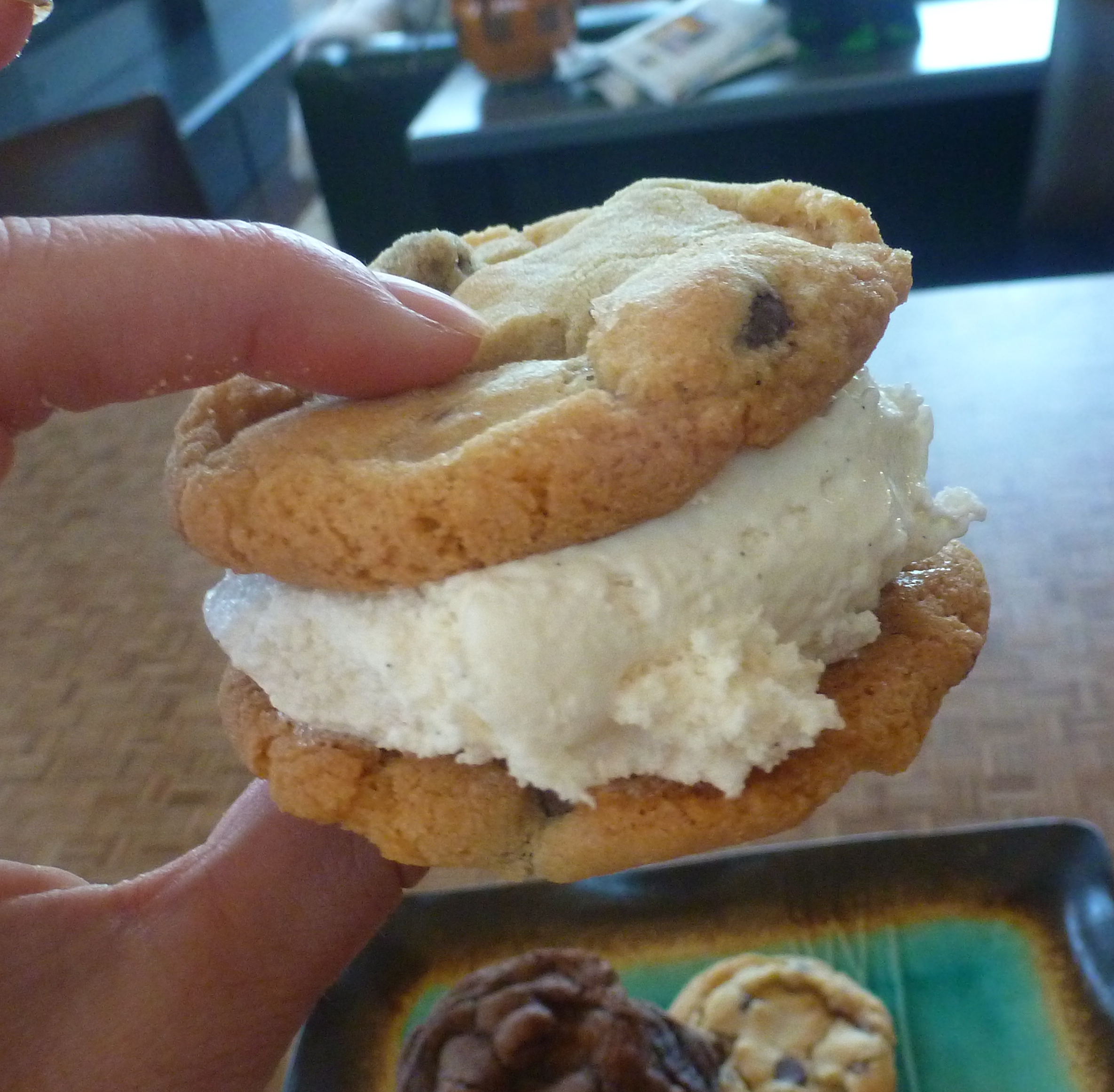 Yum, right?! I used to make larger cookies which meant bigger sammies, but I always ended up cutting them in half. I believe the espresso chocolate chunk cookies with the sea salted caramel ice cream was the combination of choice this time. (Drool.)