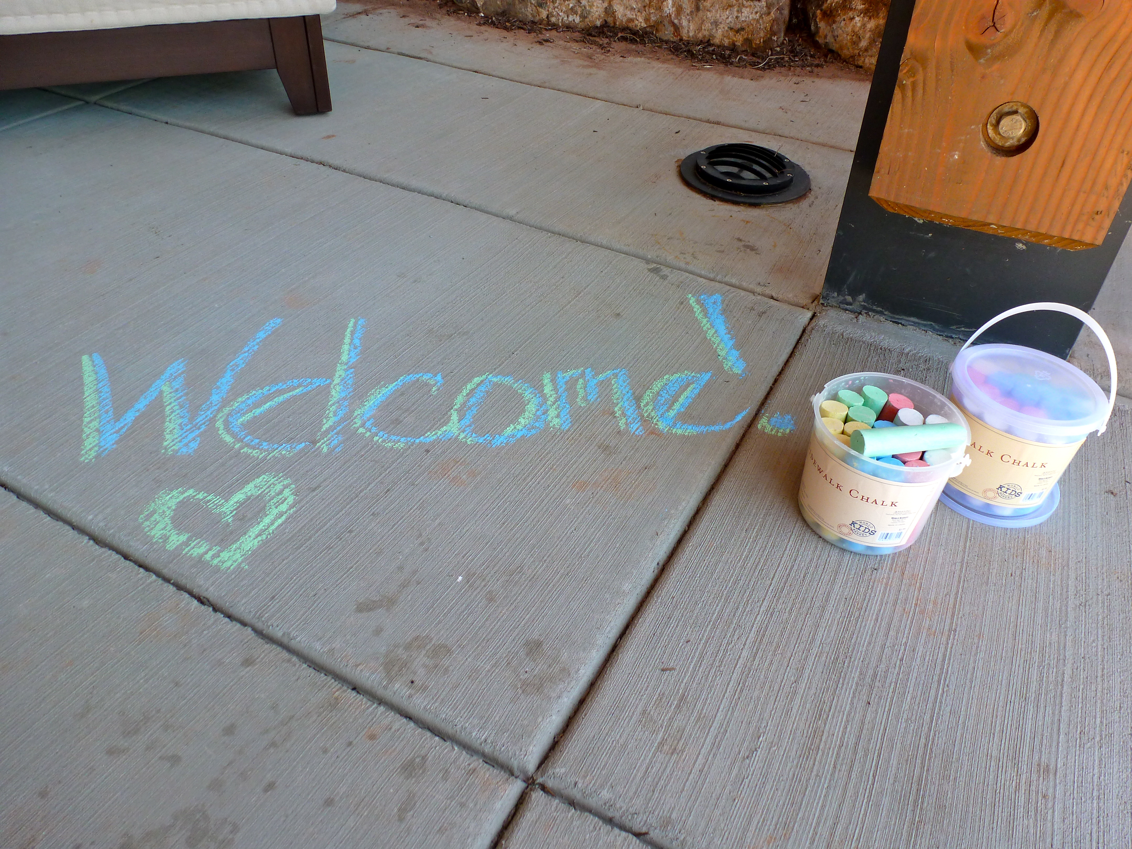 I spent a little time making sure the house was prepped for the fiesta. For the kids, I picked up some sidewalk chalk. How fun! Despite the lack of landscaping just yet, we had plenty of seating out back, in front, and lots of space inside.