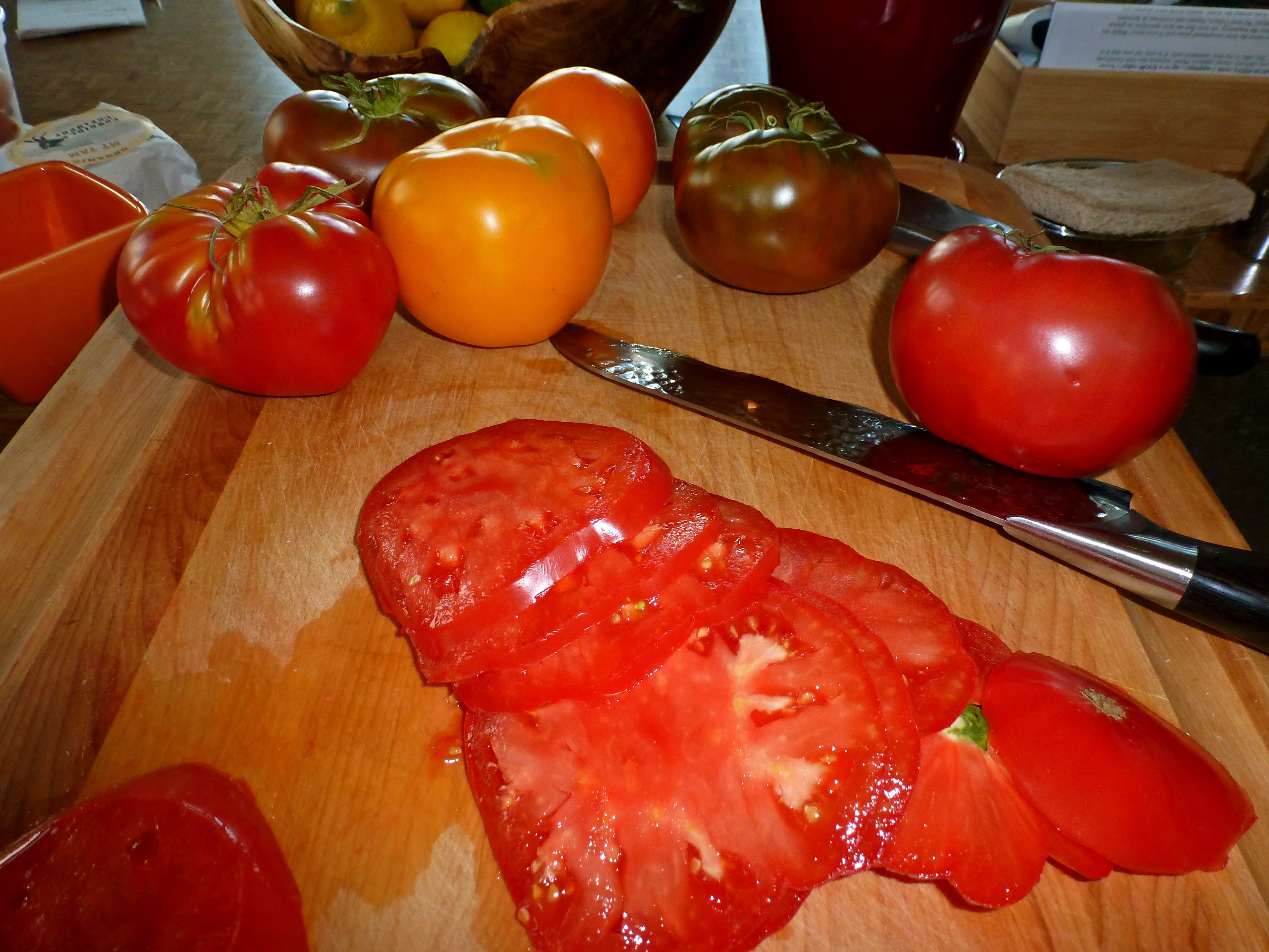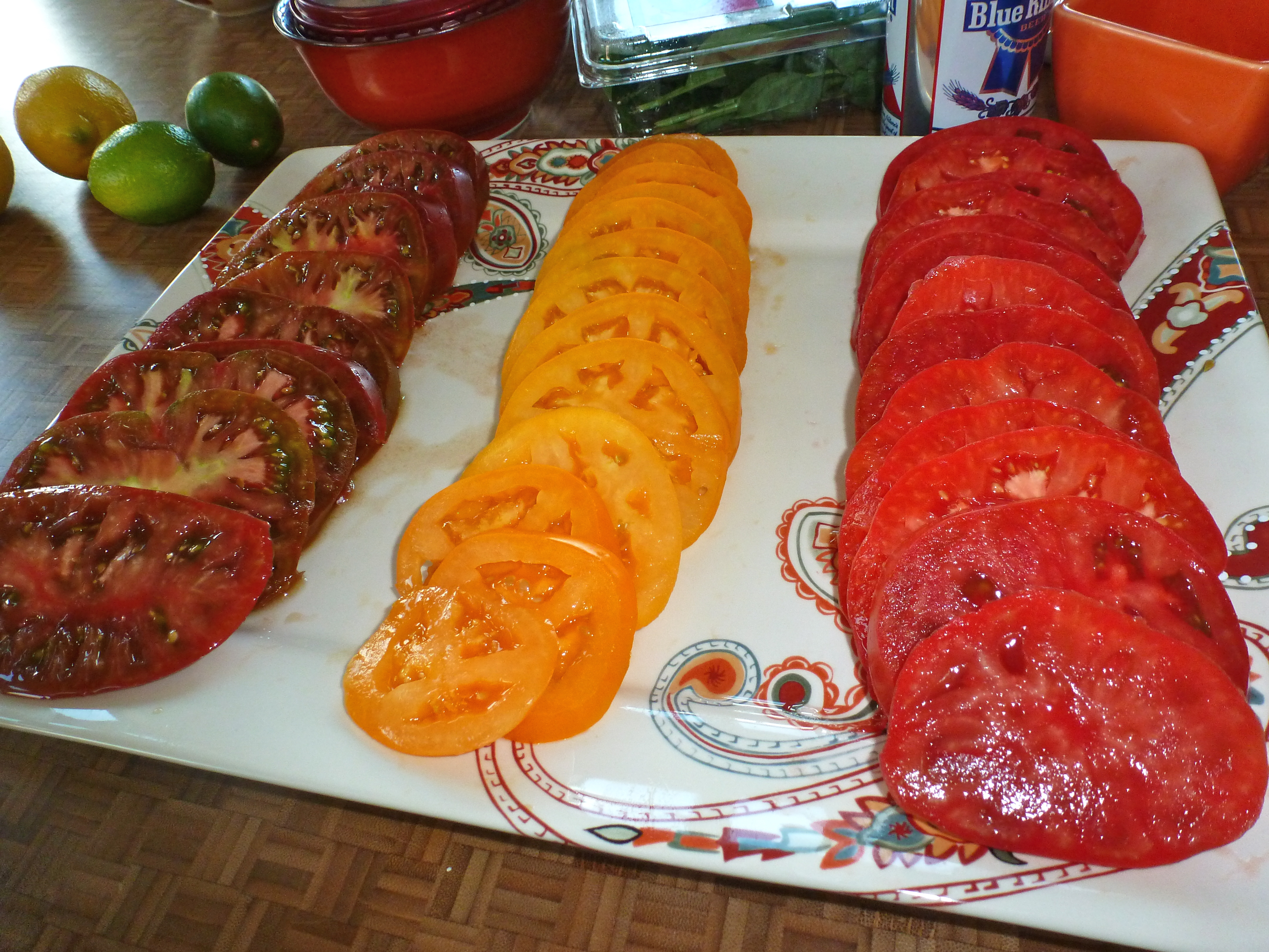 I prepped all of the appetizers and sliced up the caprese salad components- heirloom tomatoes, fresh mozzarella, and basil leaves. A drizzle of olive oil, some balsamic vinegar, a little cracked pepper…Summer on a plate!