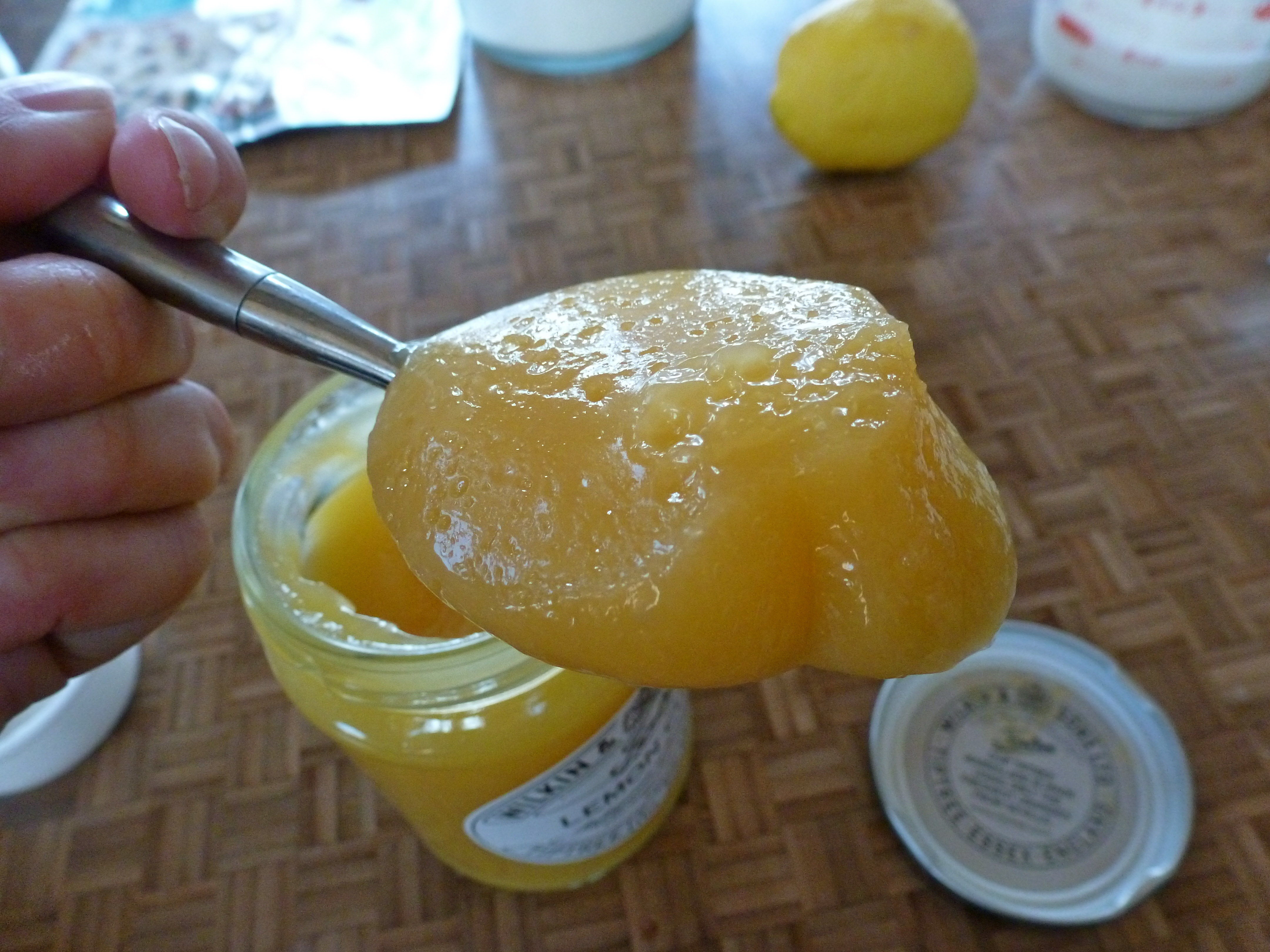 It was time for the newcomer in my kitchen. A peek in the jar showed a golden jelly consistency, and a dip with my finger proved that yes, it tasted kind of like a lemon version of my pie. Which means yummy. Those tricky Brits.