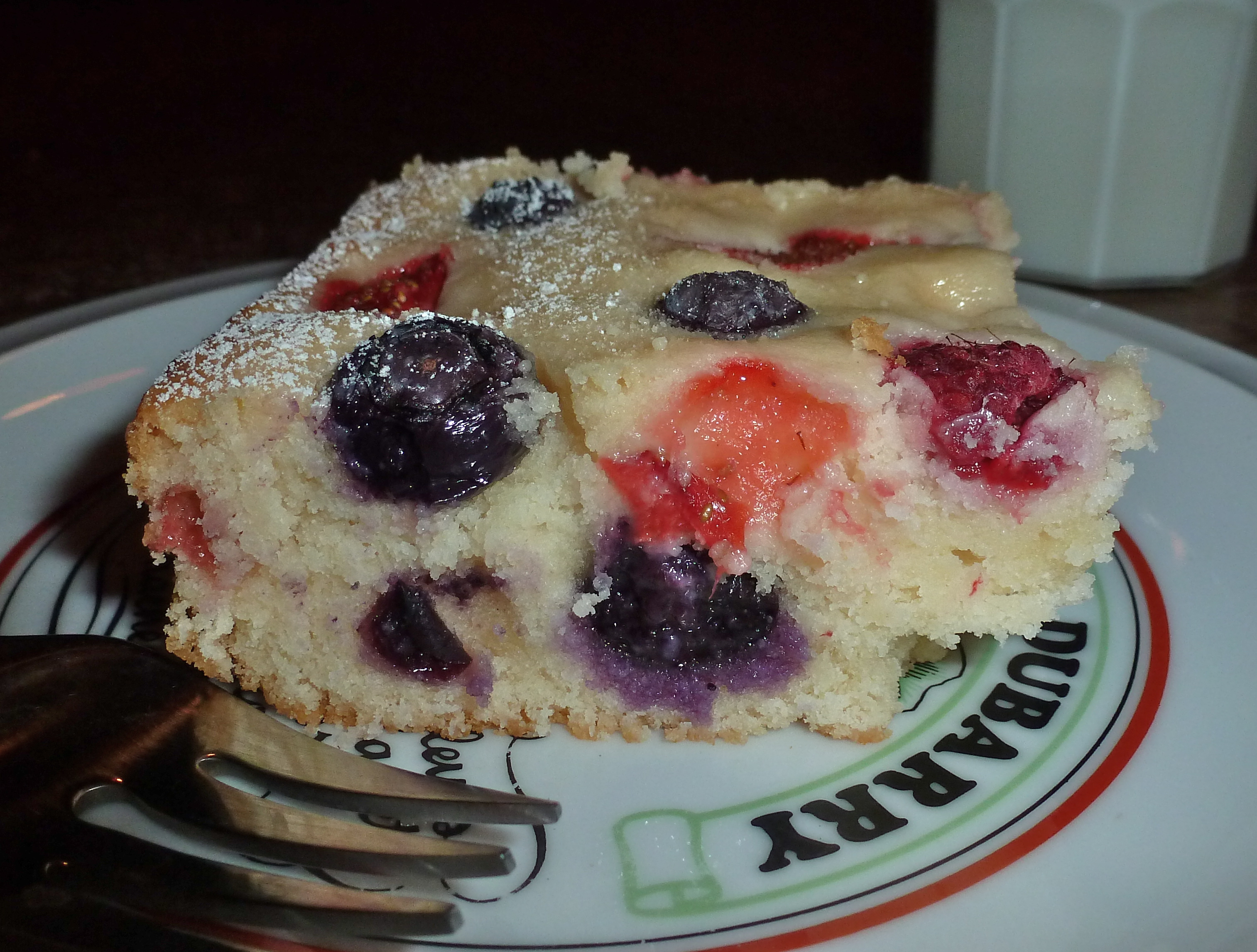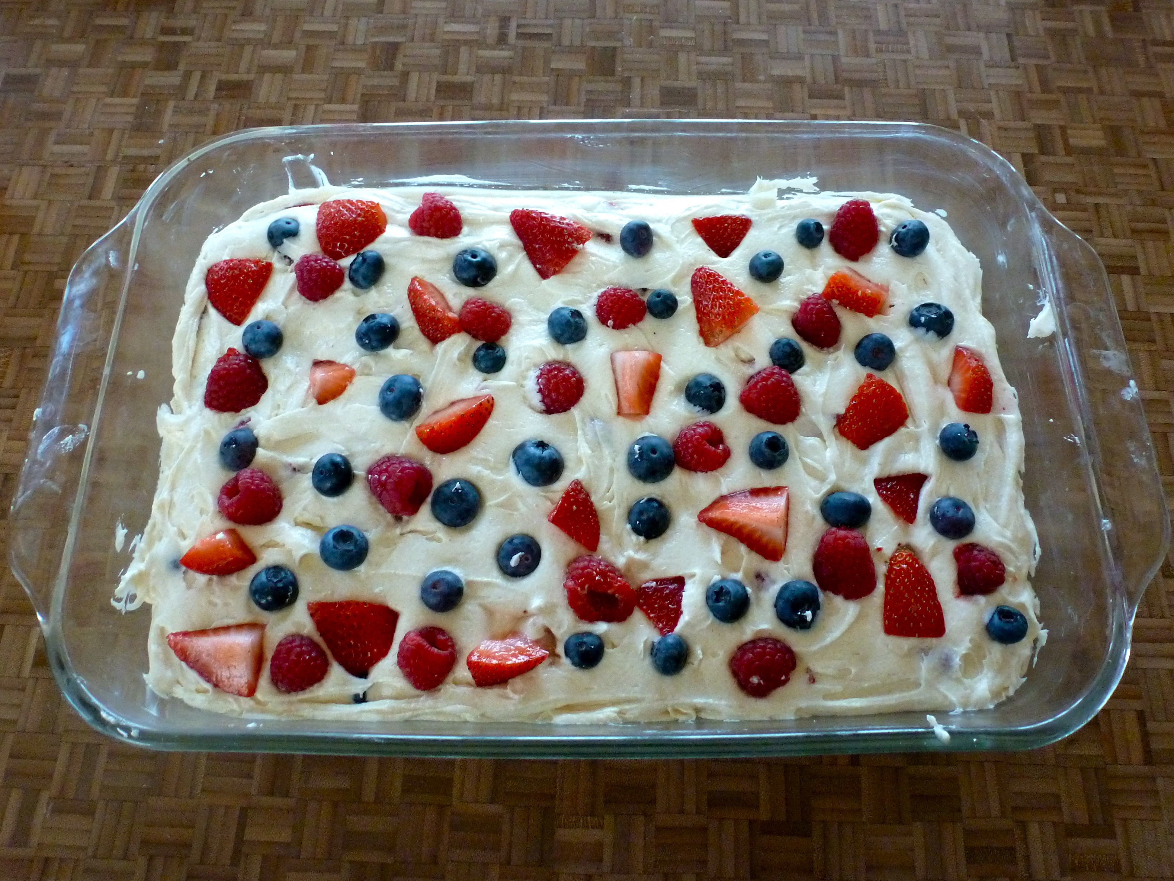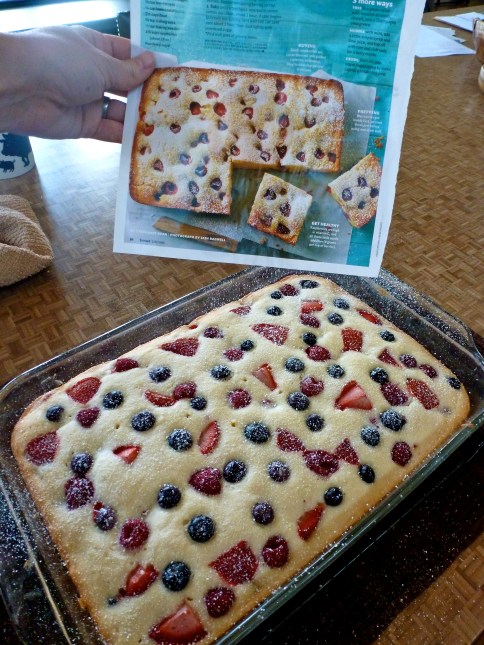 The recipe called for 4 pints of raspberries. I didn’t have enough, but I did have blueberries and strawberries that I didn’t want to waste. Tri-berry cake it is! Half of the batter went into the buttered pan, and then I sprinkled half of the fruit in.