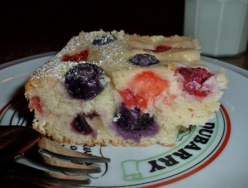 A tentative bite of my fruit-filled yellow lemony cake was sweet, tart, and delicious. The consistency wasn’t light and fluffy, that’s true. It was more like a pudding cake, a tad denser and moister than the norm. But maybe the addition of the lemon curd and yogurt was supposed to have that effect! I won’t know until I make it again.