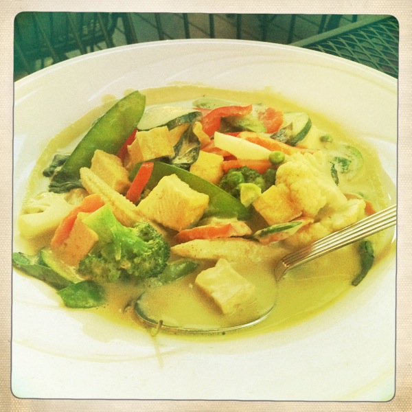 We shared two dinner options- pad thai with shrimp and green curry with veggies and tofu. Both were delish, and we chatted away as the stars began to come out above us. People strolled by, some with European accents, some marveling at my salmon-colored beverage. The kitchen was as slow as a snail, but the service made up for it.