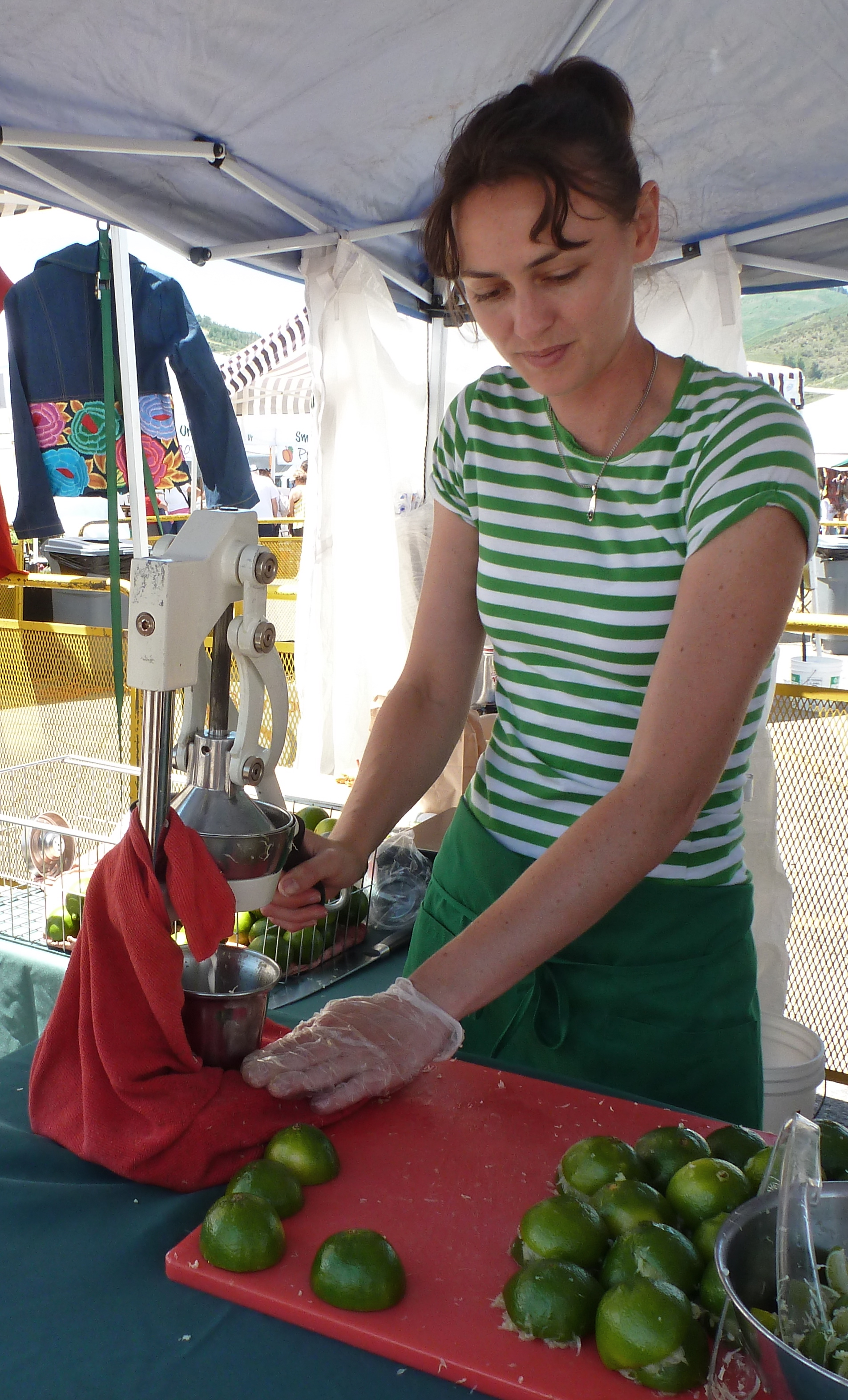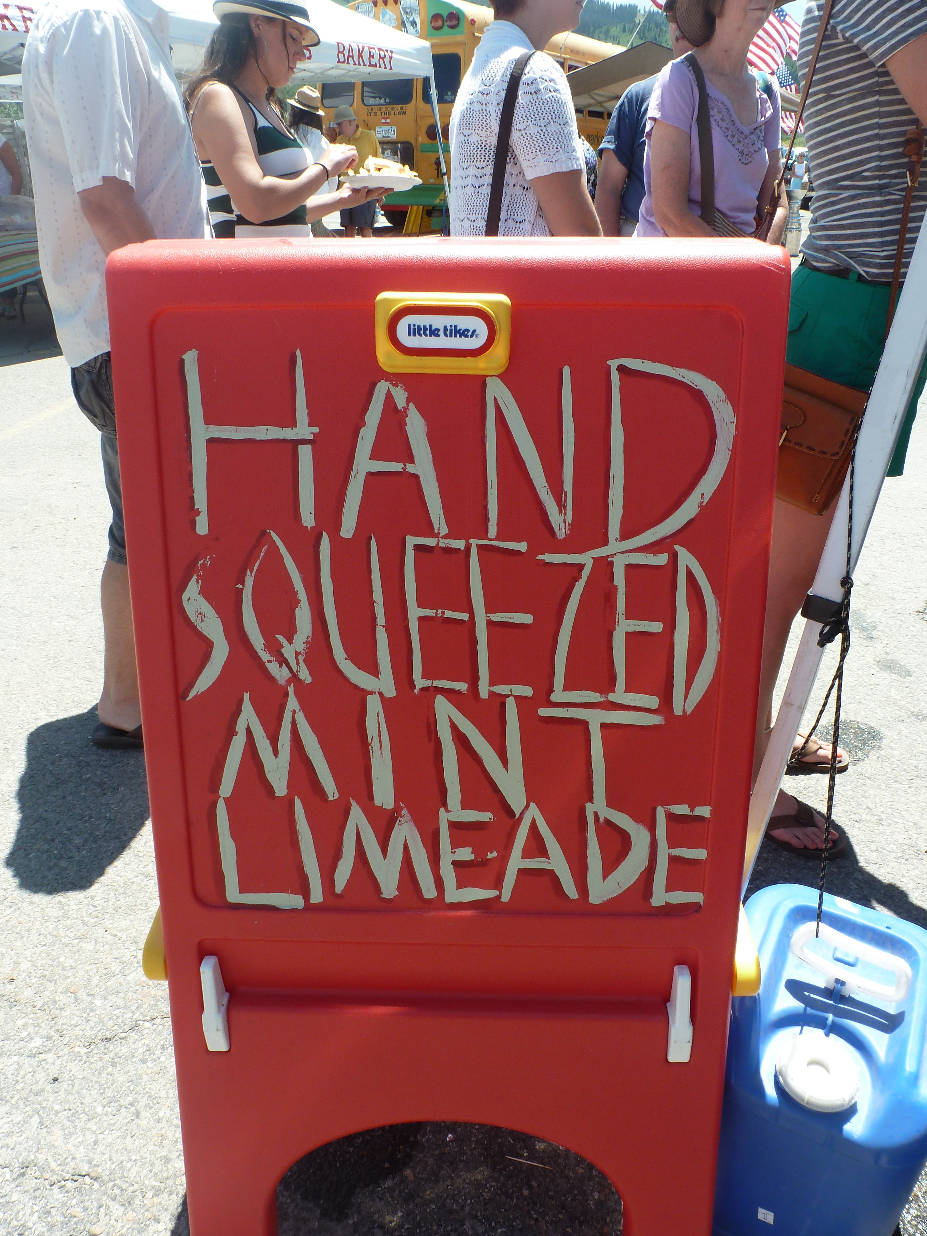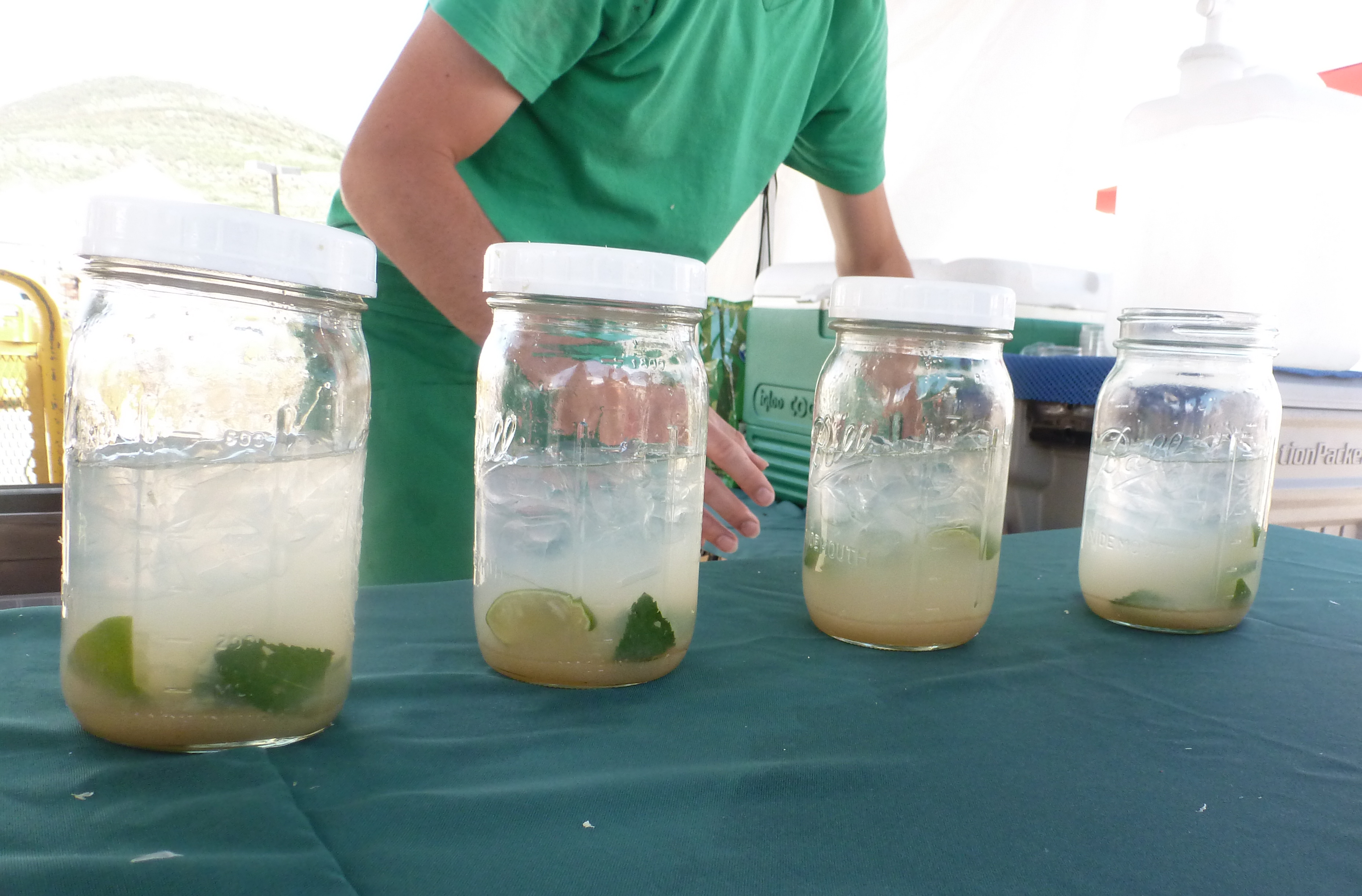 Considering my serious summertime fling with this homemade lemonade recipe, I had to taste this citrus refreshment, too. There was a string of people anxiously waiting for a glass of limeade. Clearly, these guys had something good going on. From my view at the back of the line, I could glimpse a woman wearing green, slicing limes in half. Occasionally, the couple would shake jars of juice like maracas, smiling away. As I got closer, their process became more clear.