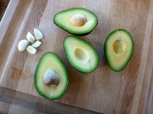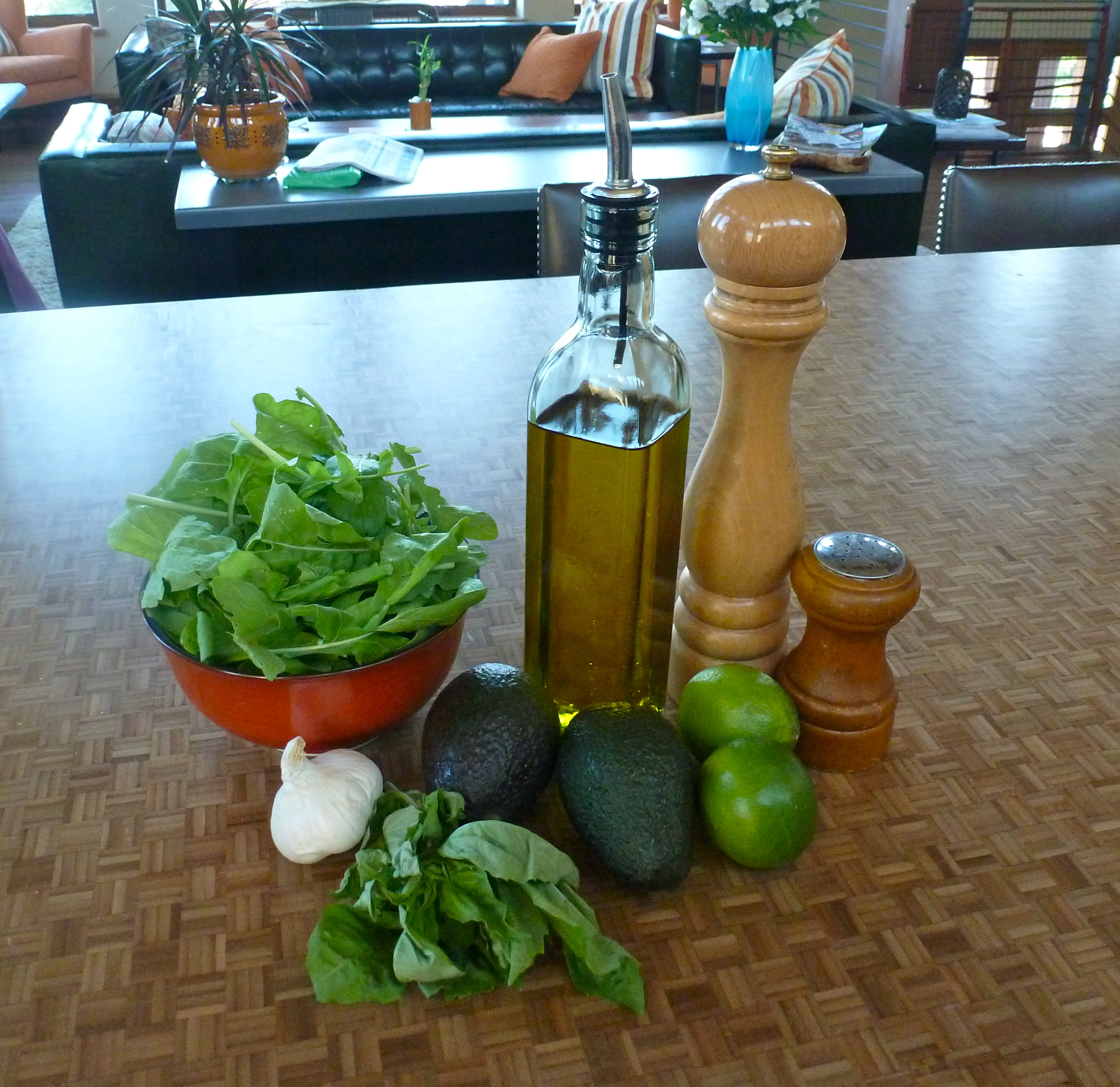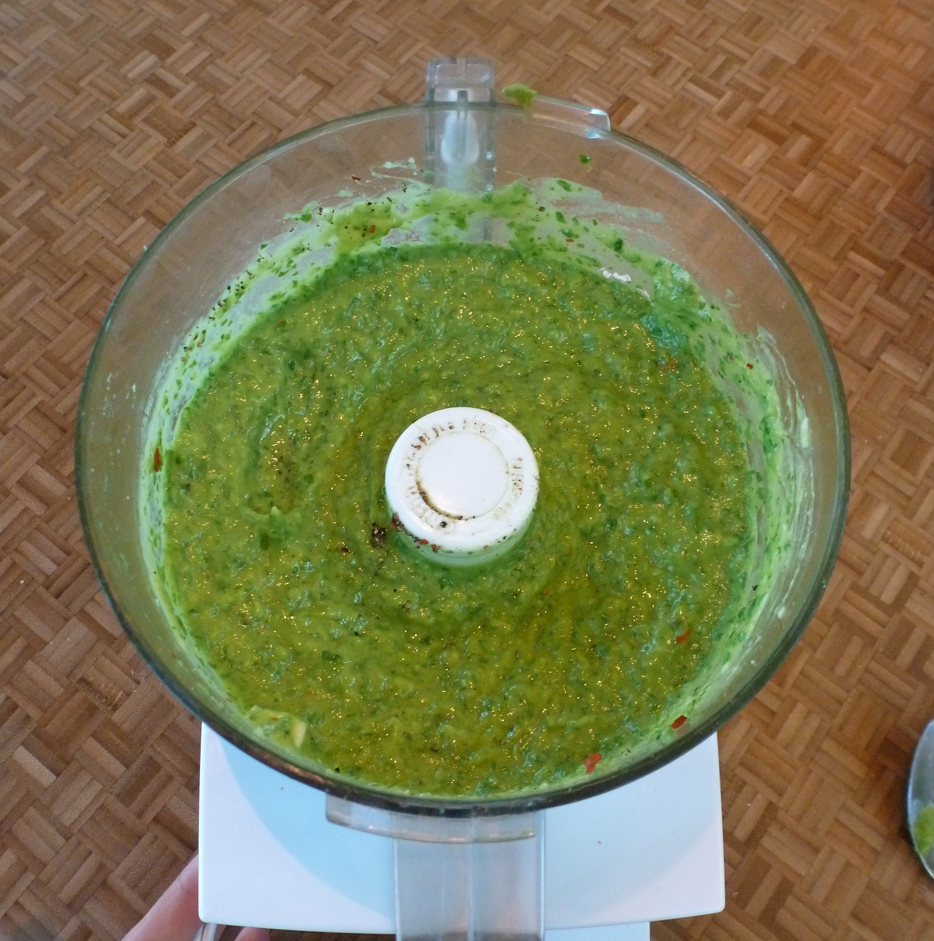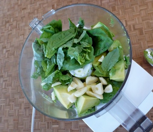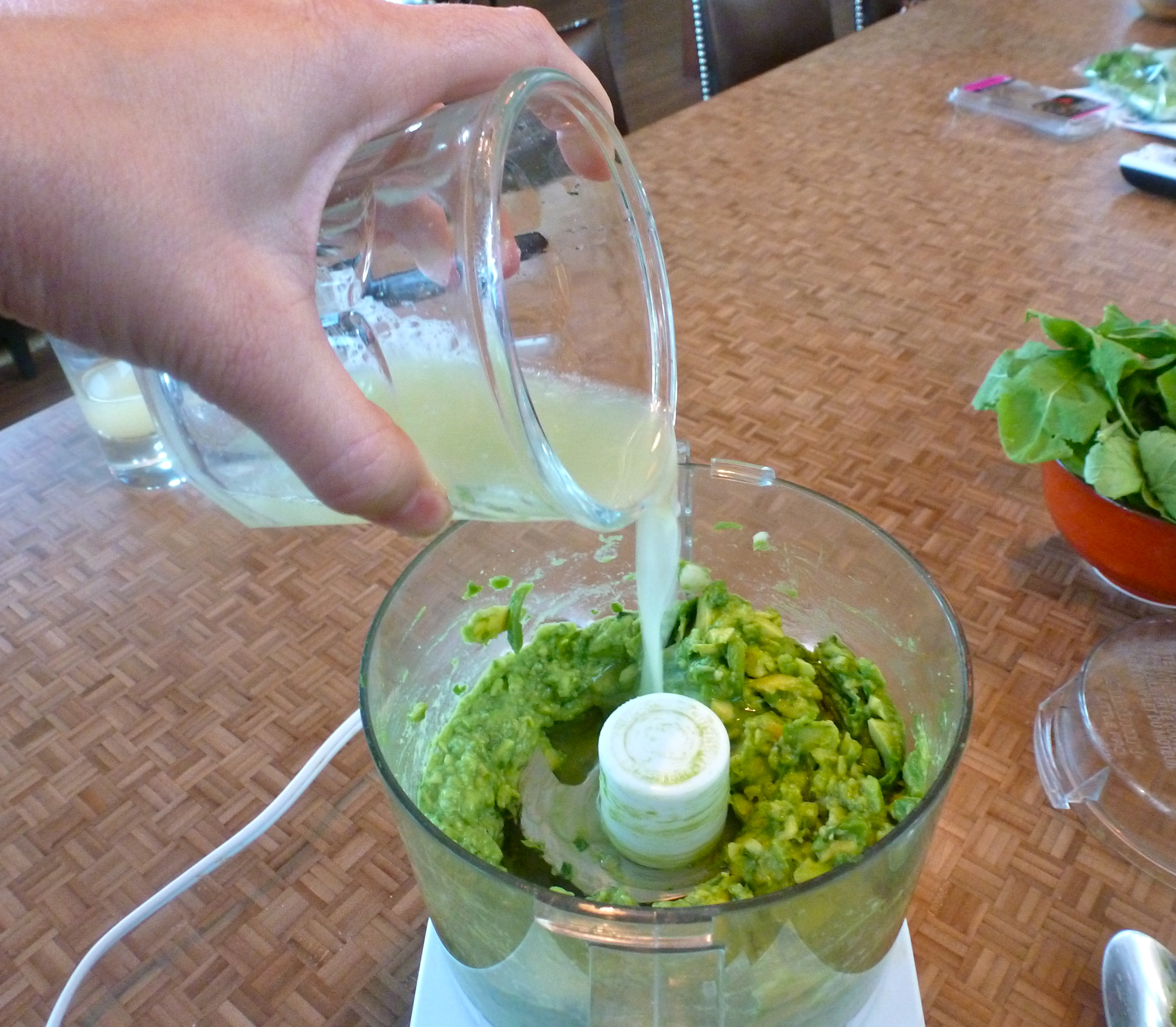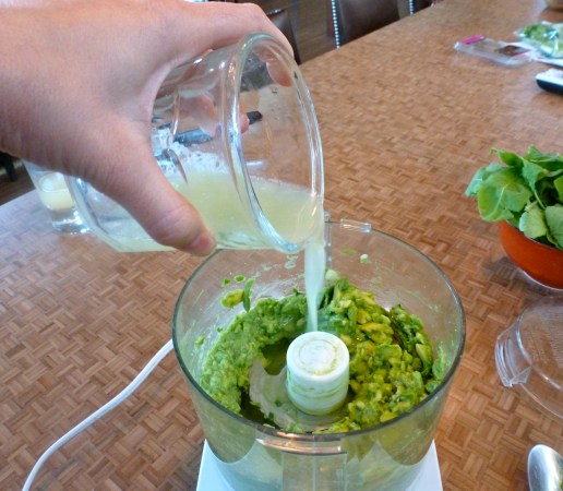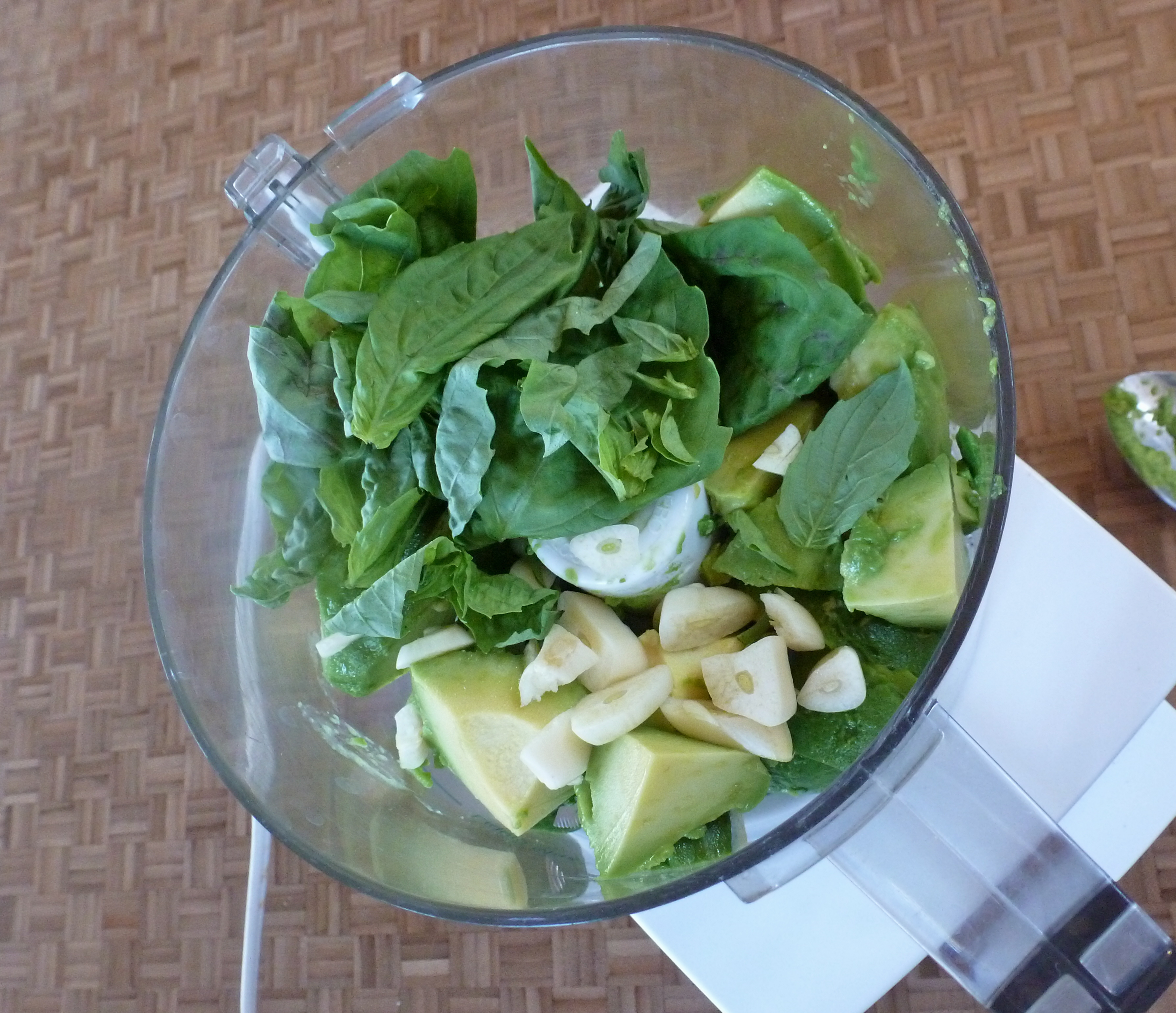 The recipe called for avocado, basil, garlic, and lime juice to be blended in the food processor. As luck would have it, my pretty little juicer was already warmed up.