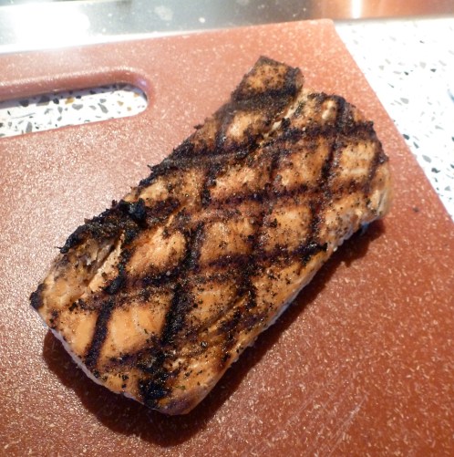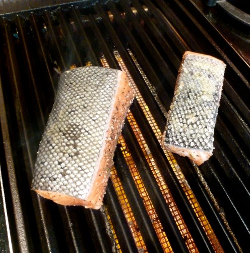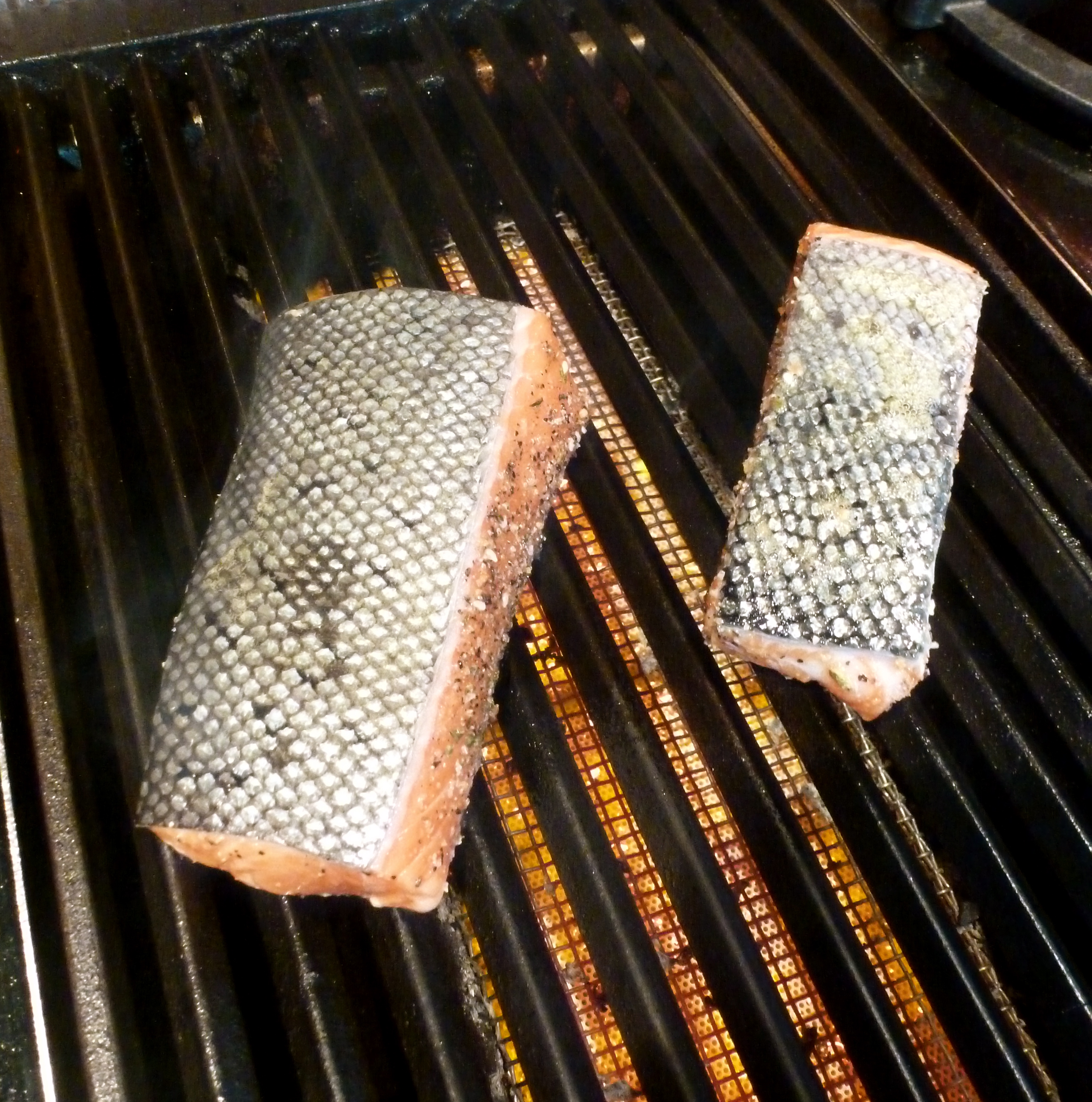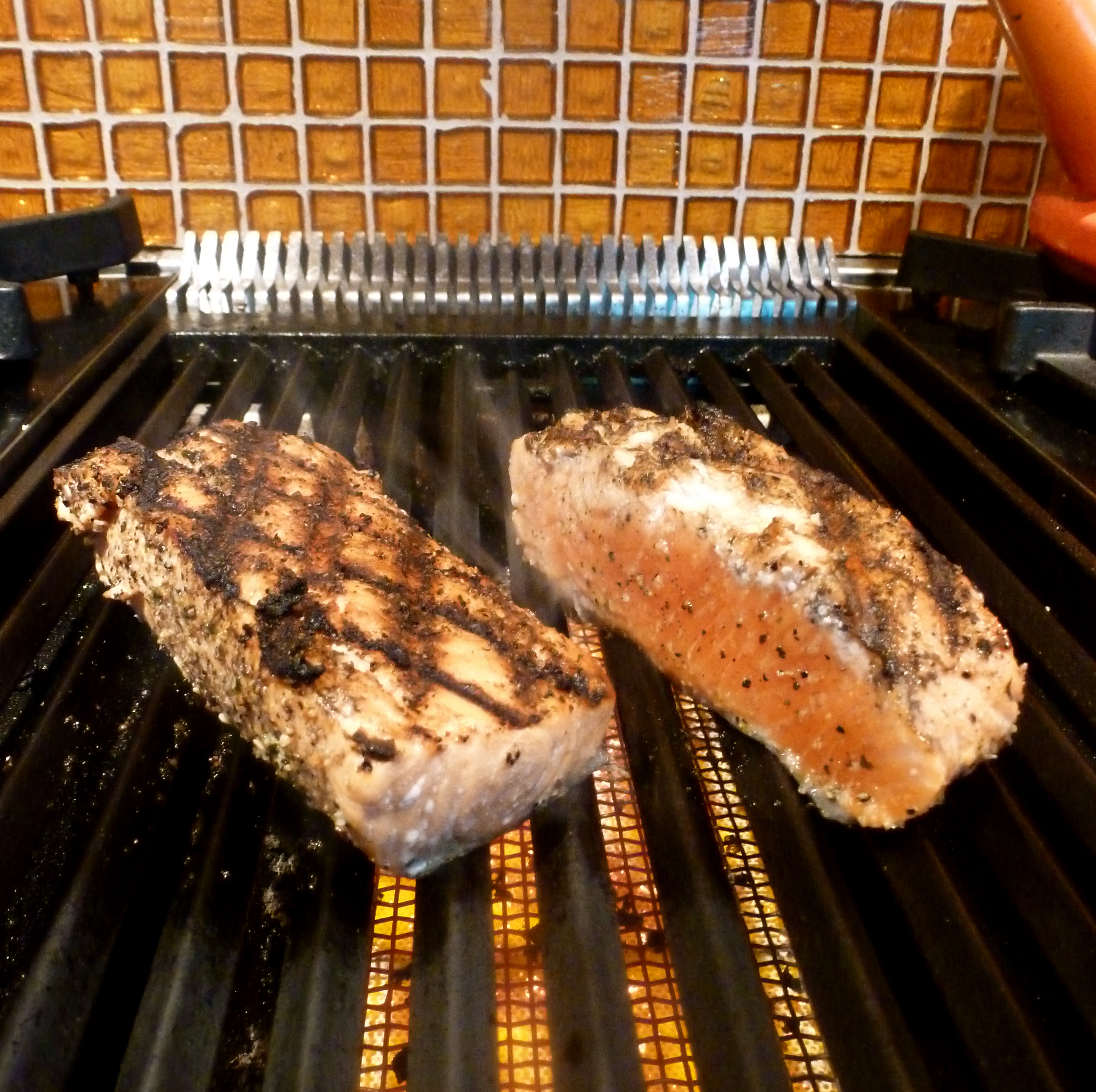 While I happily played with my plug-in appliances, John got started on the salmon. The color of the fish was incredible! When I asked why he kept the skin on during grilling, he said that it helps keep the fish together on the grill. His grill marks are perfection.