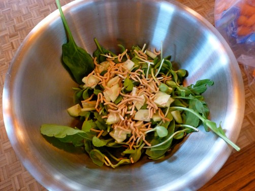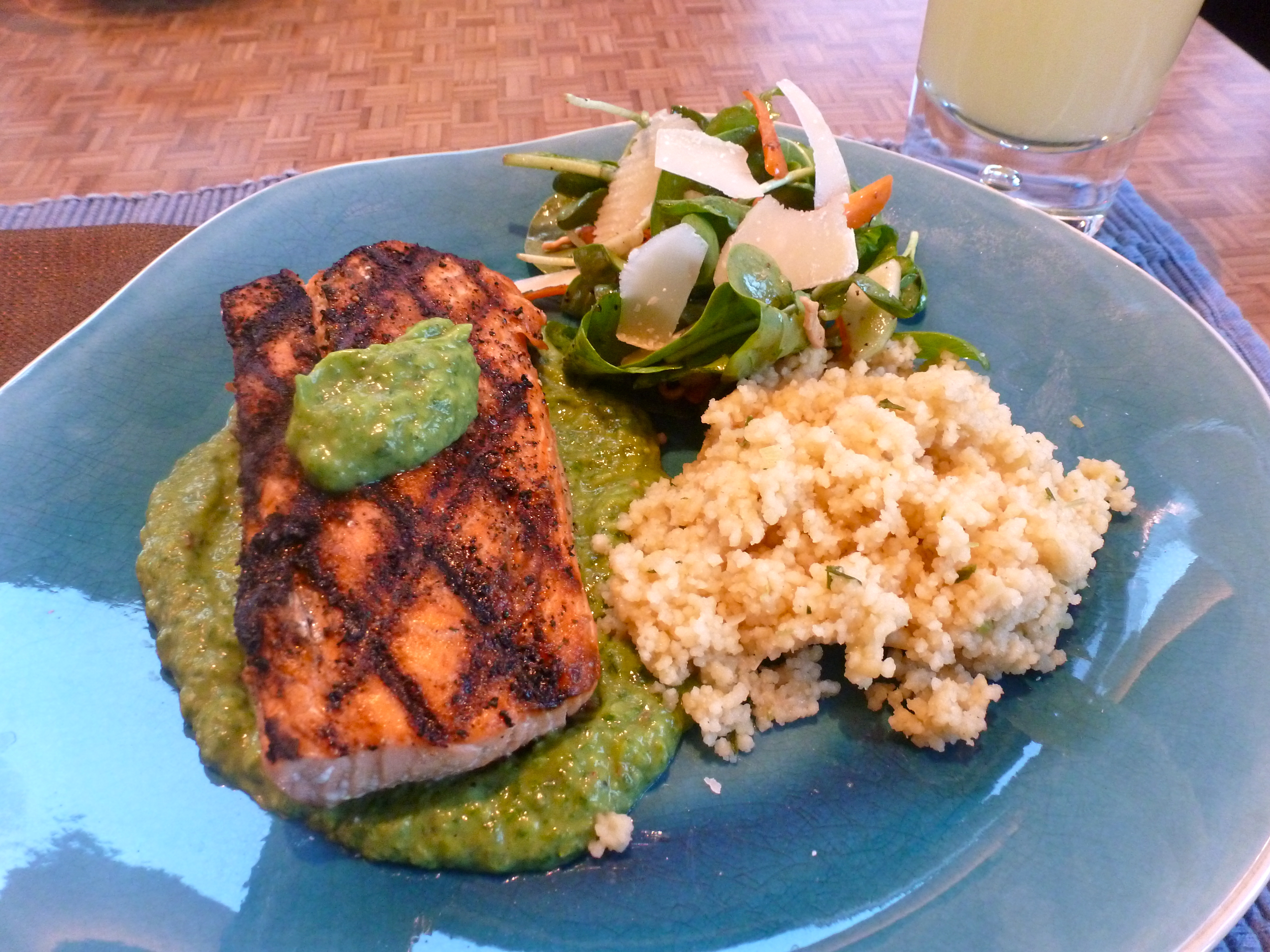 A salad of fresh greens and veggies along with a tasty boxed toasted almond cous cous rounded out our colorful meal. I spooned some of the avocado-arugula pesto onto the plate and John laid the fish on top. Beautiful!