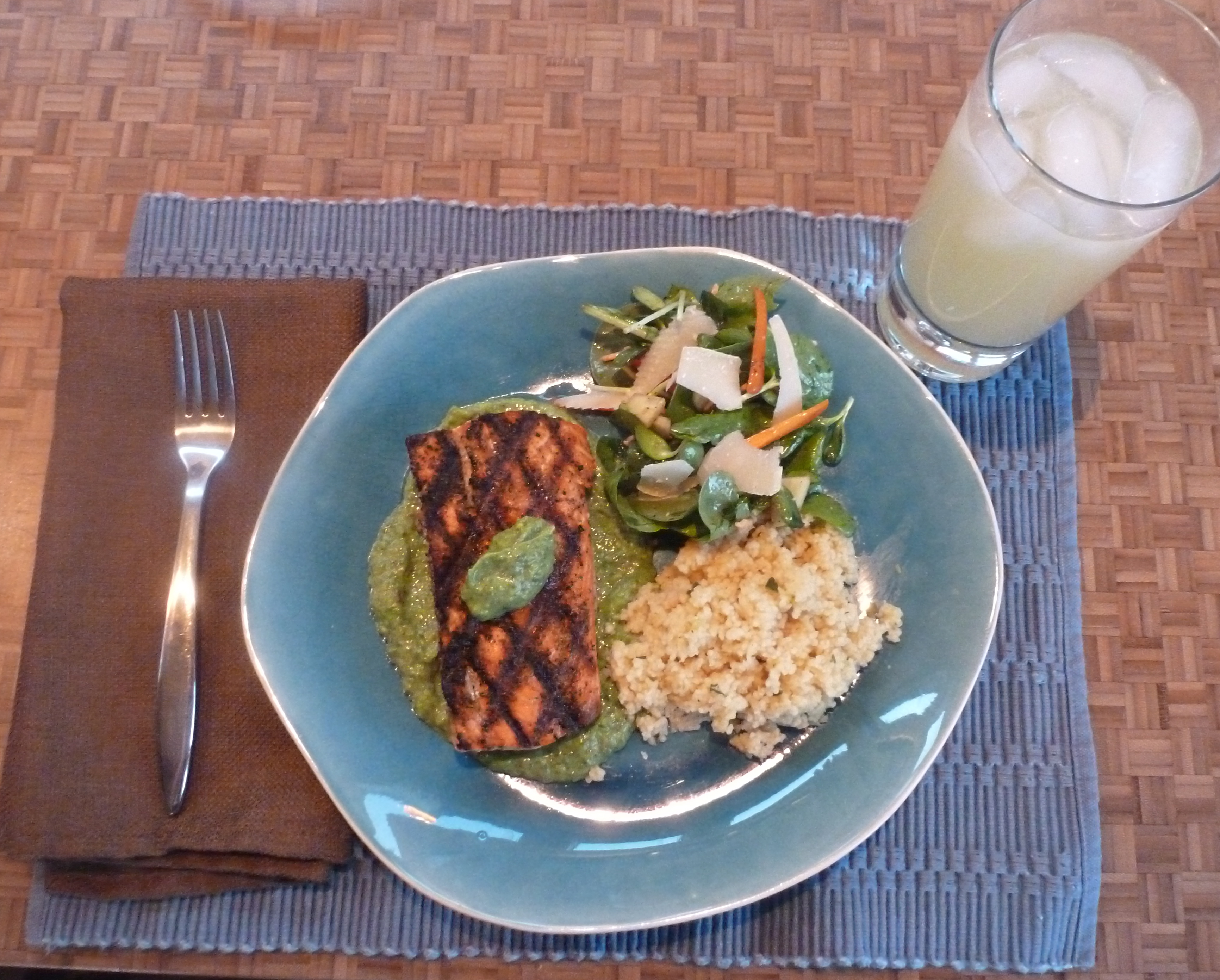 After a successful haul at the Park City Farmers Market, John and I tag-teamed an incredible meal with the yummy stuff we brought home with us. We dined on Grilled Wild King Salmon with Avocado and Arugula Pesto, served with toasted almond cous cous and a farm-fresh salad. Oh, with mint limeade to sip.