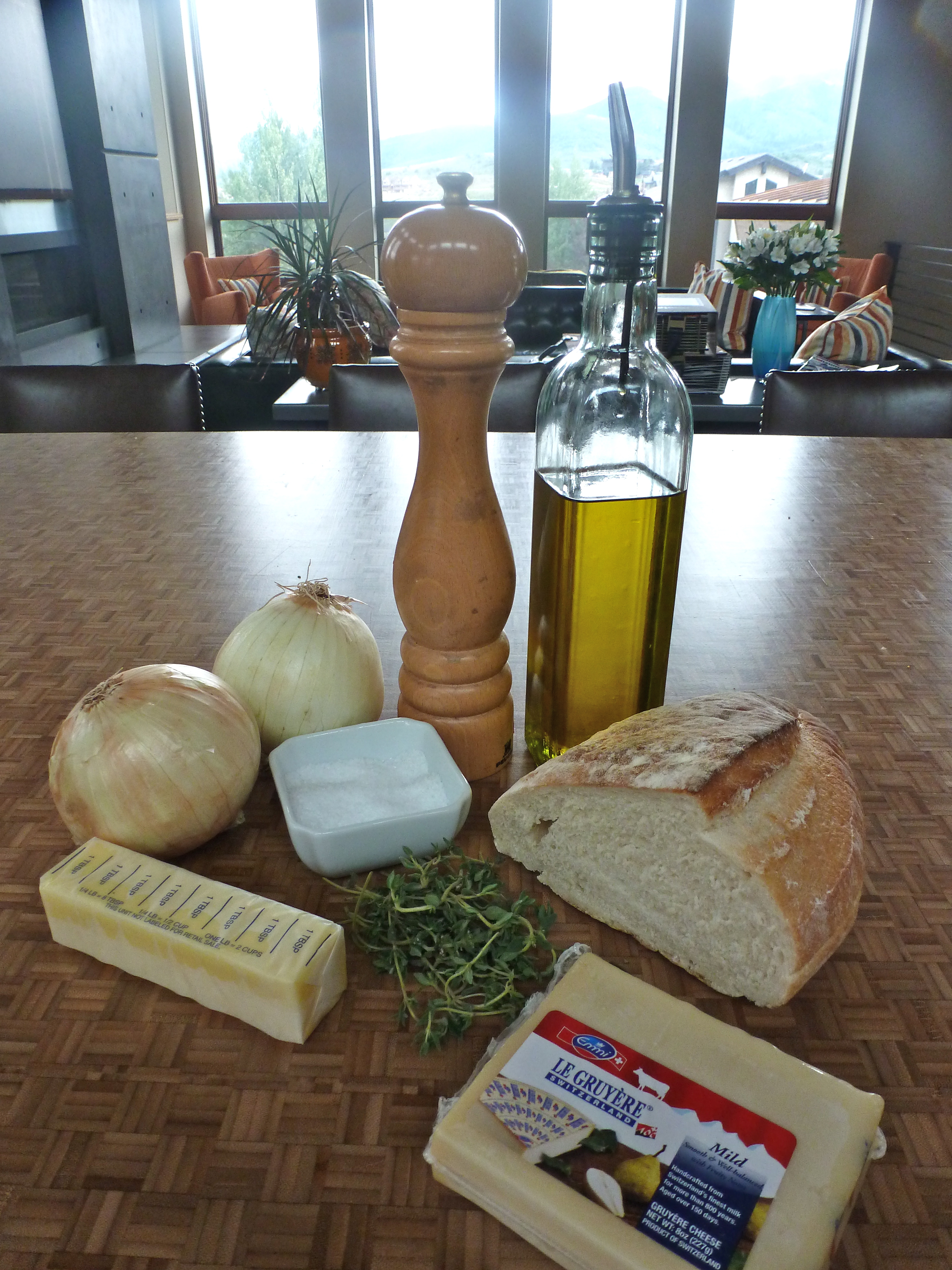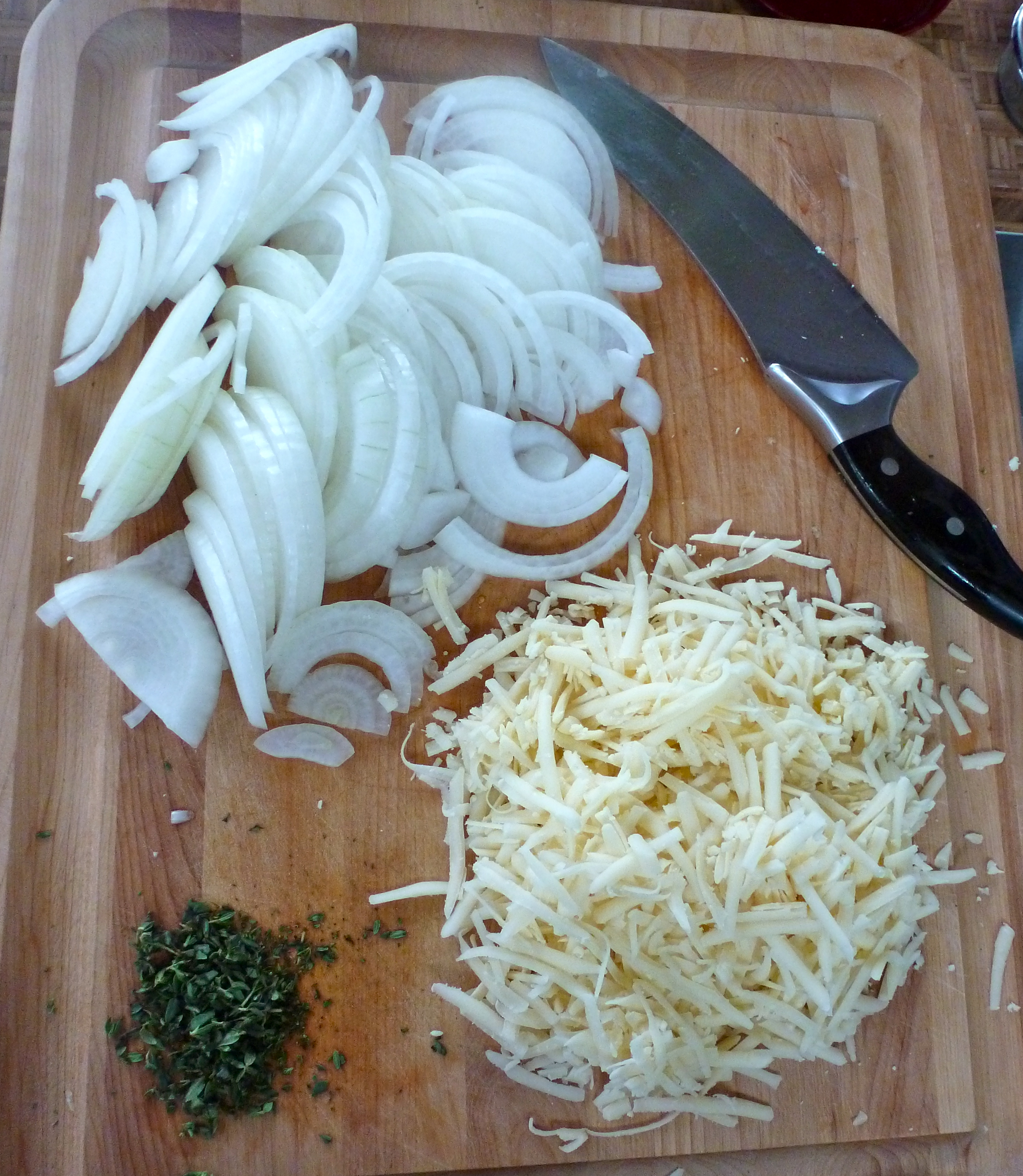 This recipe is really easy to put together. The key is having the patience to slowly caramelizing the onions. As I prepped my pile of sliced half-moon onions, shredded gruyere cheese, and chopped fresh thyme, a glance outside revealed building clouds and the first sprinklings of summer rain. Perfect for a night in with a meal like this.