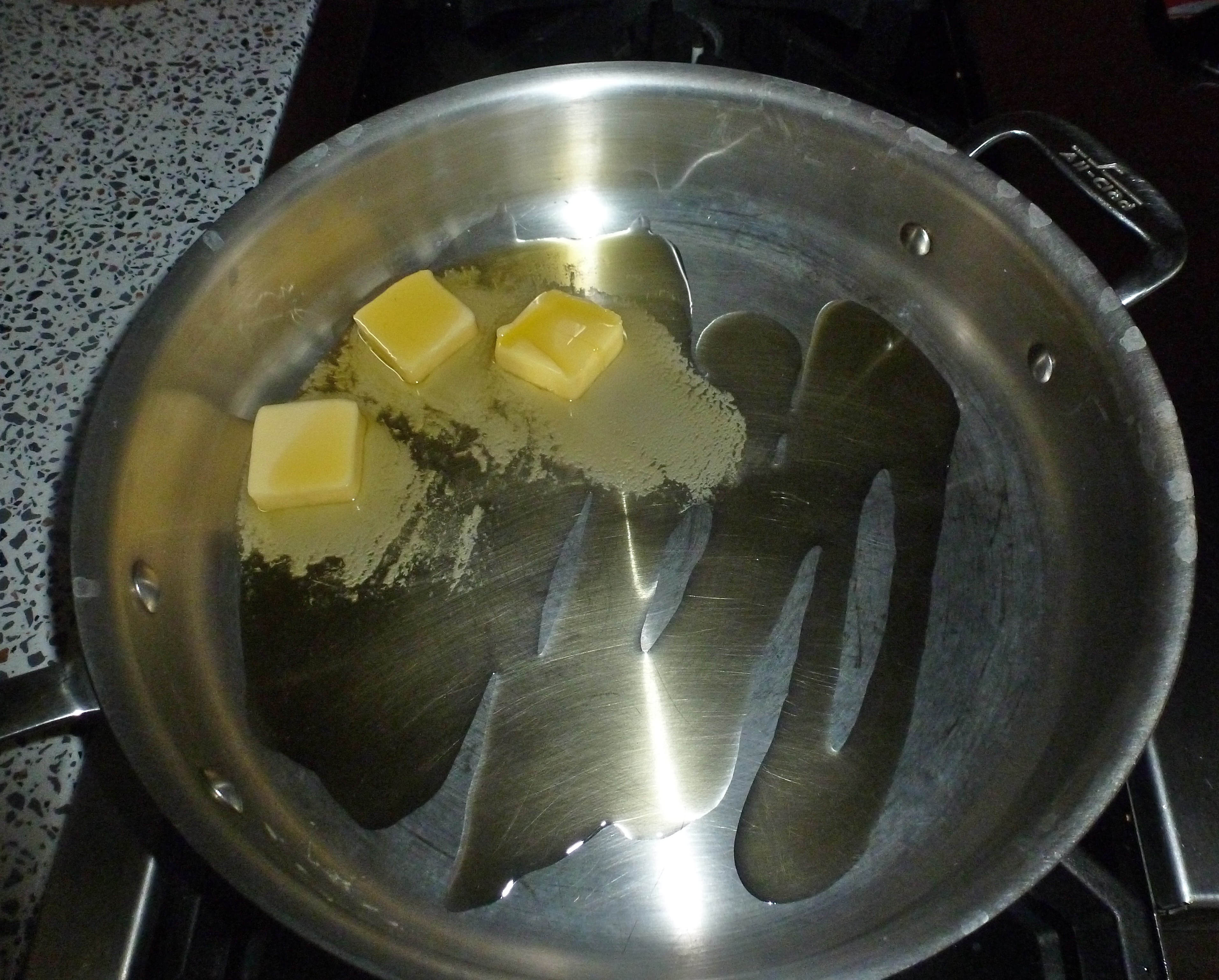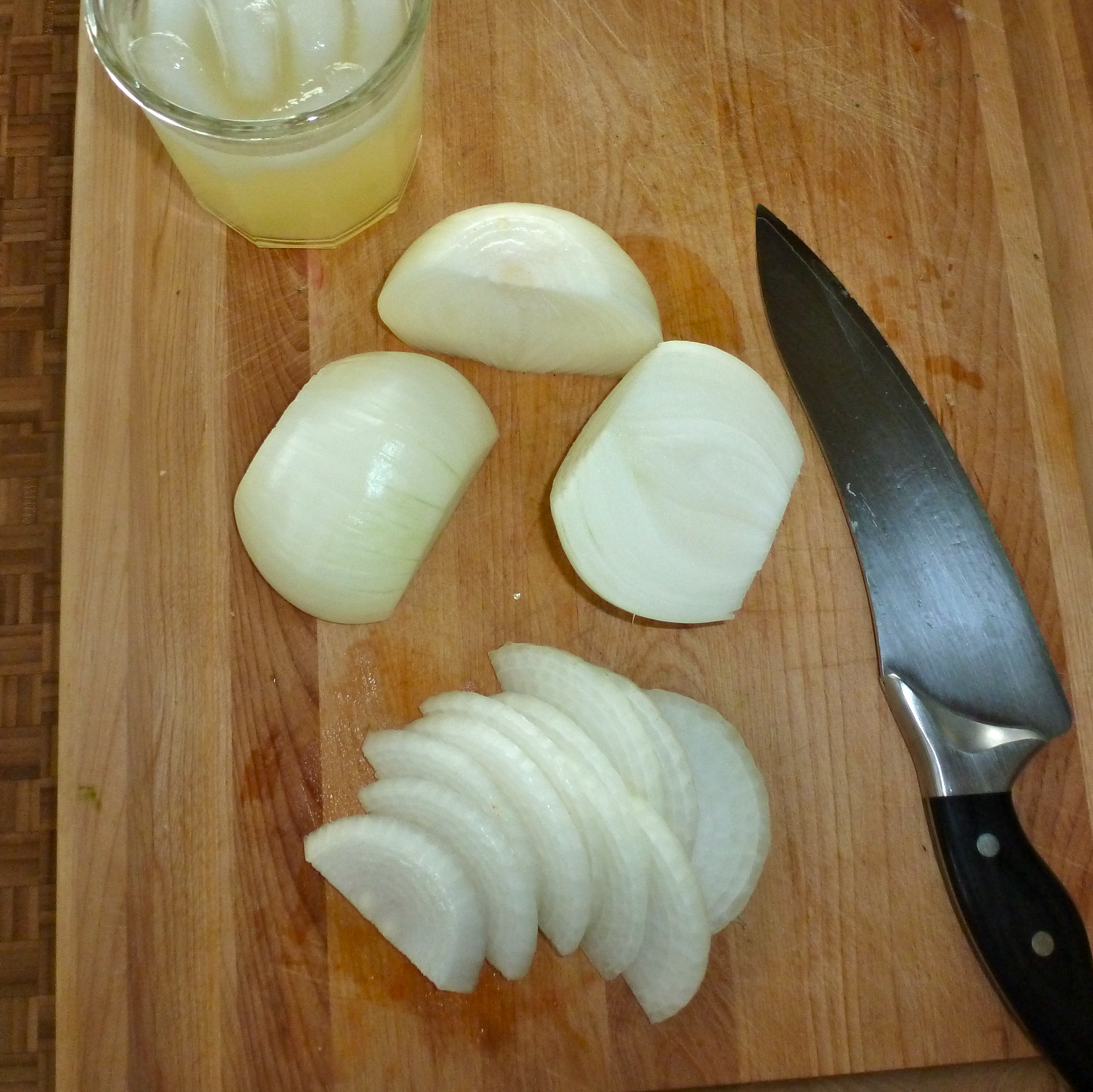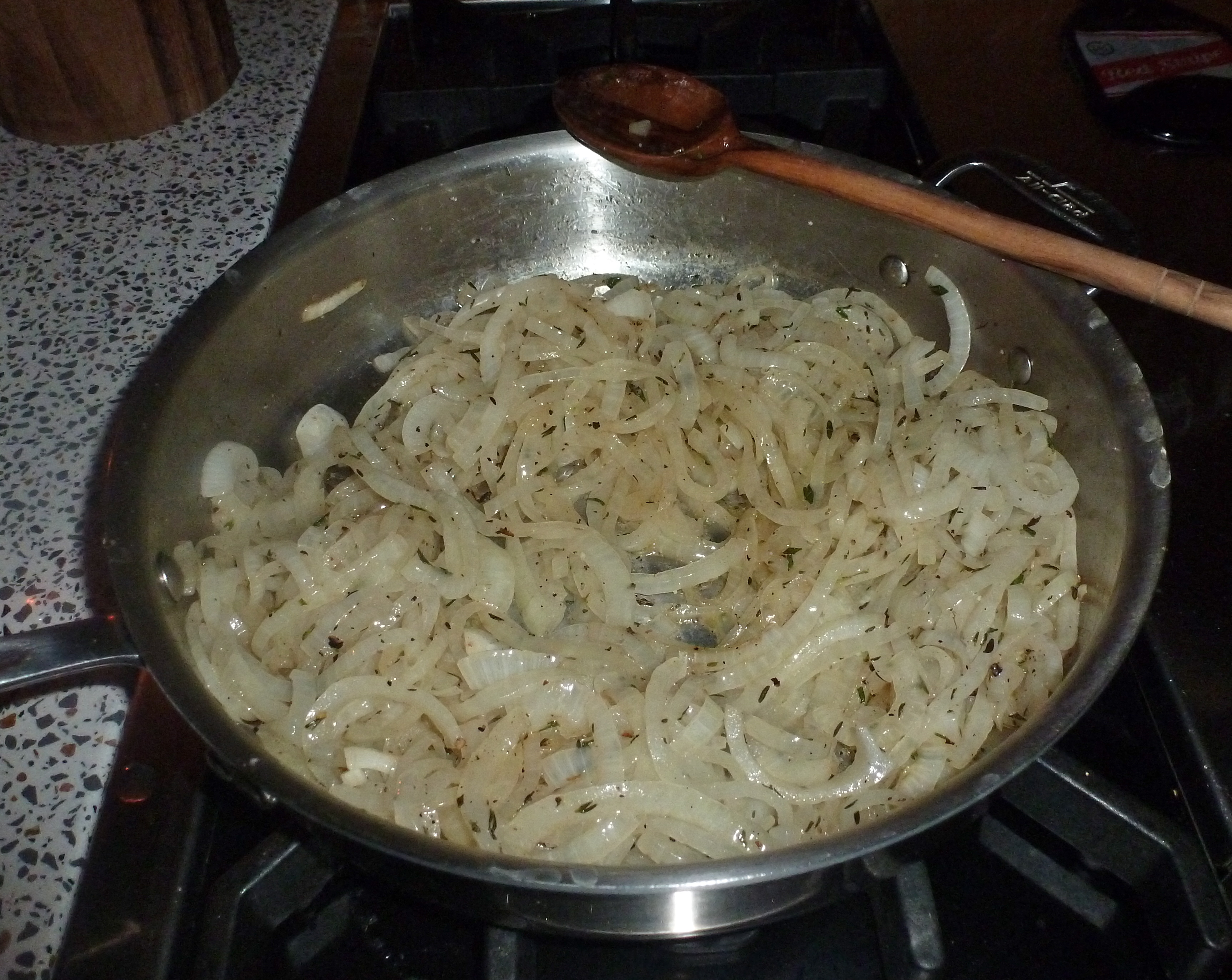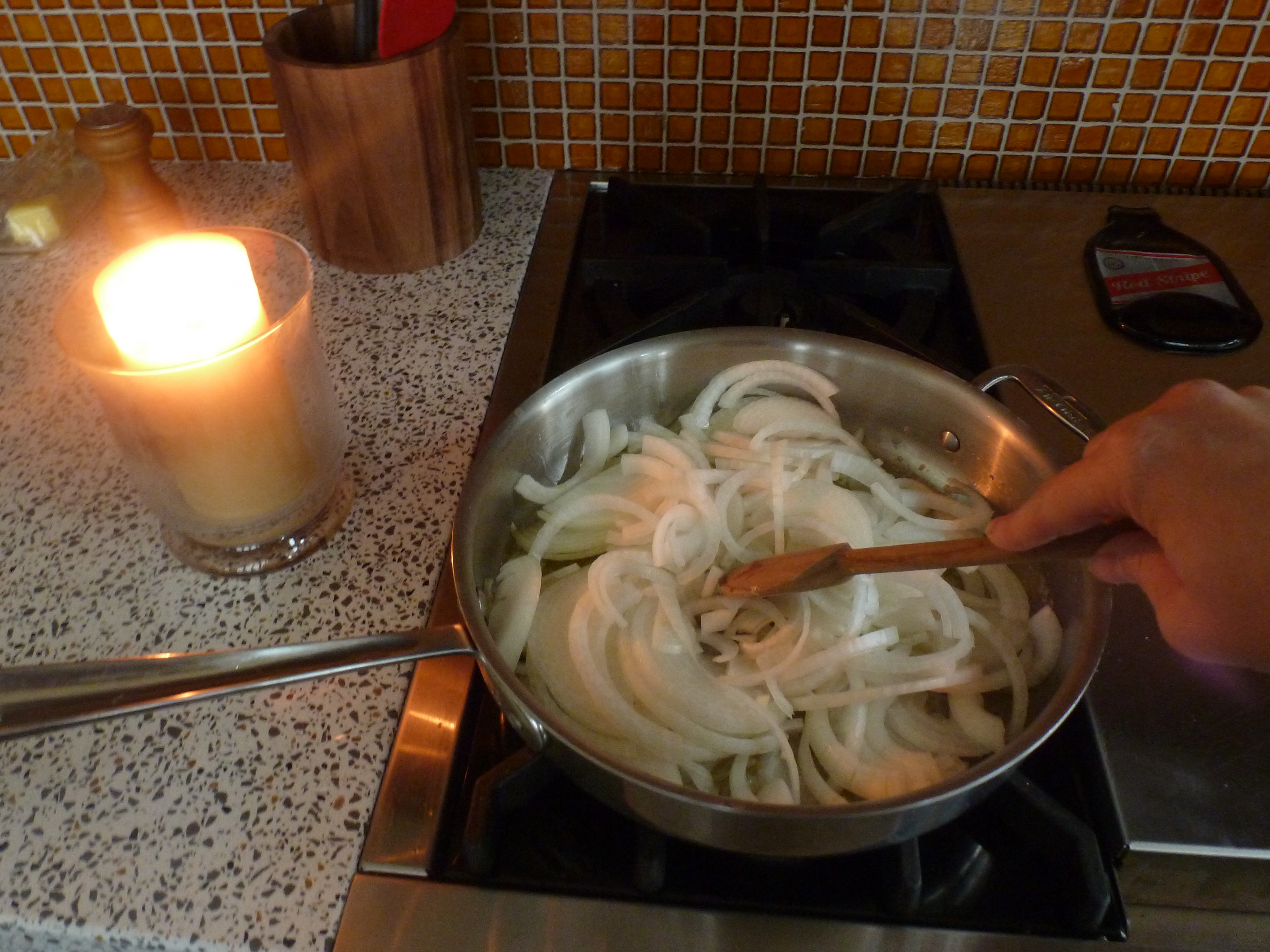 I was just about to heat up my skillet when the power went out. In the 5 months we’ve lived here, we haven’t had a power outage. A storm was building, but it wasn’t bad. Figuring the lights would come on shortly, I lit the stove with a lighter, and tossed the pile of onions into the melted butter and olive oil. I smiled as brought out a few candles. I’m a sucker for candles.