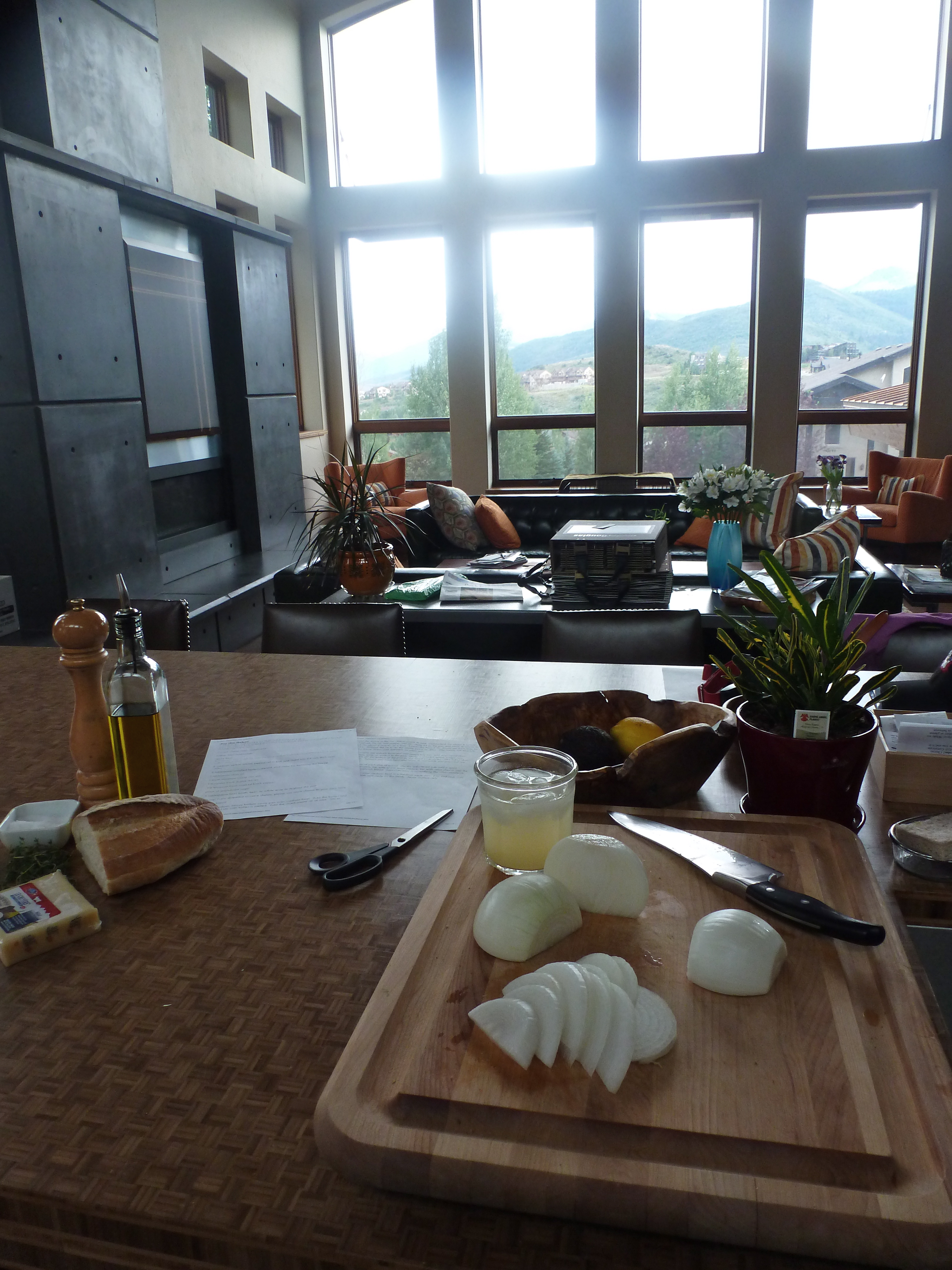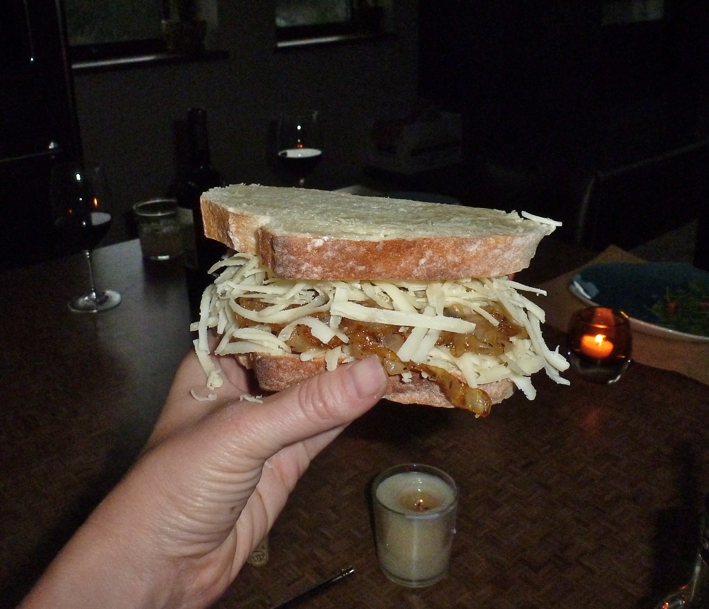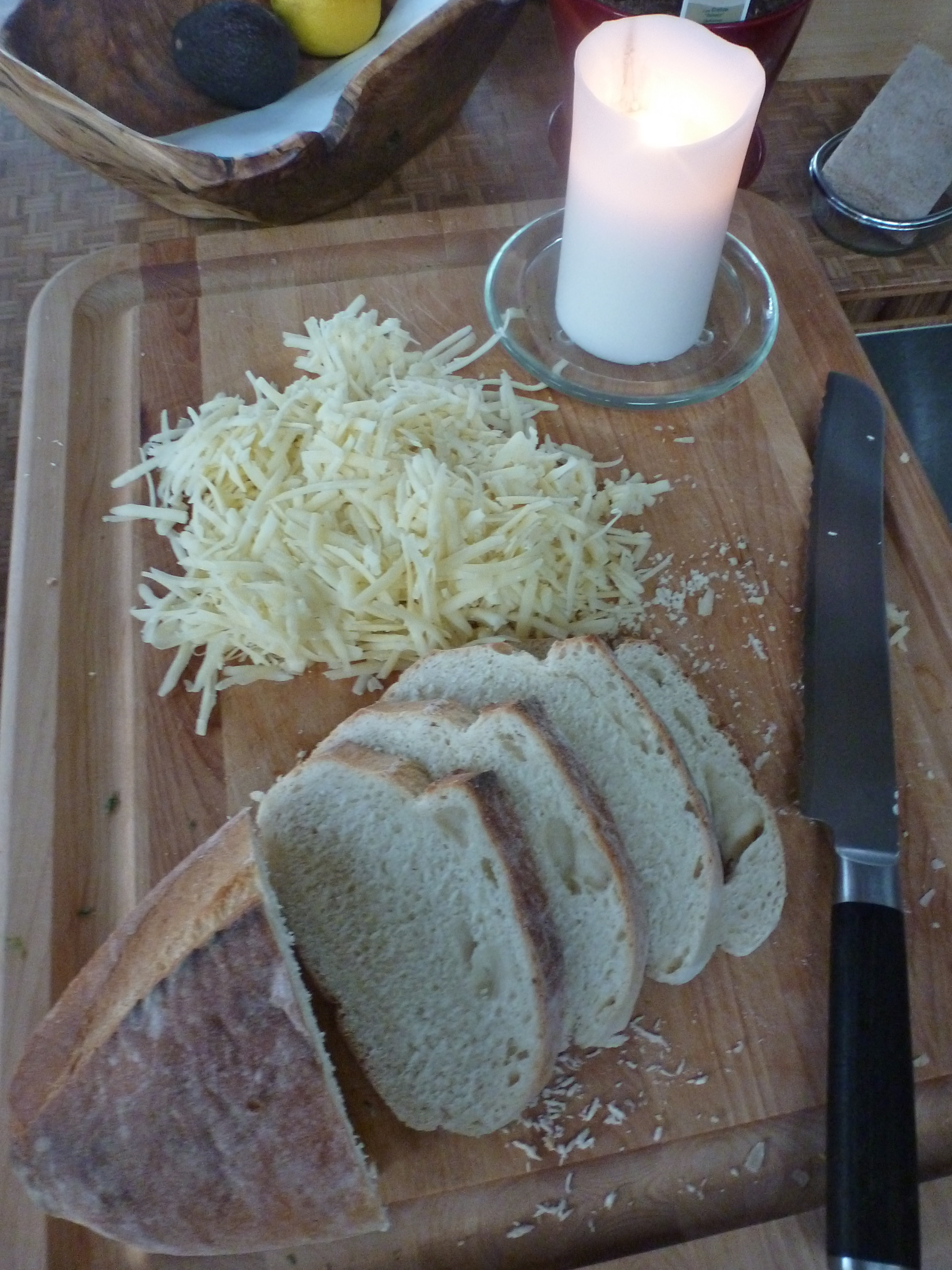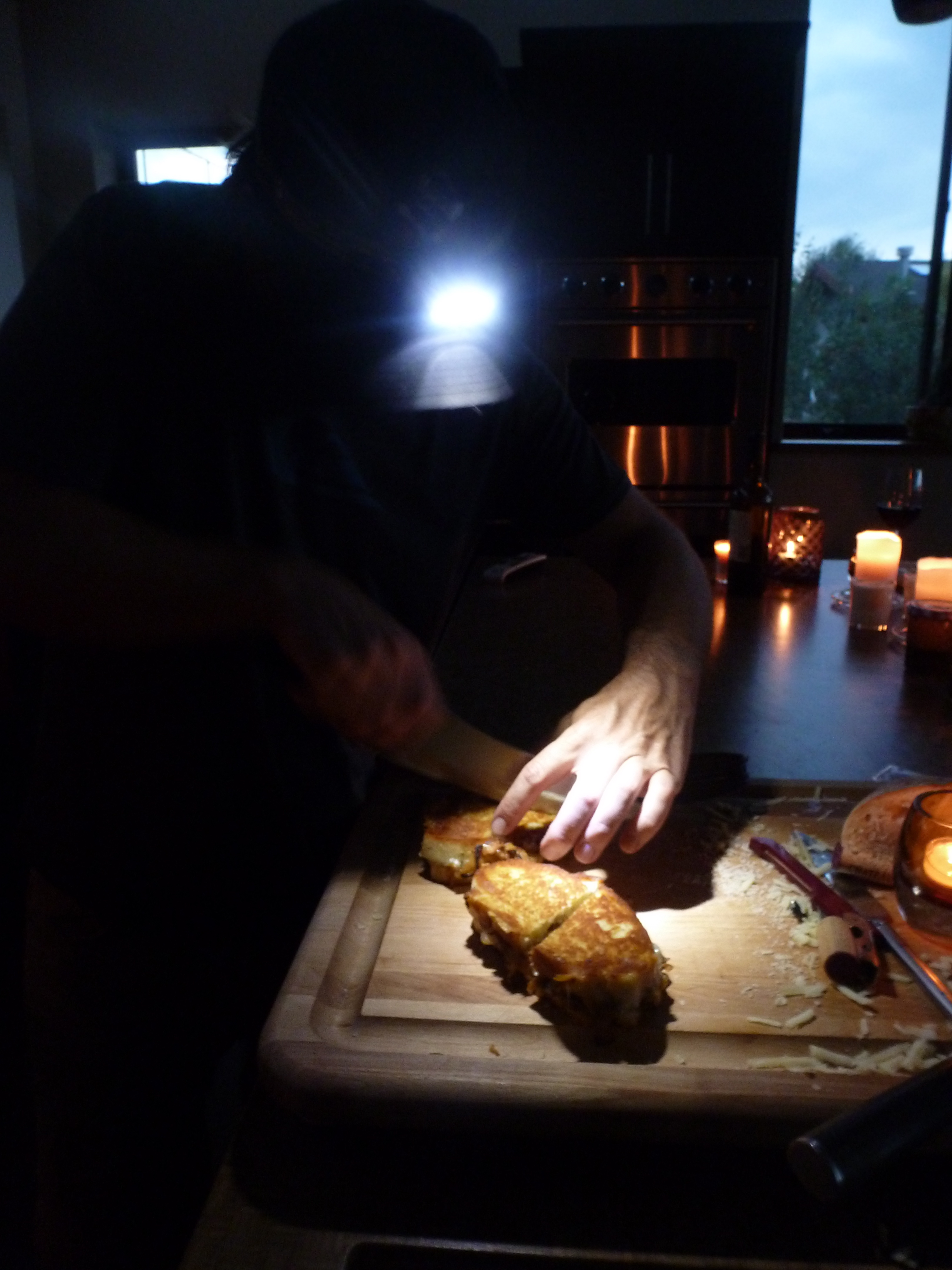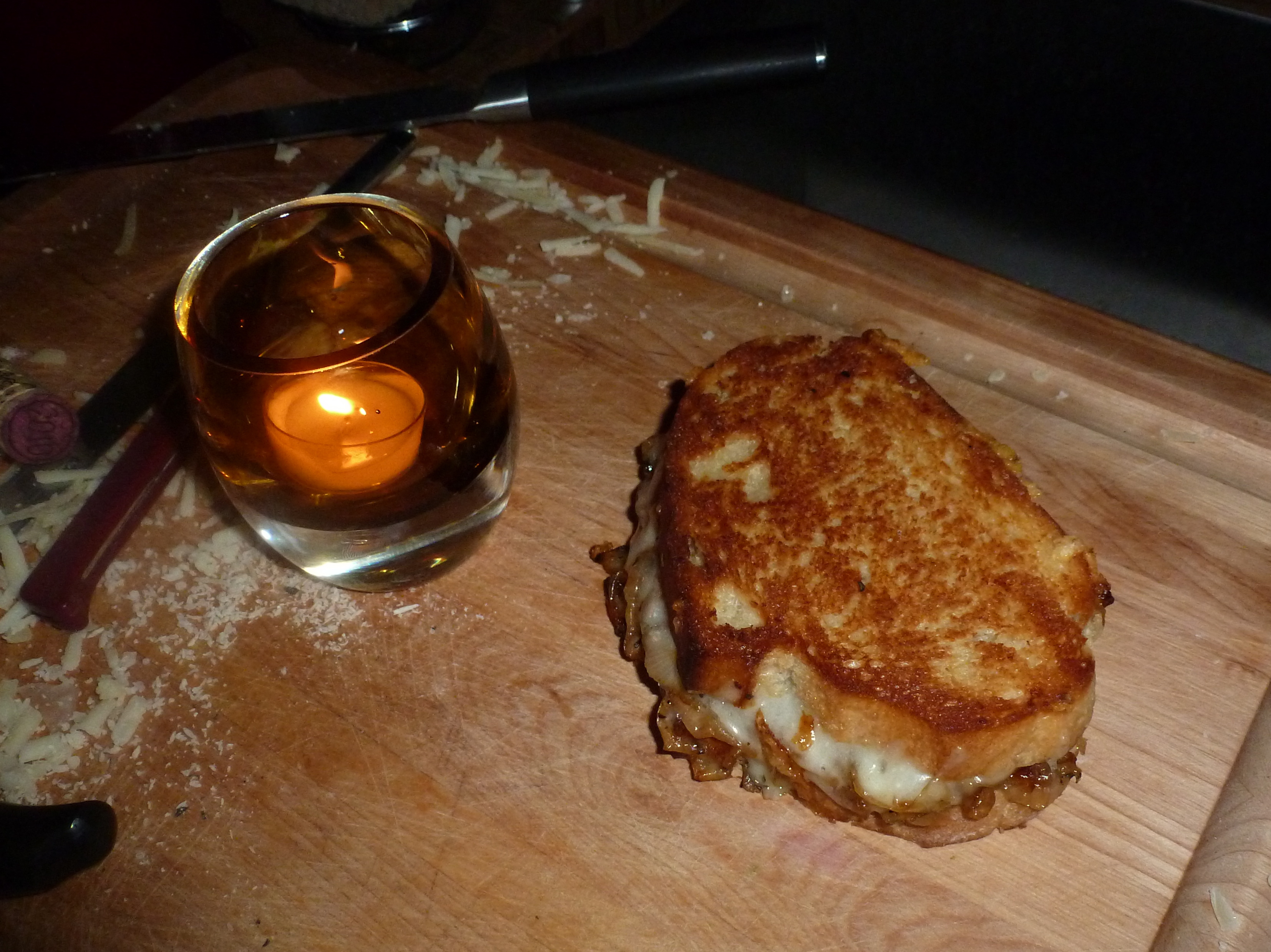Cooking by candlelight…what a concept! Ambiance and romance, always good with oniony cheese and wine.