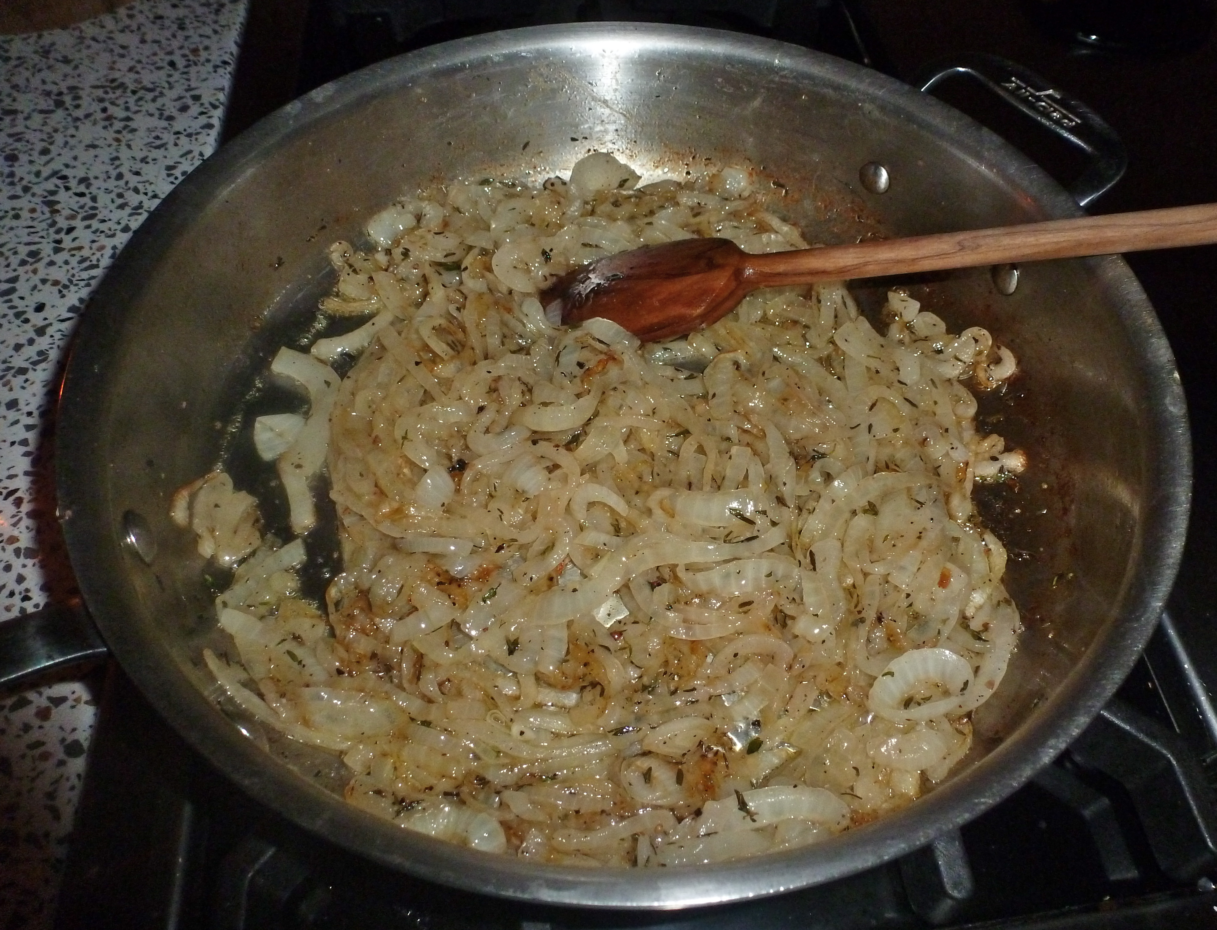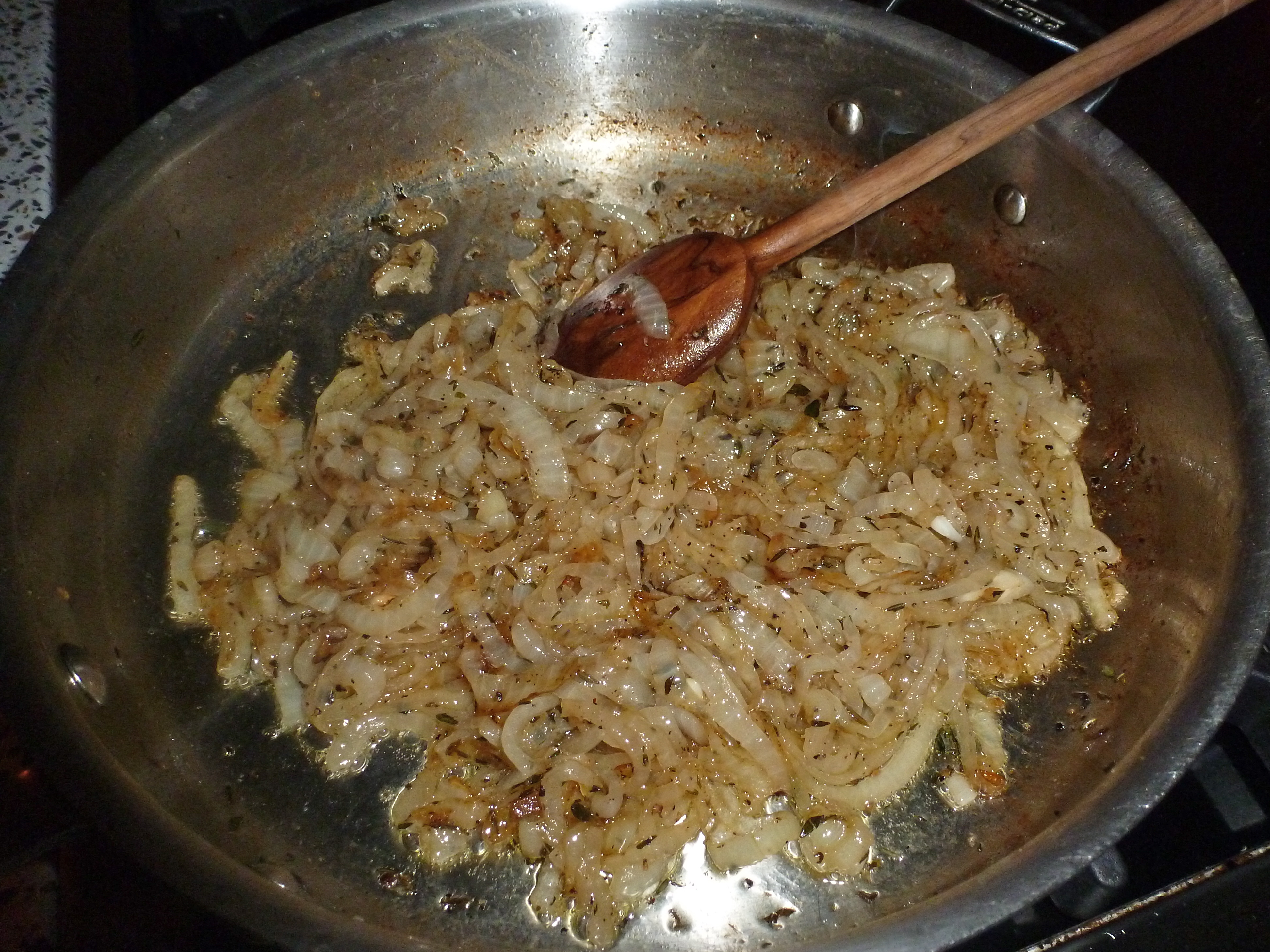 In winter, I love spending hours in the kitchen. I really enjoy being over the stove, creating something yummy and watching it all come together. So I didn’t mind the time it took to tend to the onions as they slowly broke down into a brown oniony jam. The aroma made my mouth water.