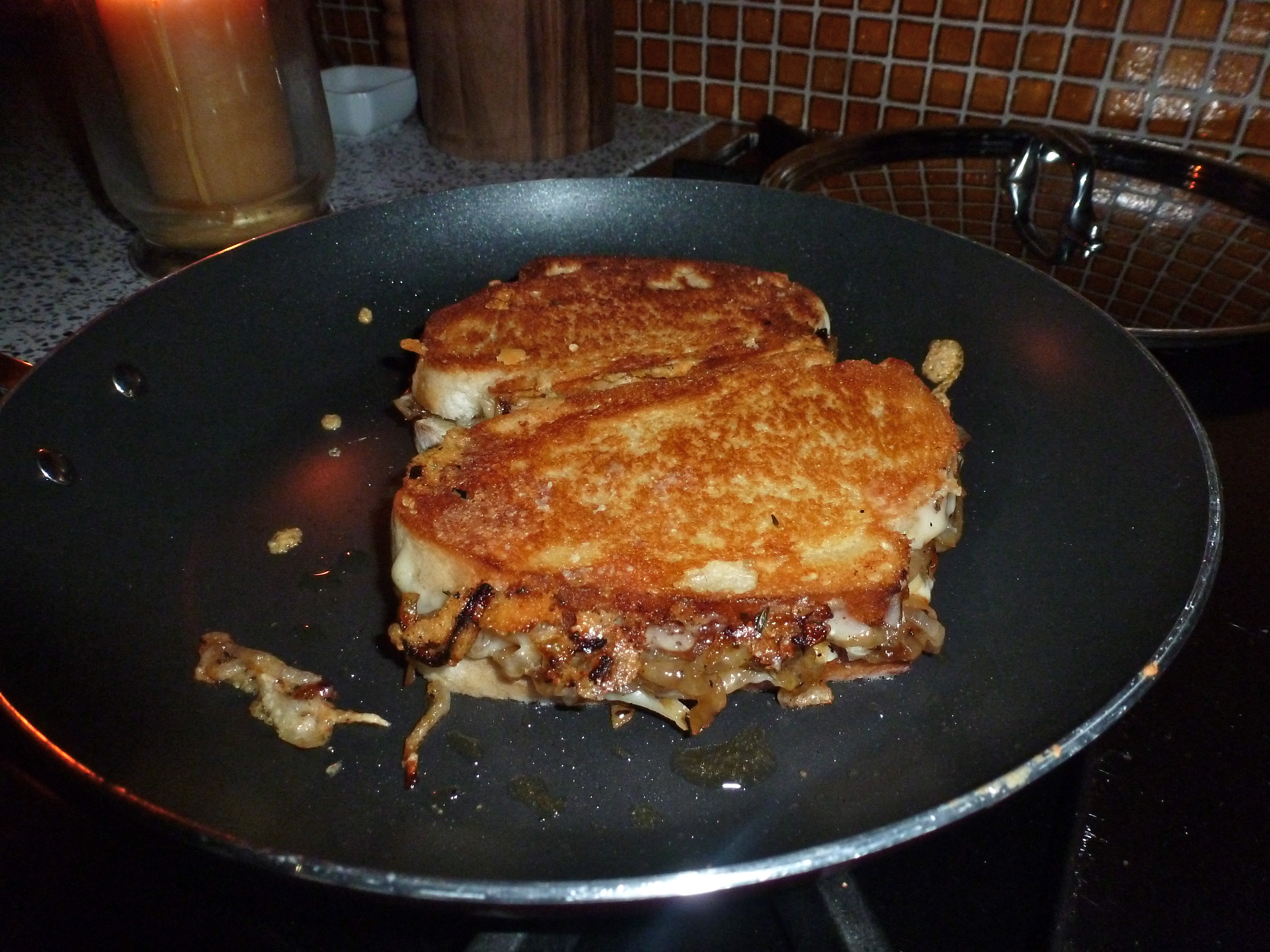 I deglazed the pan of caramelized onion love with a few tablespoons of white wine, and started assembling the sammies for browning. On buttered bread (buttered side out), first came the gruyere cheese, then some of the onions, then a little more of the cheese. The other piece of bread topped the pile of goodness and into the pan it went.