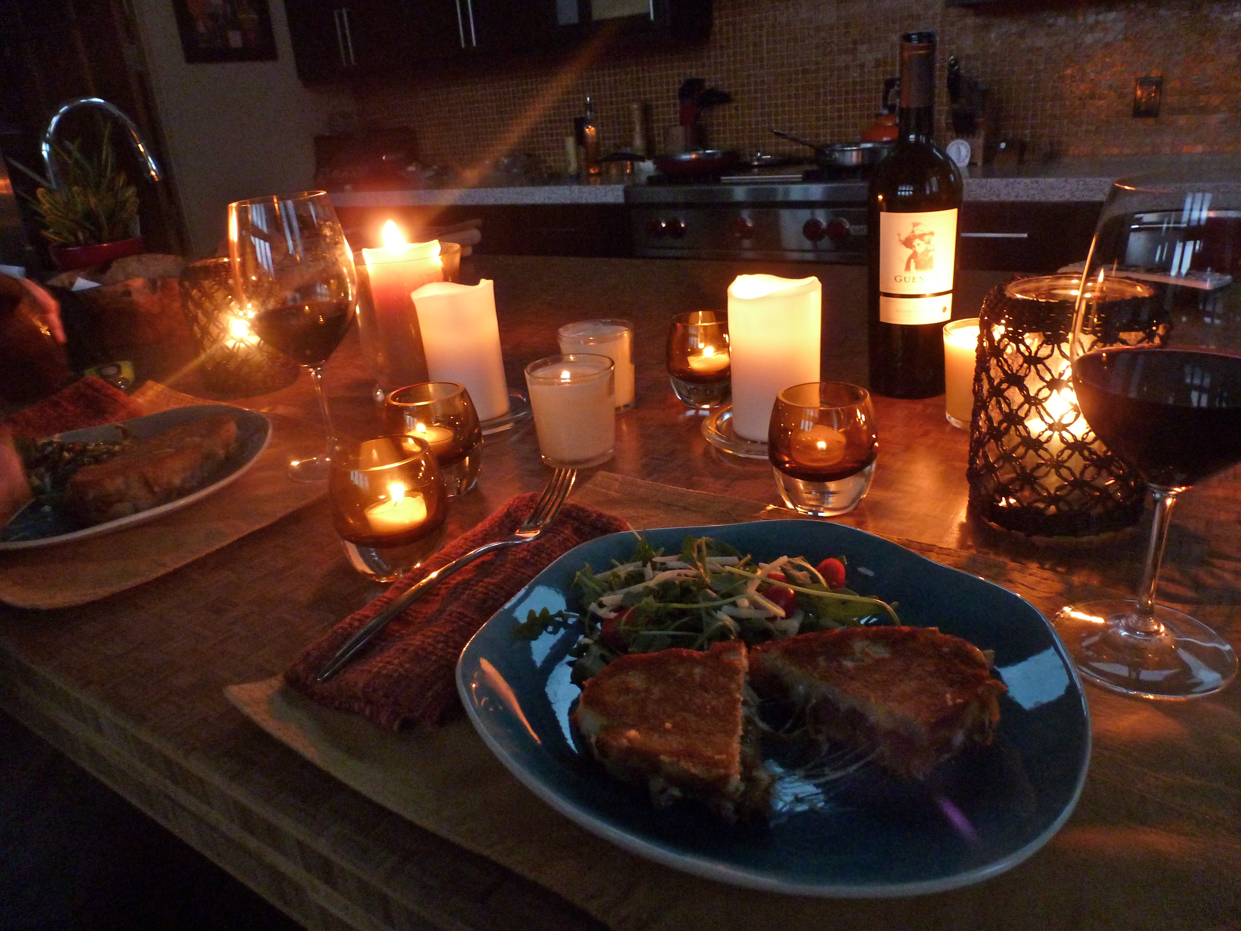 We planned to tote all of the candles upstairs later and spend our quiet night camping out with books and the puppy. But first, we enjoyed a leisurely dinner as the last bit of daytime faded away outside. We both took great pleasure in savoring each bite- and particularly each sip of wine, knowing it was a one-night thing. It was delicious, and completed what was an unexpectedly romantic evening.