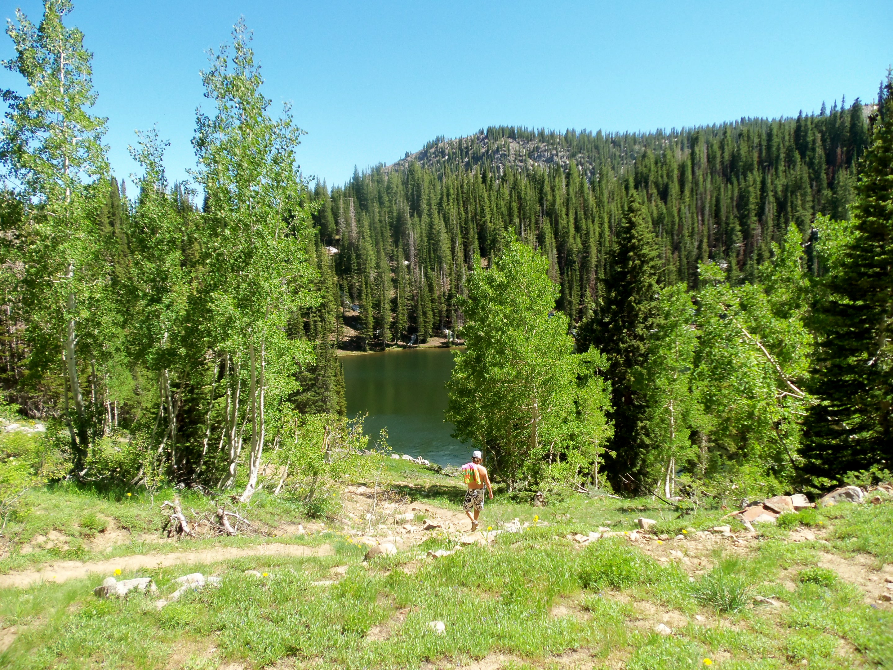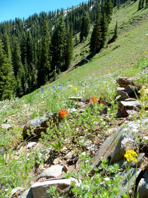 After the steepest part of the trail, I was able to breathe and enjoy the high mountain beauty around me. Hot as can be in the Salt Lake Valley, it was still springtime up here. There was even snow on the ground.
