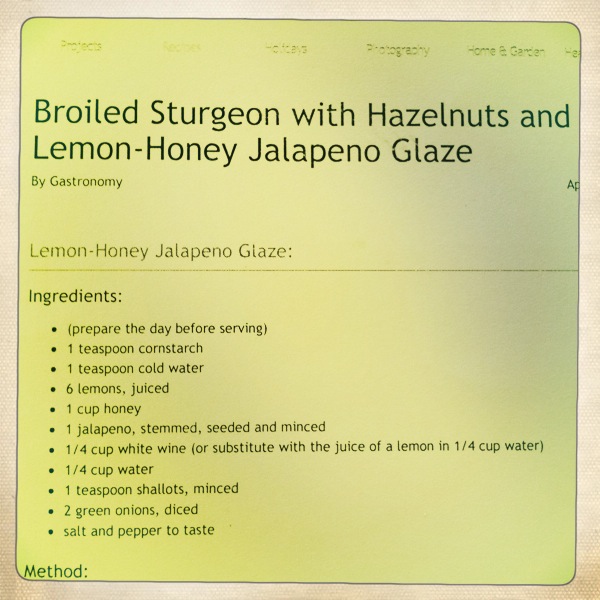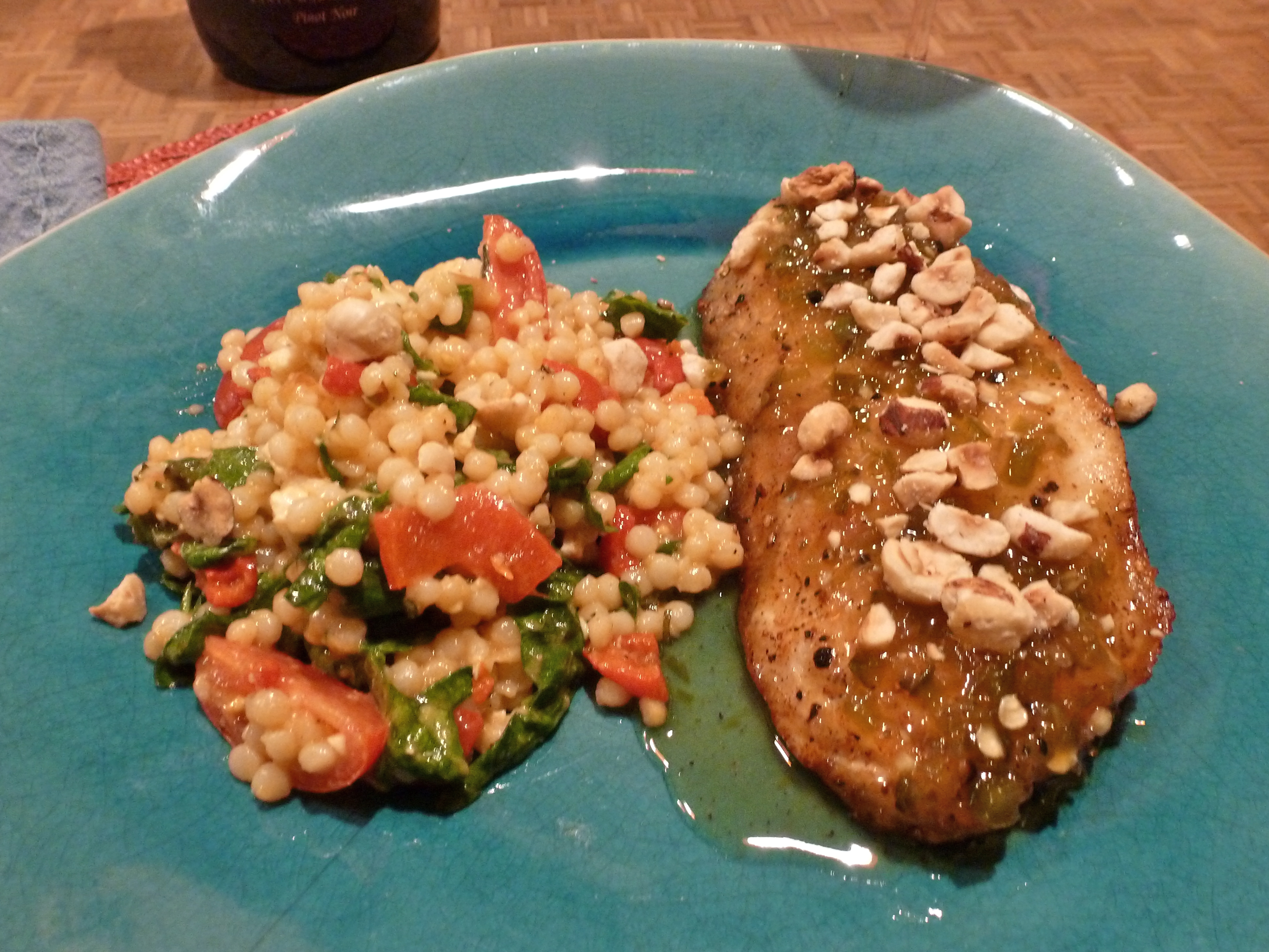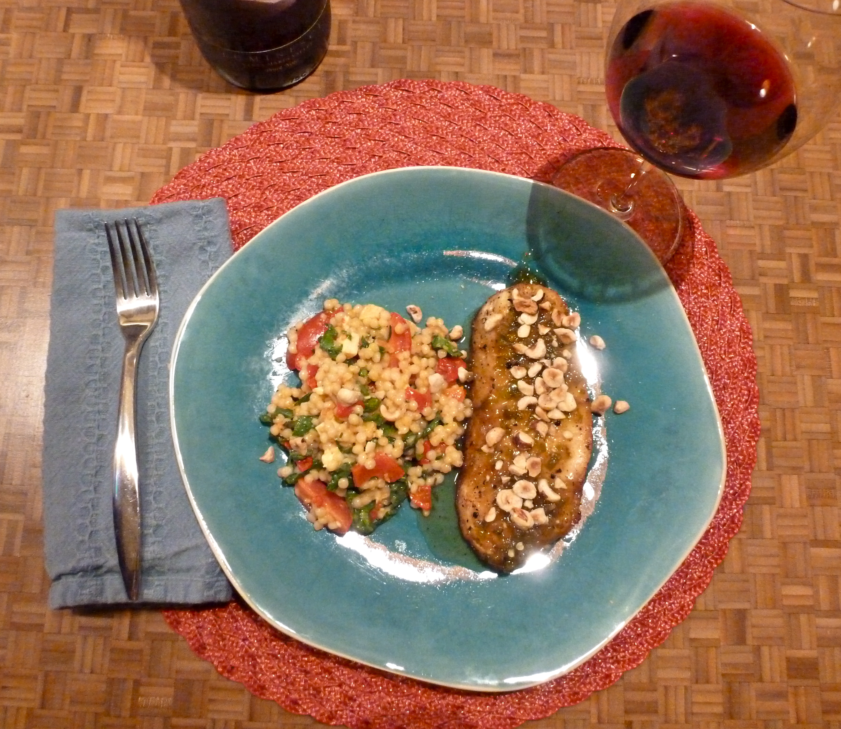 I’ve never seen John use a recipe before. Seeing one printed out on the counter along side my own indicated that we were both in uncharted territory here. Two new recipes in one night! Our ambitious menu for the evening was Broiled Sturgeon with Hazelnuts and a Lemon-Honey Jalapeno Glaze served with Israeli Couscous Salad with Smoked Paprika. Double yum.