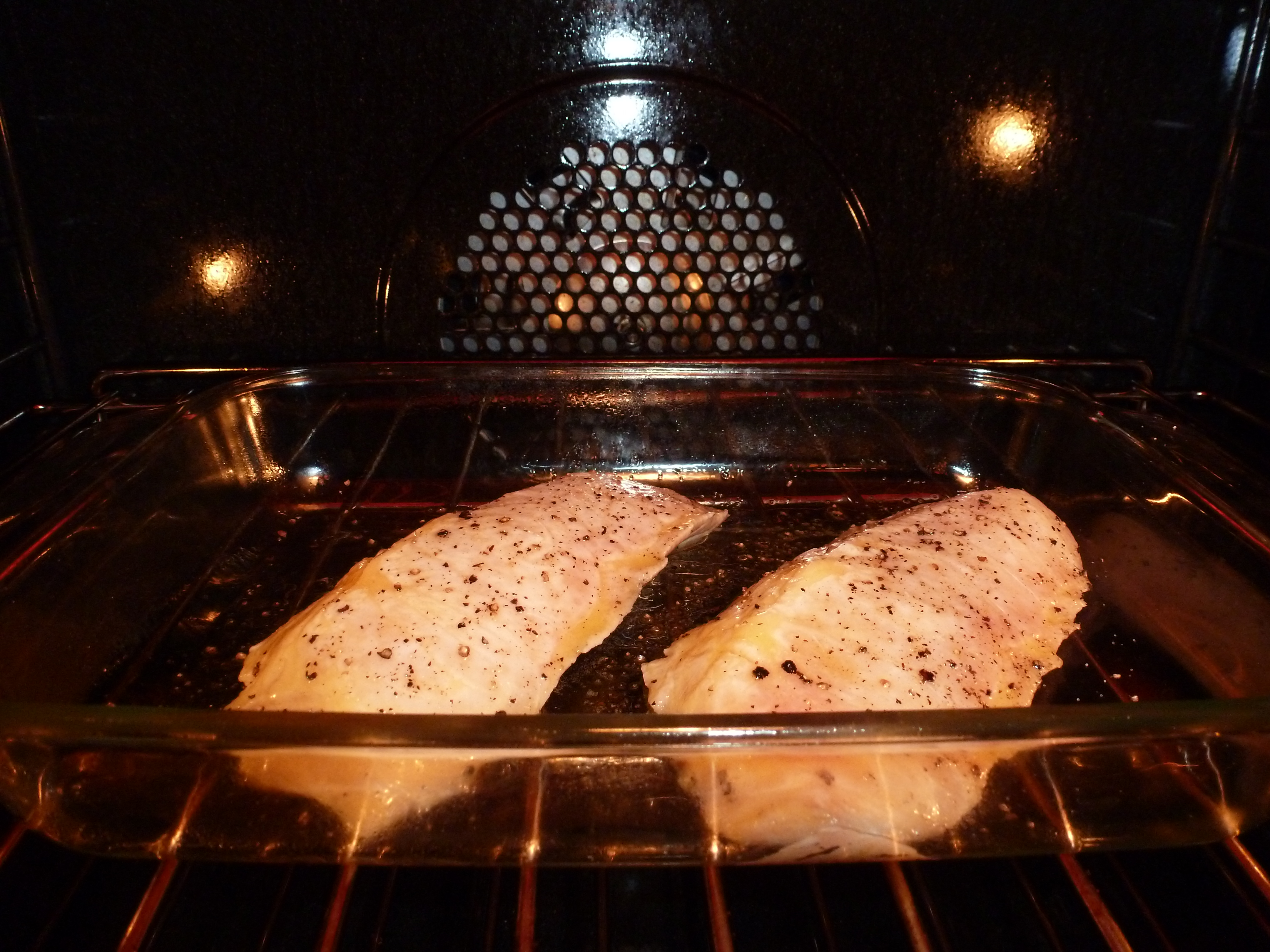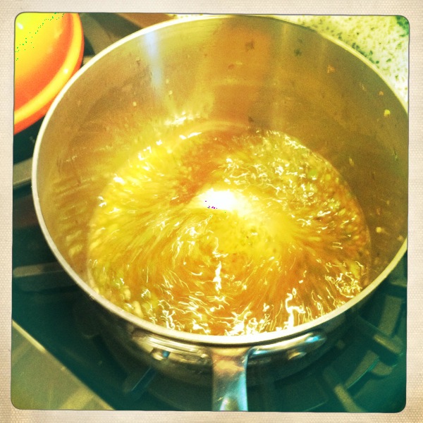 While I finished my half of the meal, John was creating some sort of glaze magic on the stove. I like a recipe that lets the fish be FISH– just a little olive oil, salt, and pepper, and into the broiler it went while John finished up the sauce. From what I could tell, the ingredients were all combined and simmered on the stove to thicken and become delish.