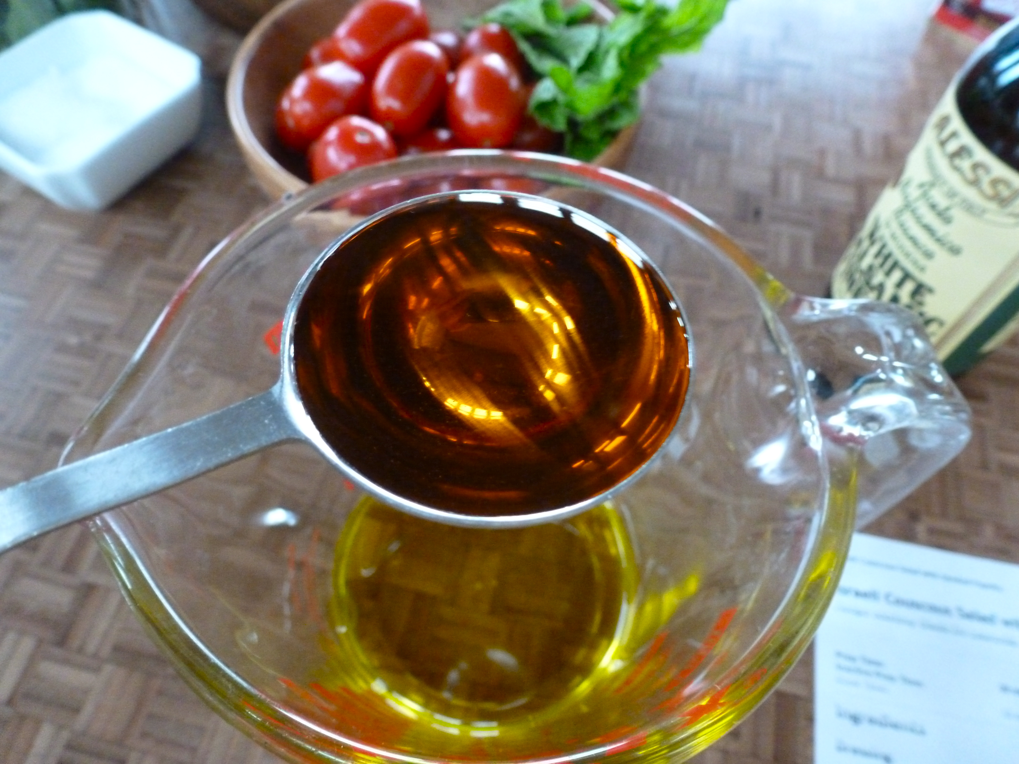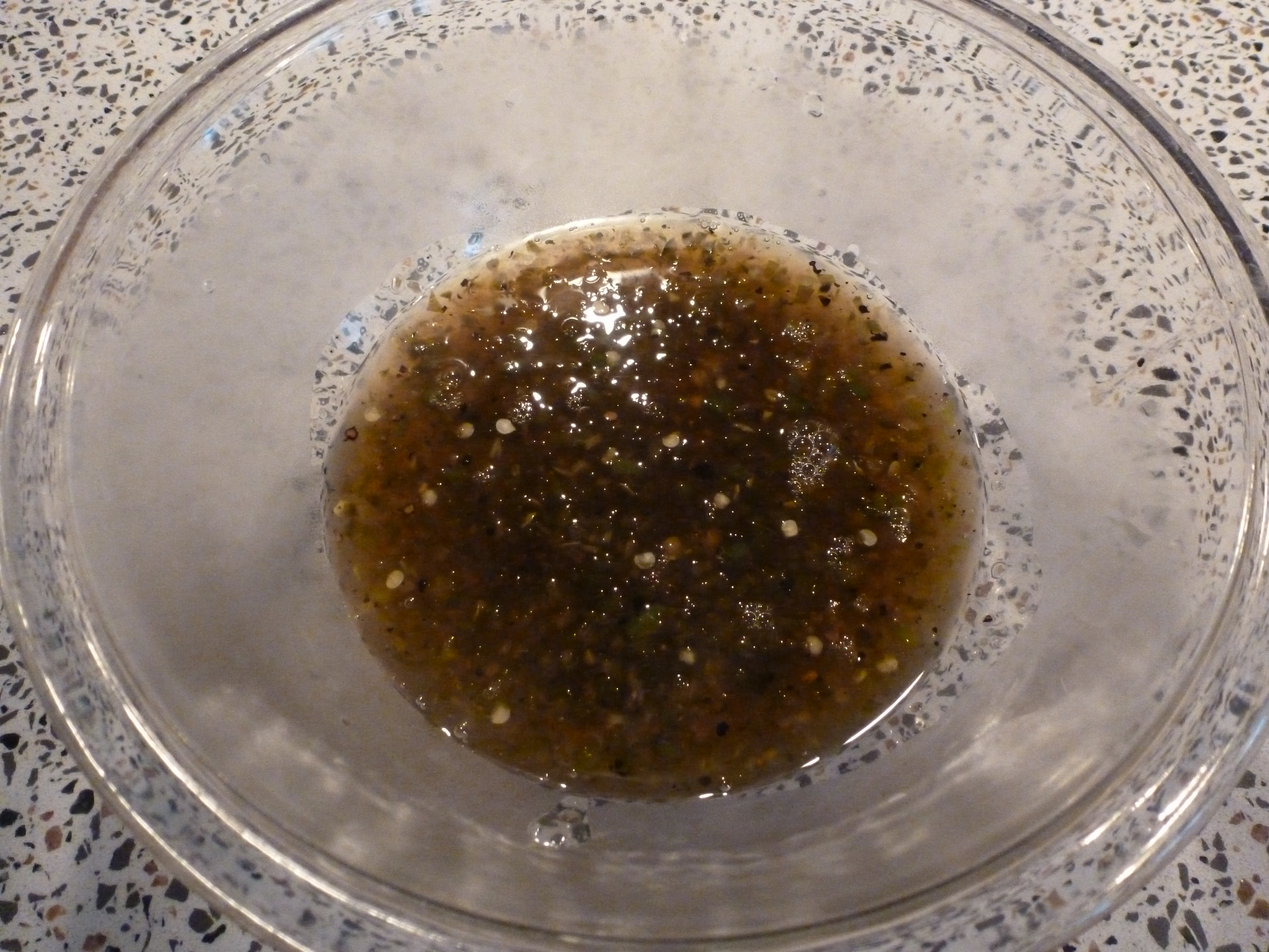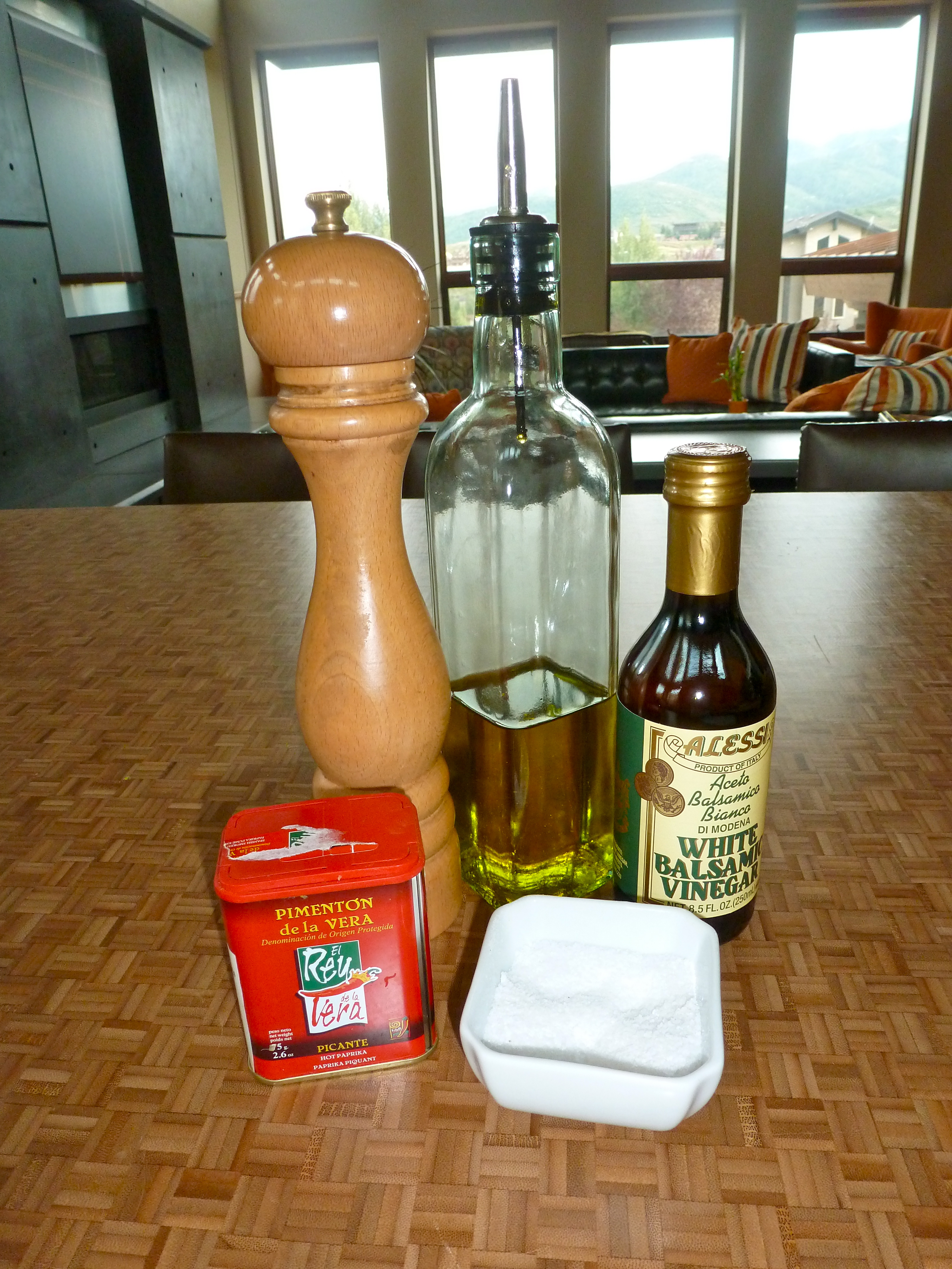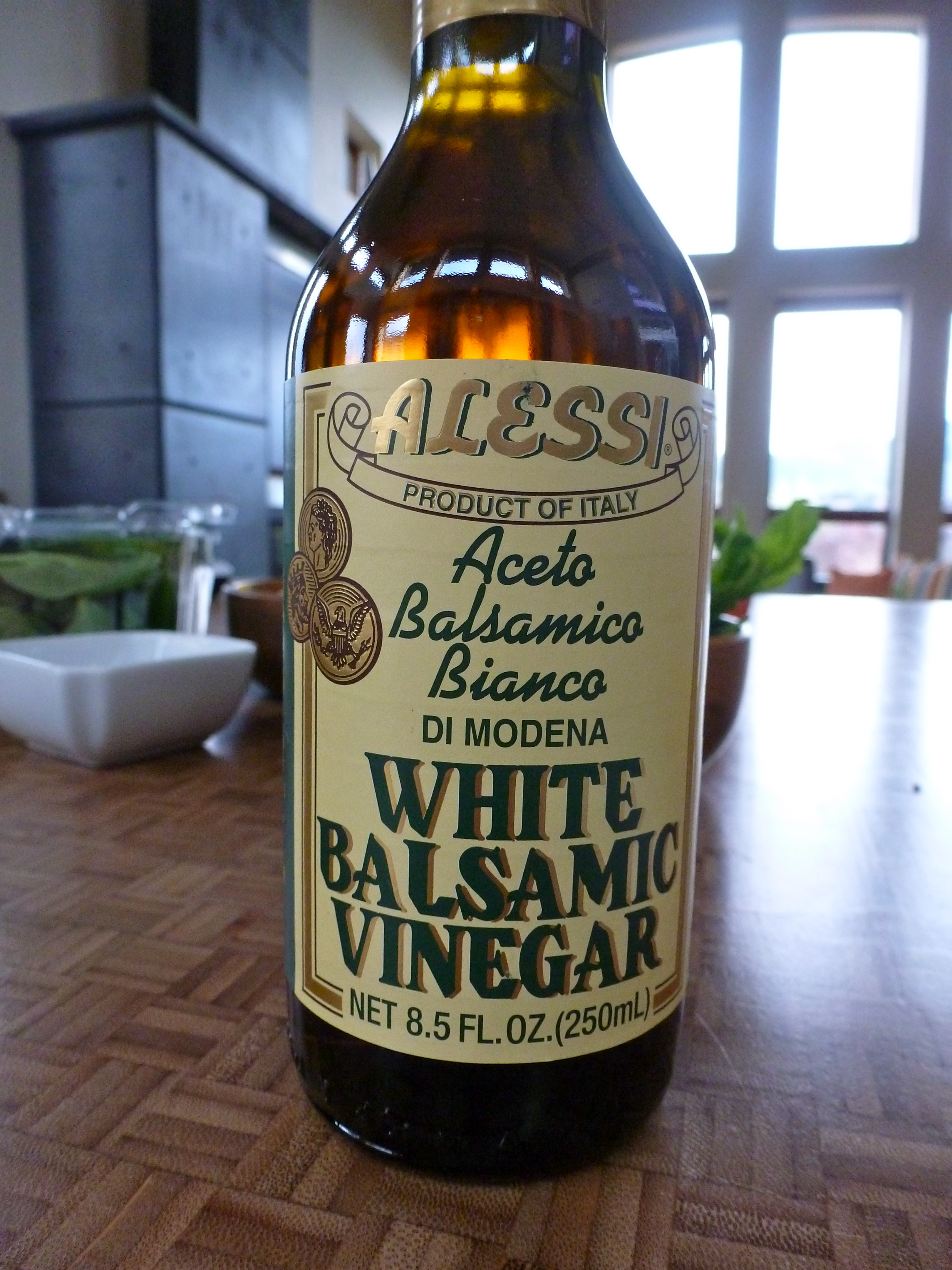 The coucous included some chopped veggies, herbs, feta cheese, and a paprika vinaigrette. While John rinsed and dried the fish, I got started. The dressing was very simple, but called for something I hadn’t used before- white balsamic vinegar. A little research taught me that white balsamic vinegar is similar in taste to the kind we’re used to (true), and would be used mostly for aesthetic purposes.