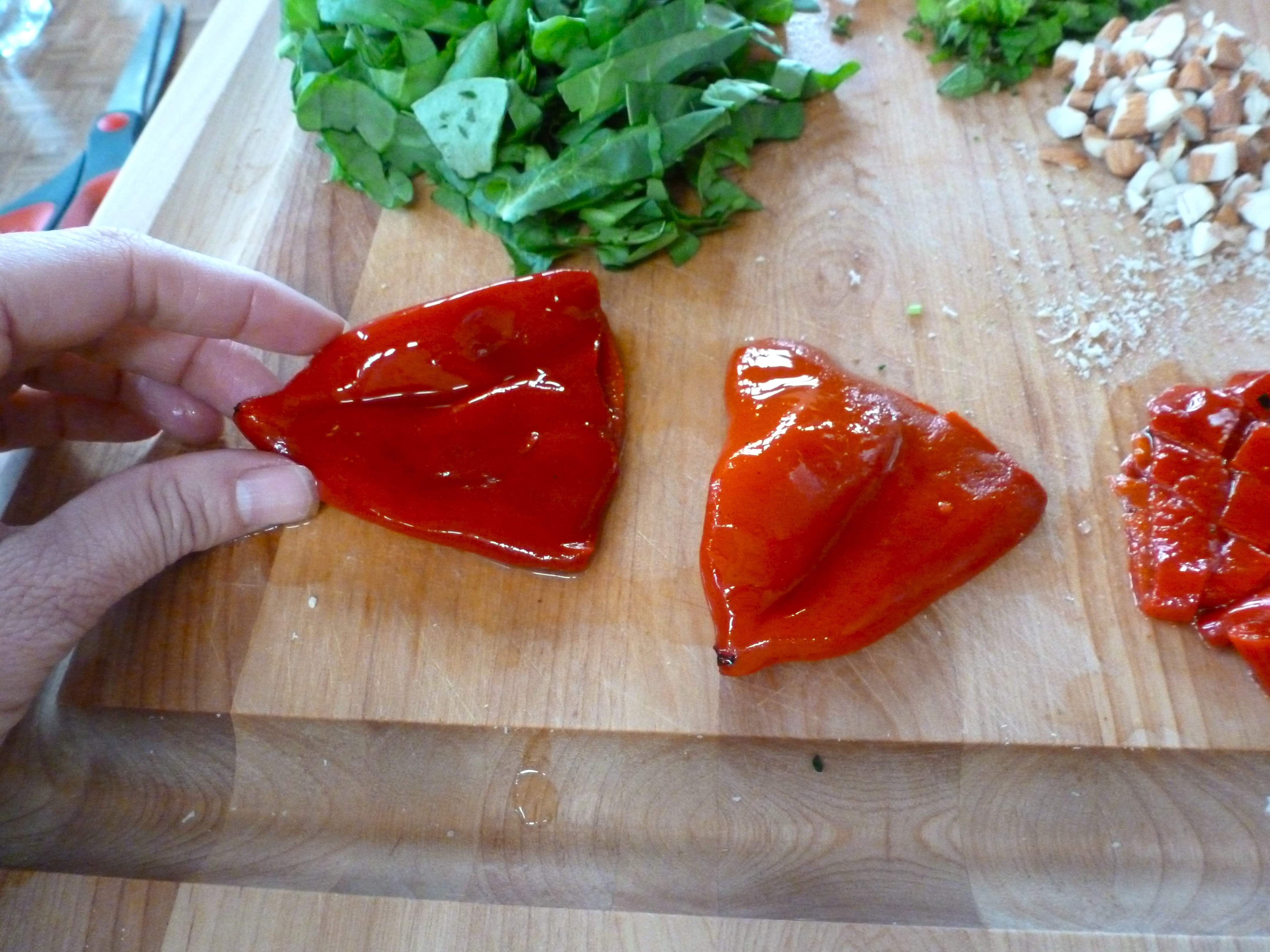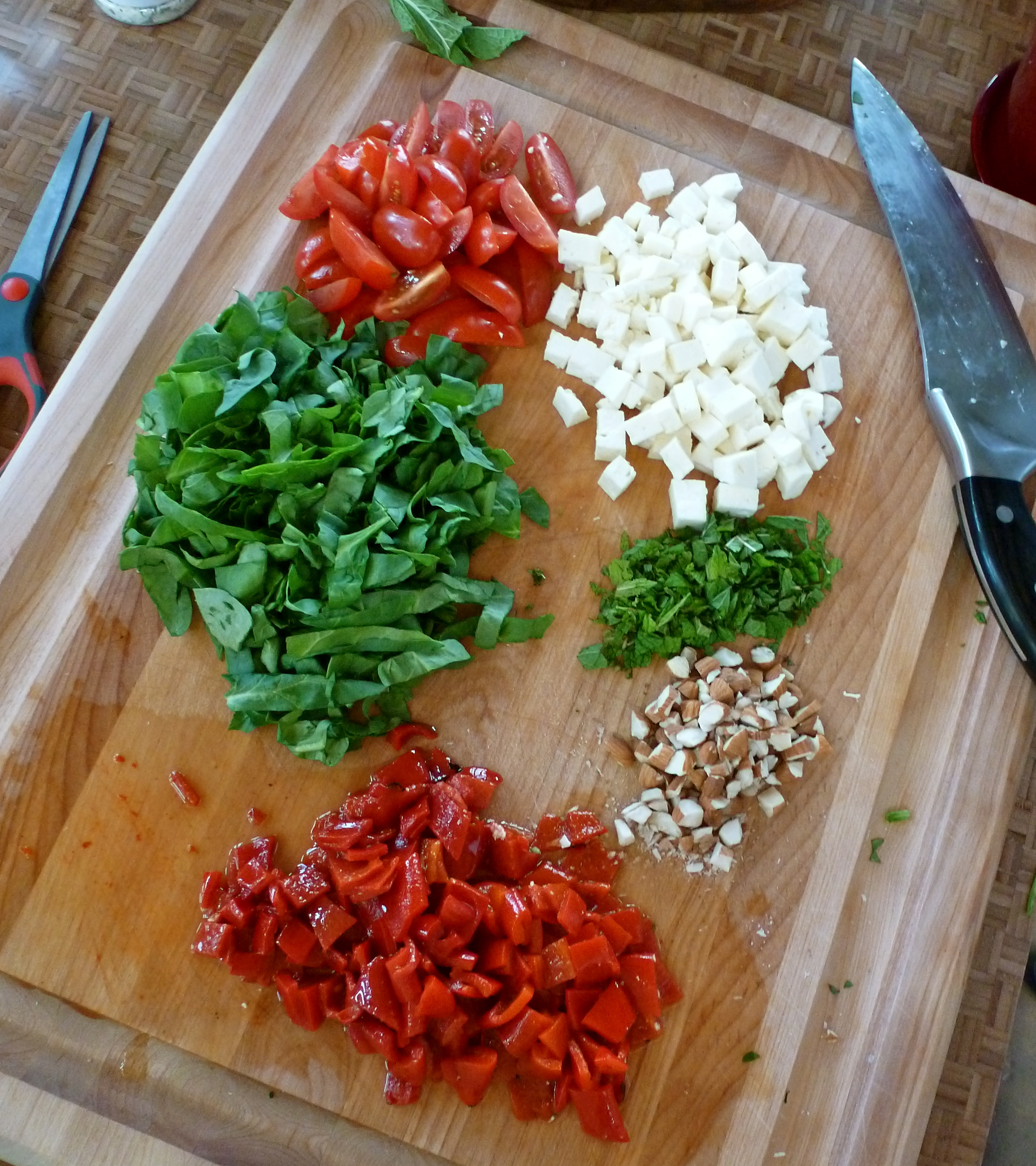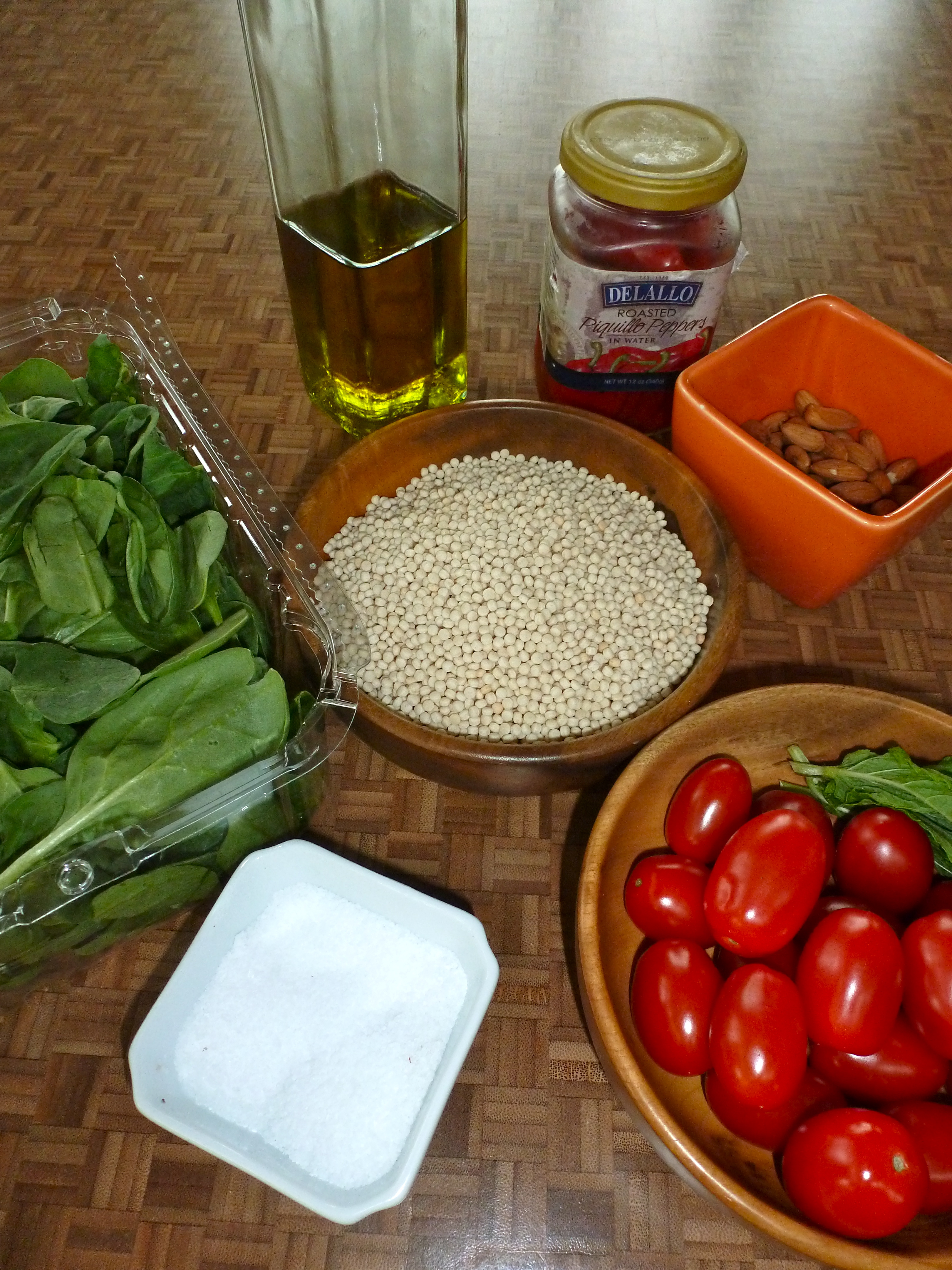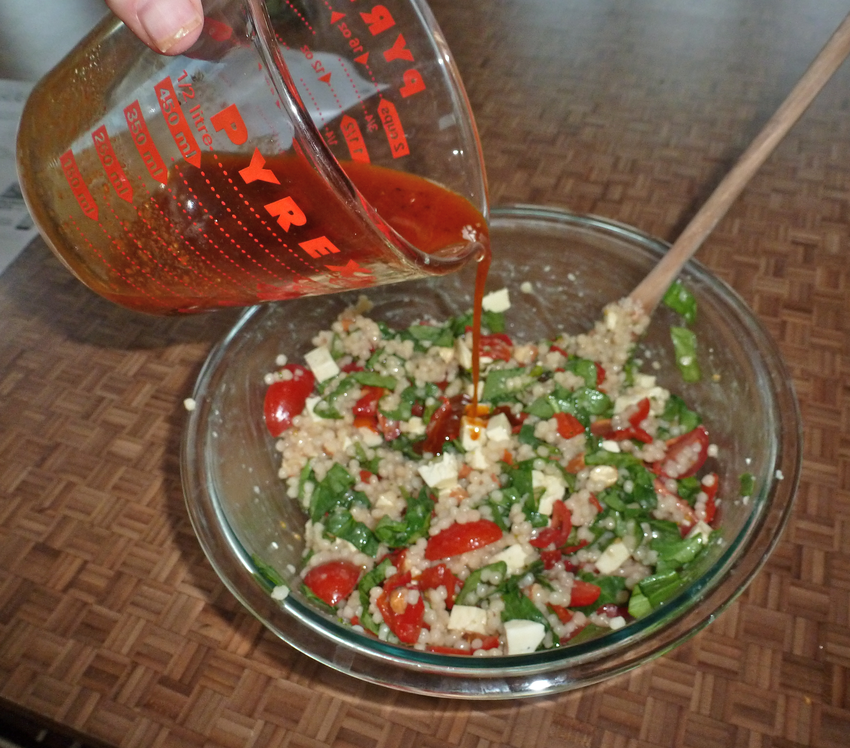 I like to toast couscous in the pan before I add the liquid (I used chicken stock). Toasting it brings out the nutty flavor. While the couscous did its thing on the stove, I chopped up the rest of the vibrant ingredients- spinach, grape tomatoes, mint, roasted red peppers, chopped almonds for crunch, and salty feta cheese. So colorful and fresh! Everybody joined the party in a big bowl, mixed together with the smoky, red-orange dressing.