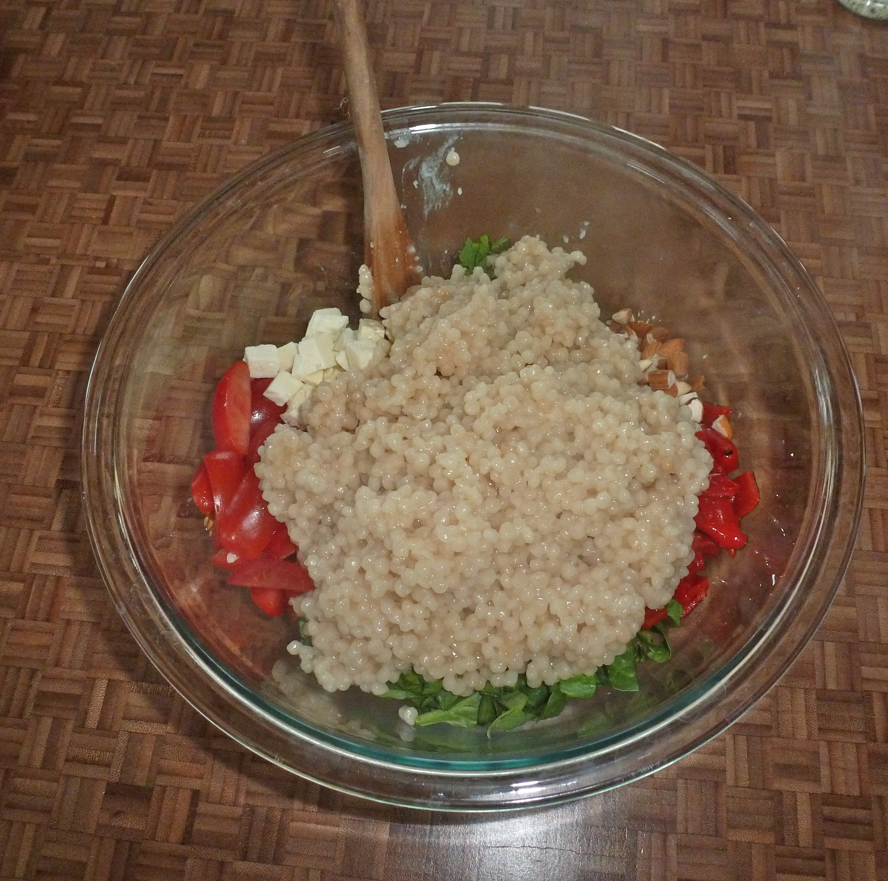 I think couscous is like rice- you can dress it up in any flavors that you like. This one was definitely Greek, with the feta and mint, but any veggies would work. I prefer the bigger couscous. The smaller version gets mushier when I make it. It’s probably user error… π