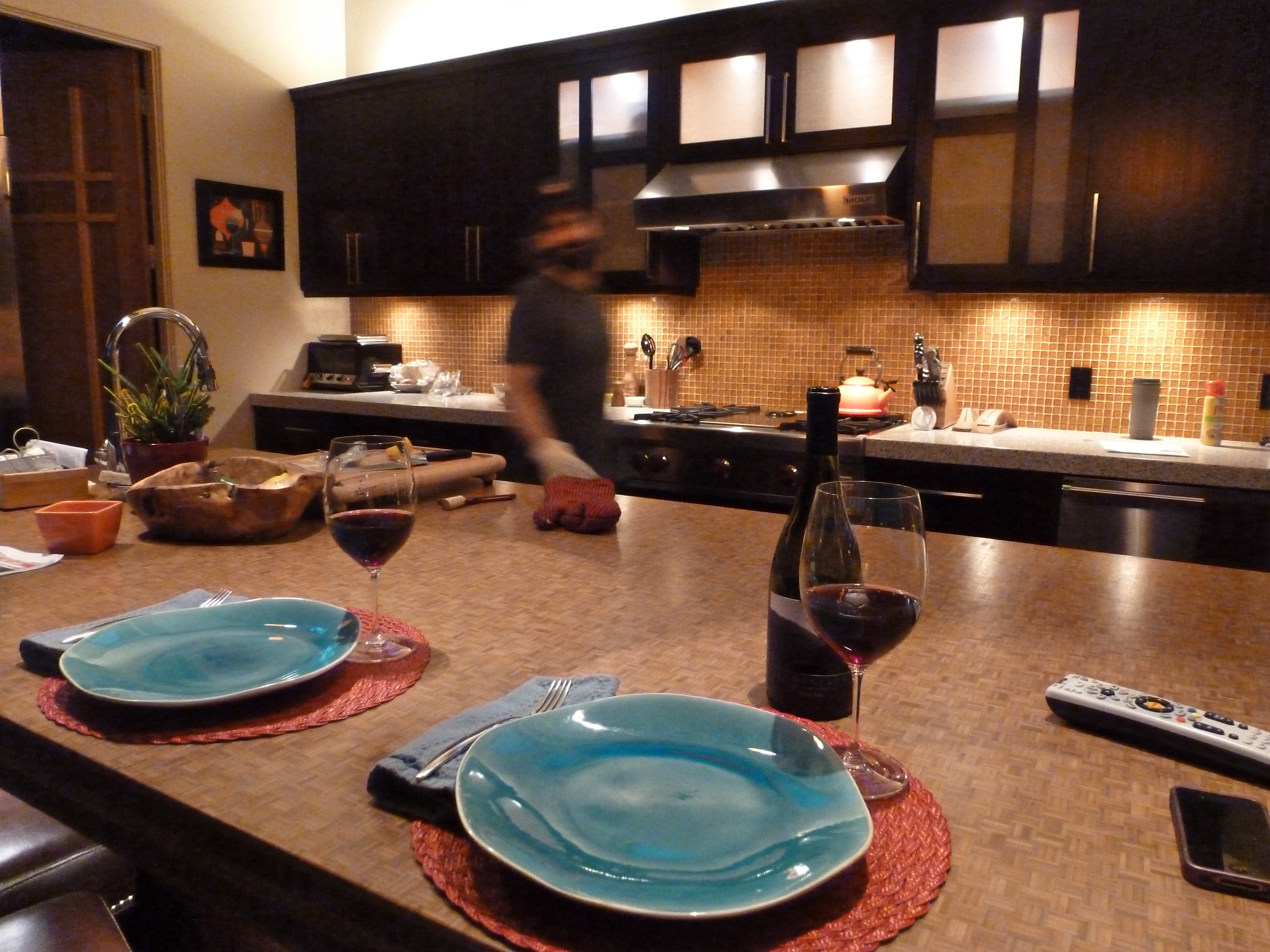 We cleaned up the kitchen, set the table (er, counter), and poured the wine while the sturgeon finished broiling (about 5-6 minutes per side). We sat down to enjoy another tag-team success, our plates full of color and TONS of flavor. The fish was firm but flaky, and the glaze had a sweet and spicy smokiness to it that paired well with the paprika in the couscous dressing. I ate every bite!