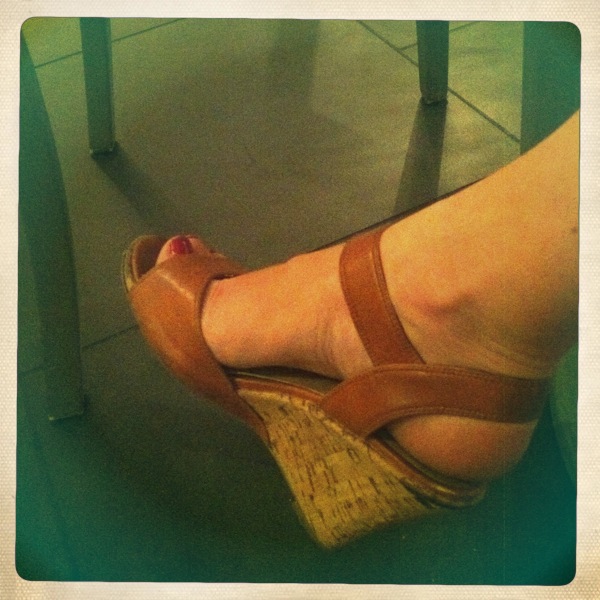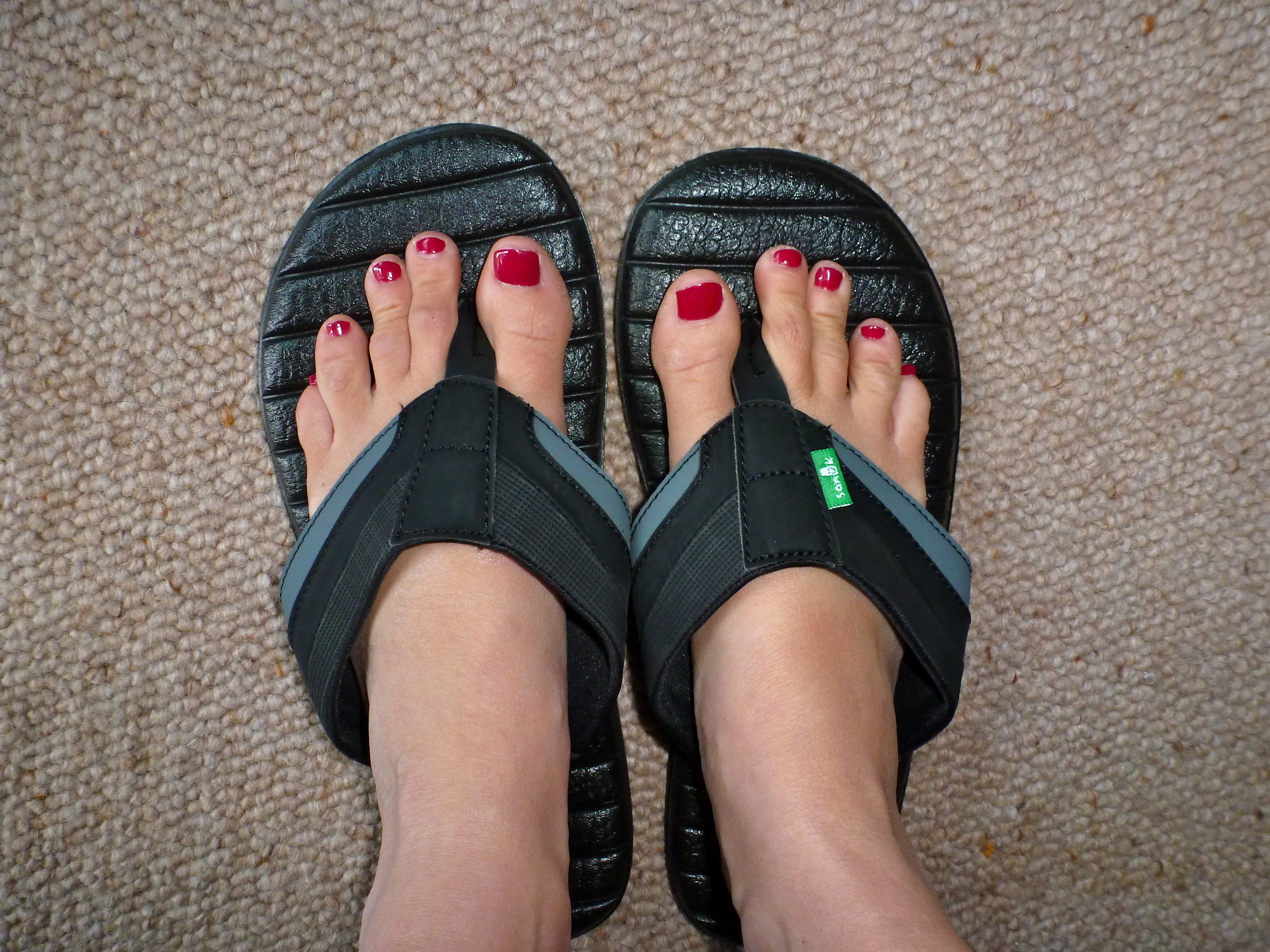 Testing John’s new flips and enjoying orchid-colored toesies.
