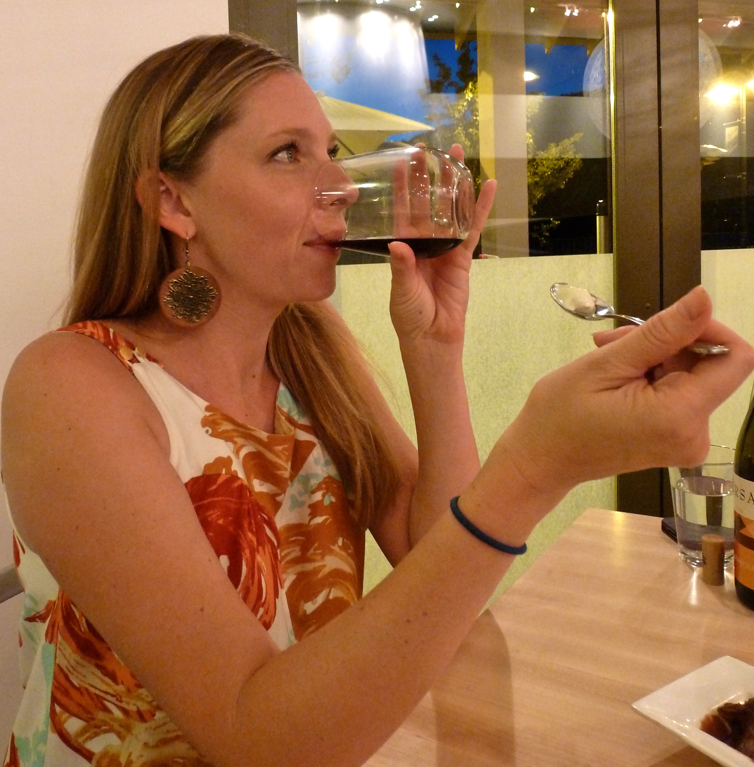 Contentedly halting my spiced honey gelato bite for a sip of wine.