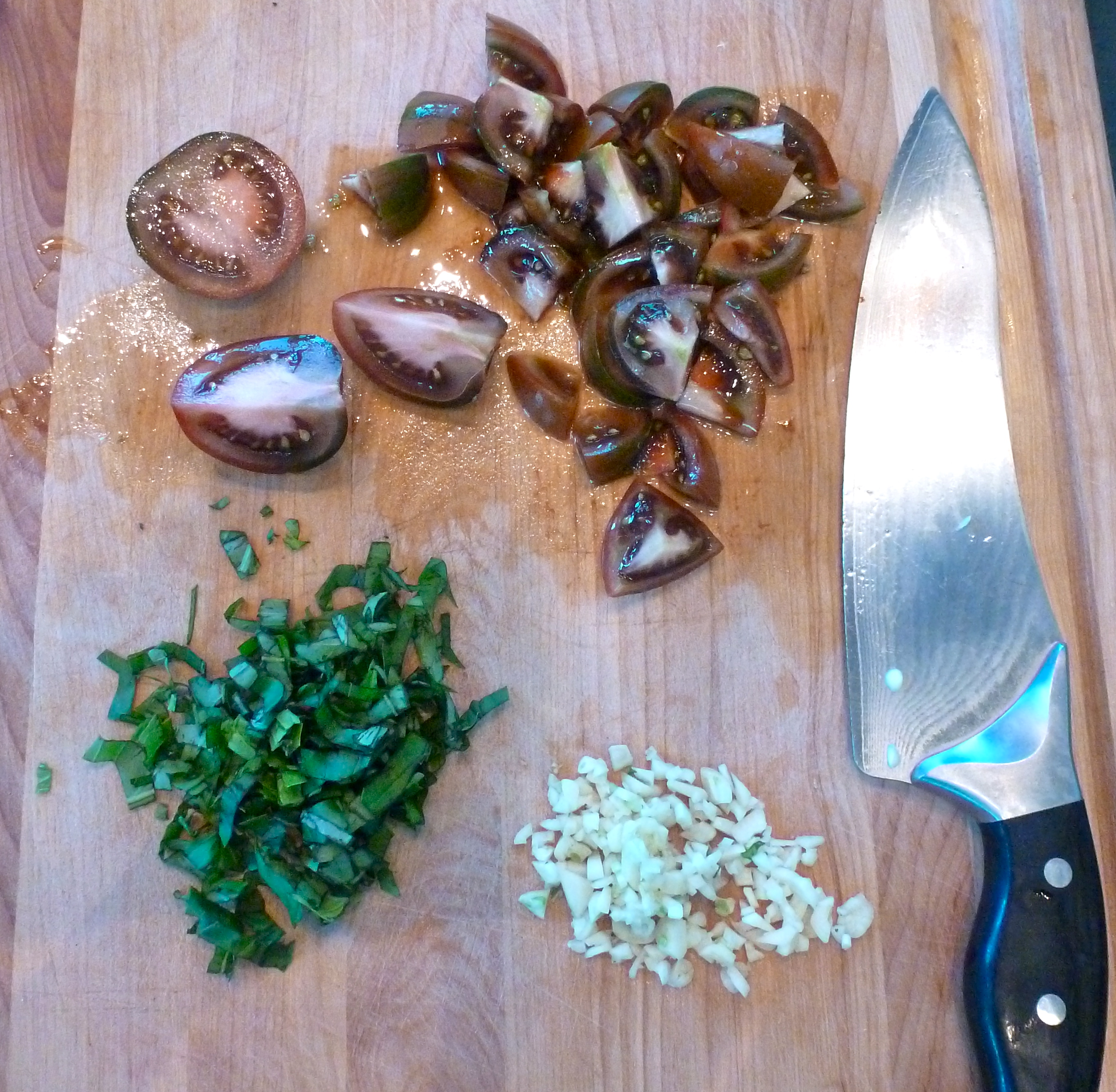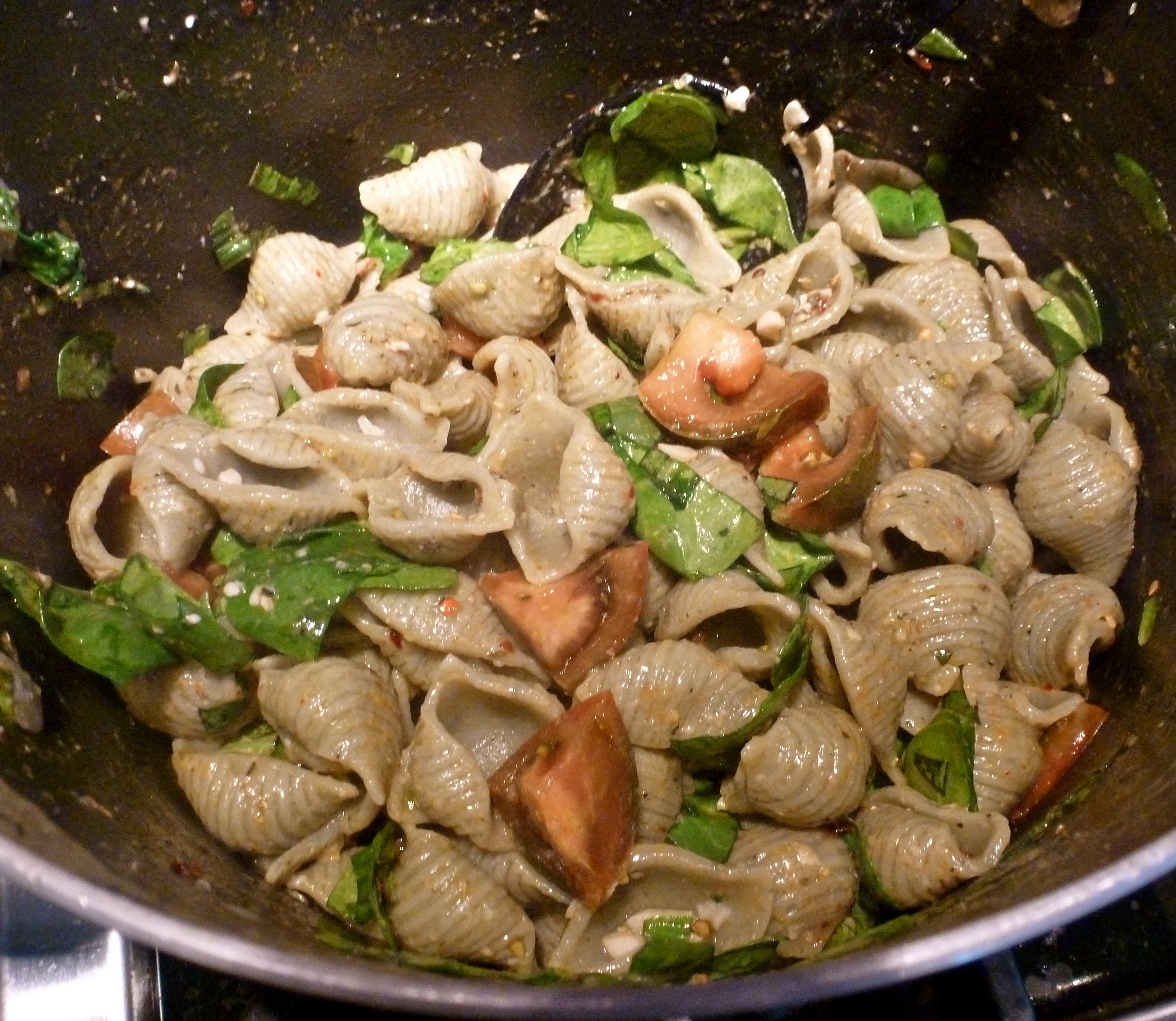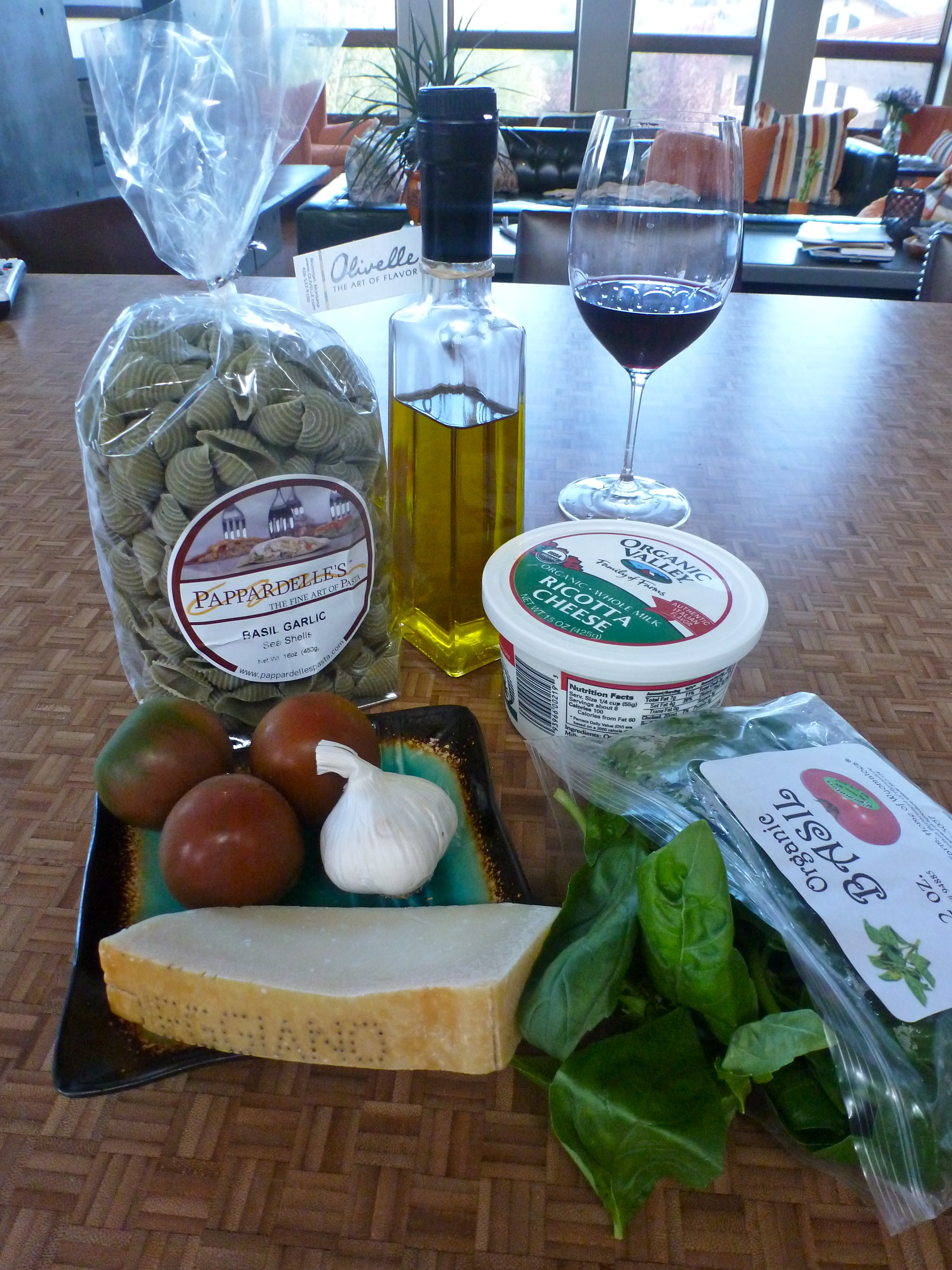 I needed very few ingredients: pasta, tomatoes, garlic, basil, spinach, ricotta cheese. I happened to have basil-garlic shells from the farmers market in the pantry, and an awesome garlic-and-herb olive oil from a shop in Bozeman. Oh, I also cubed some fresh mozzarella, taste-testing a few pieces. While the pasta boiled, I chopped away. The hardest part was stopping to sip wine.