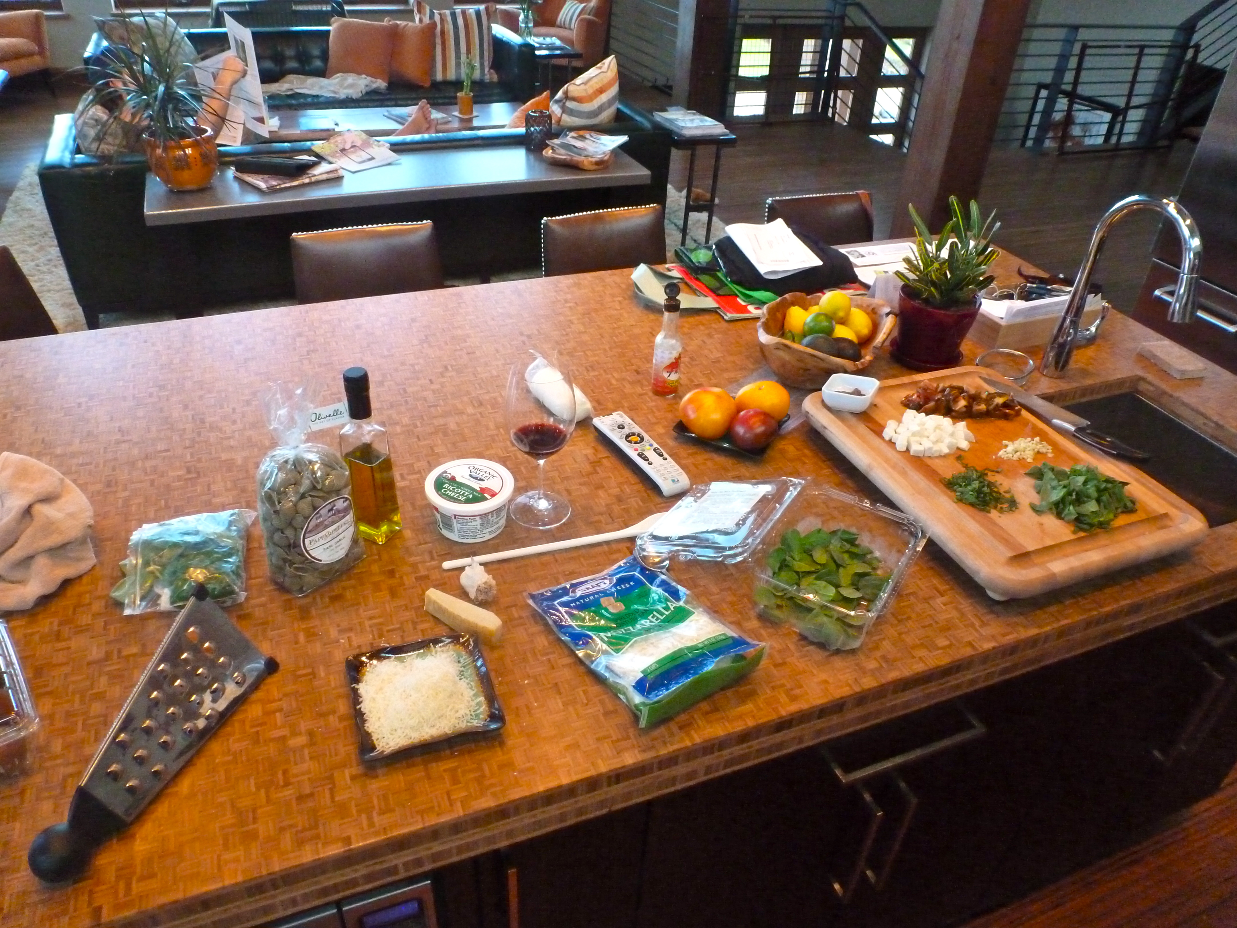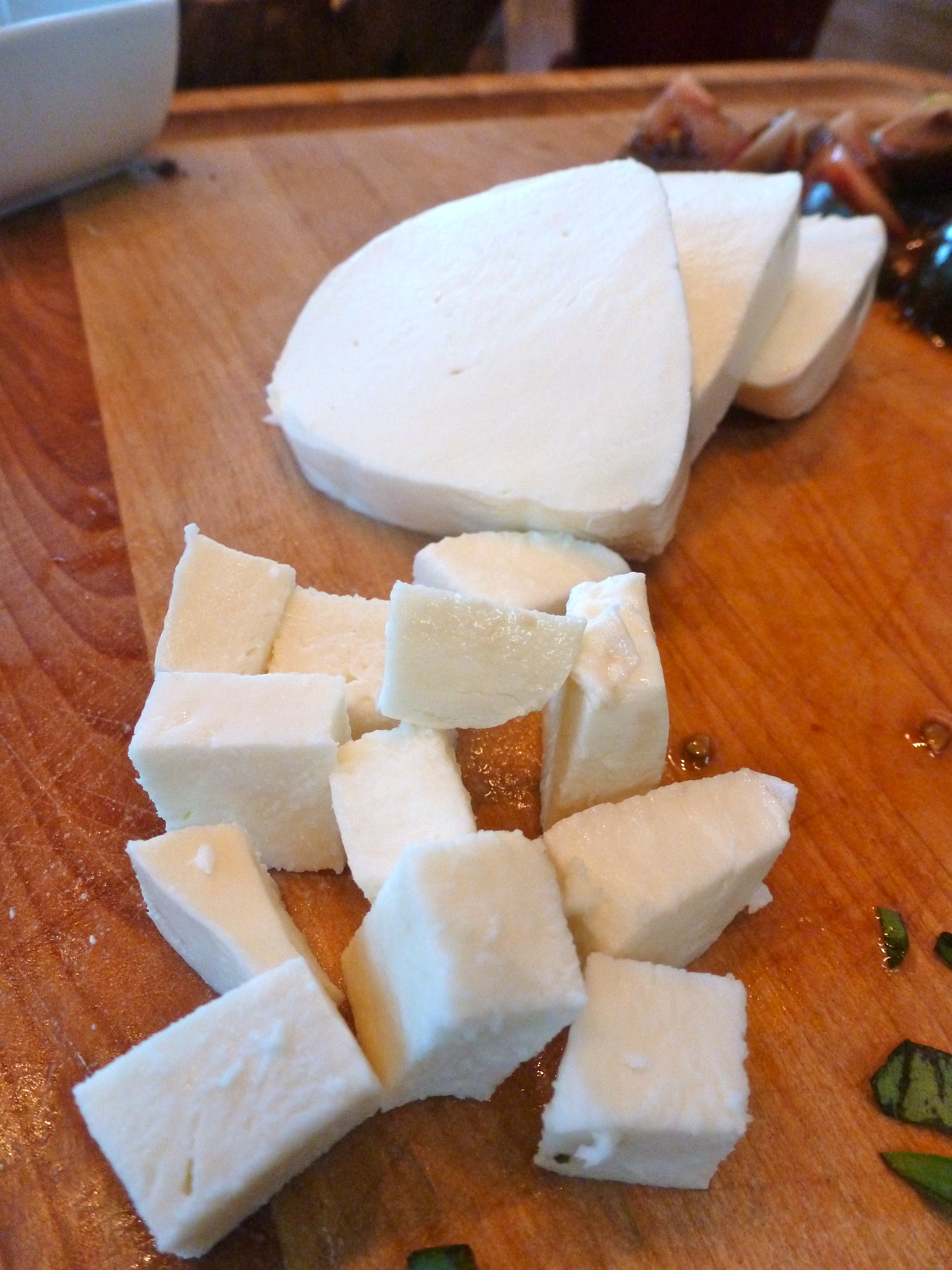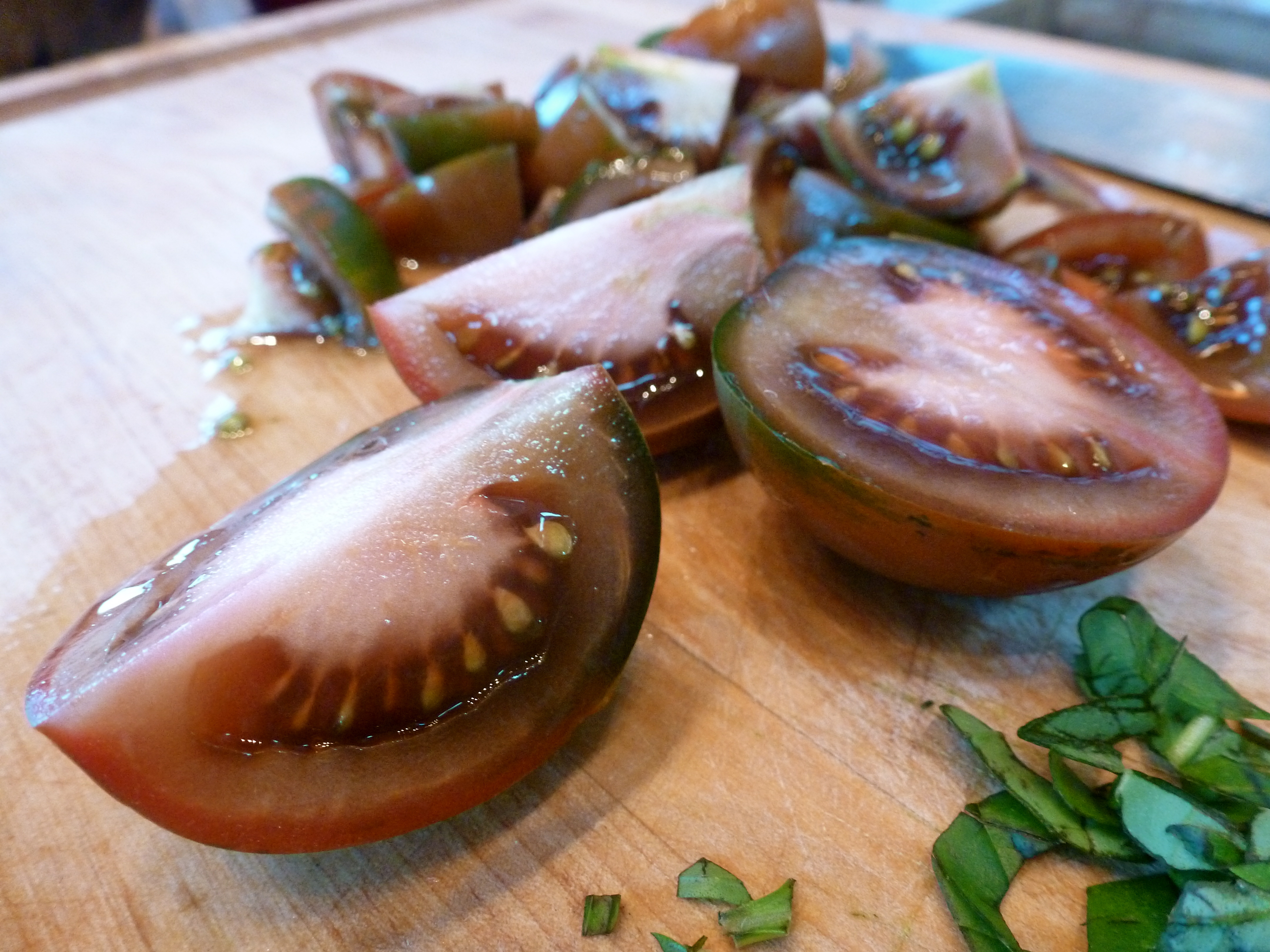 I needed very few ingredients: pasta, tomatoes, garlic, basil, spinach, ricotta cheese. I happened to have basil-garlic shells from the farmers market in the pantry, and an awesome garlic-and-herb olive oil from a shop in Bozeman. Oh, I also cubed some fresh mozzarella, taste-testing a few pieces. While the pasta boiled, I chopped away. The hardest part was stopping to sip wine.