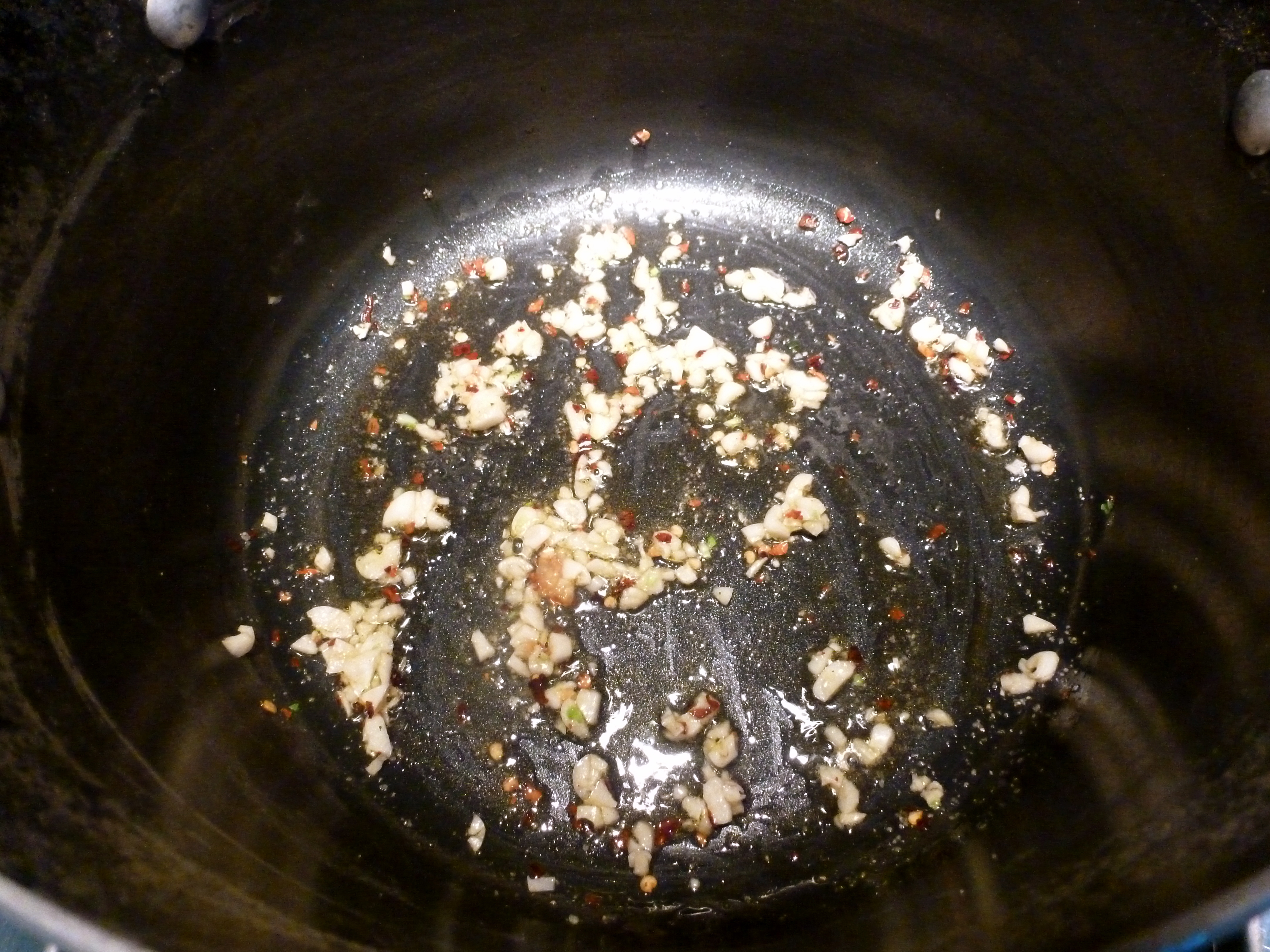 How long does pasta take to cook…10 minutes? Ya, that’s all the time I needed to prep the rest of the ingredients. I drained the pasta and then sauteed the garlic in some of the infused oil, right back in the pasta pot. (Another pan would have meant more dishes later… and I’m lazy, remember?) The pasta went back into the pot, too, along with the chopped tomatoes, basil, spinach, a scoop or two of ricotta cheese, some pre-shredded mozzarella, and the mozzarella cubes. Some crushed red pepper, some garlic salt, a few shakes of dried oregano and a quick stir: so easy.
