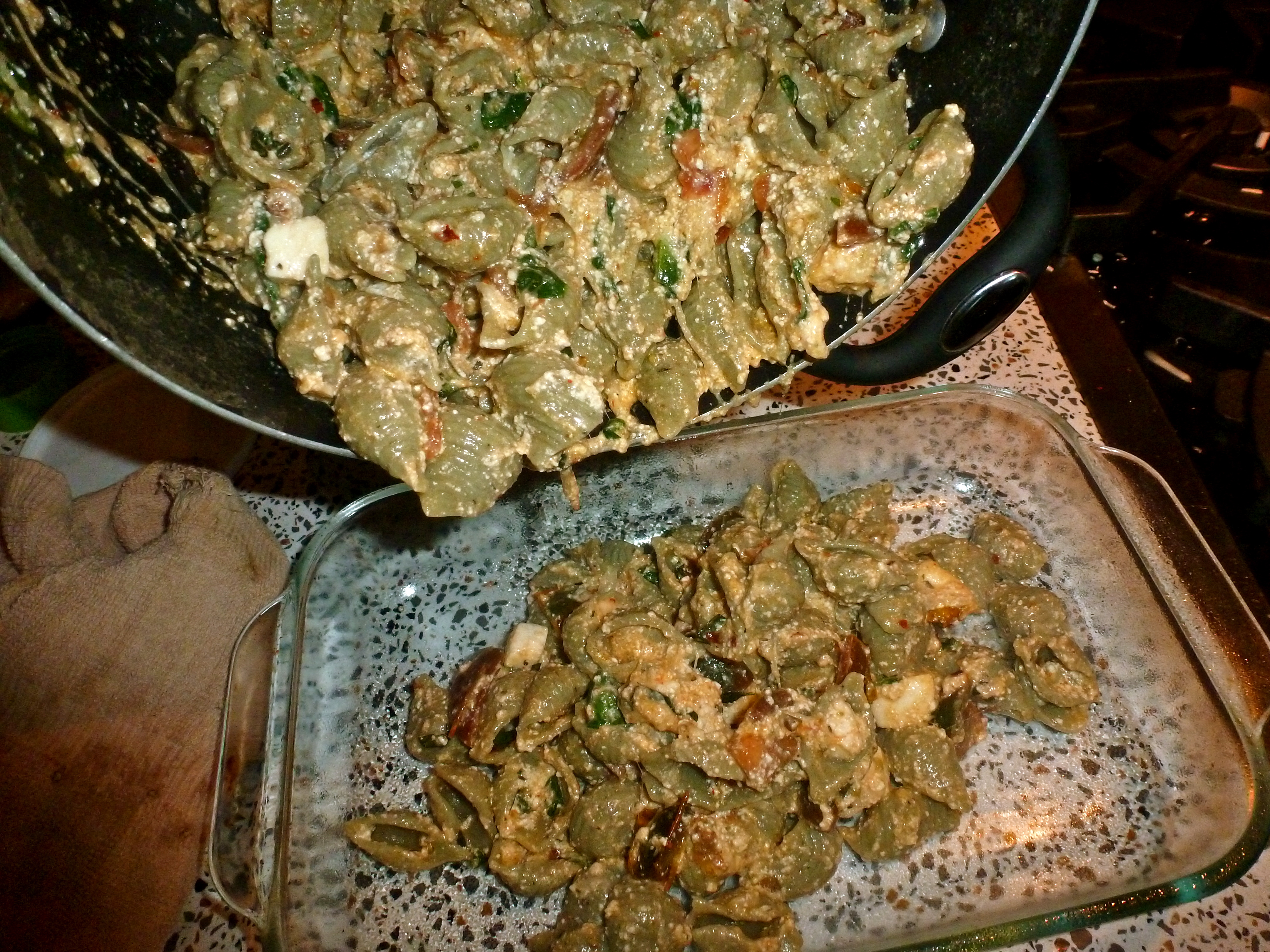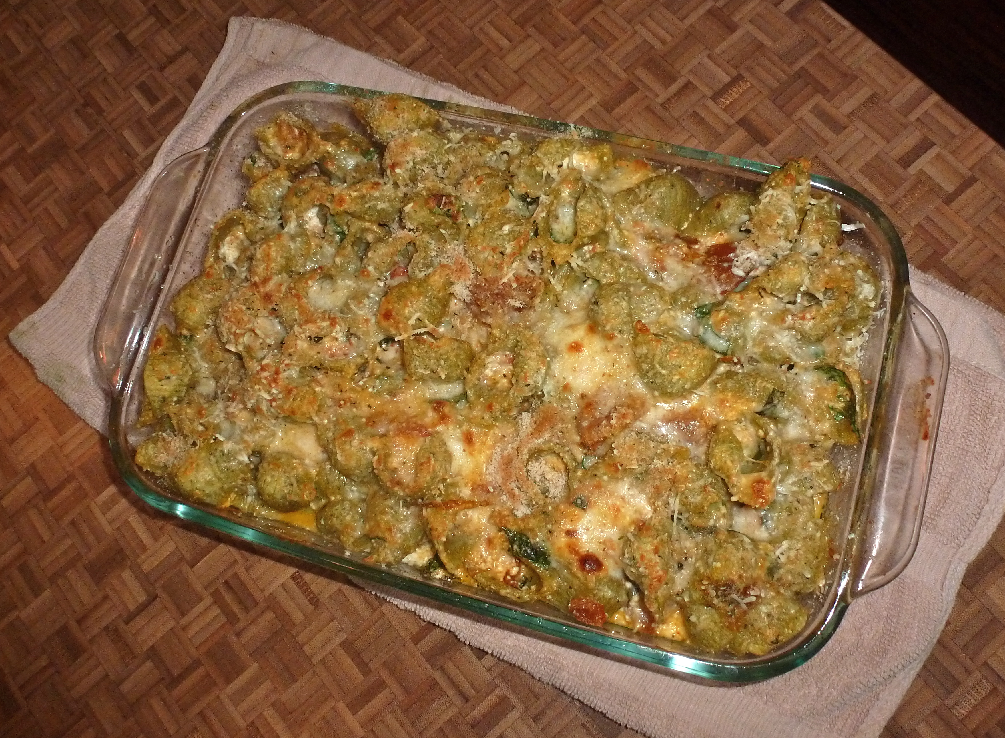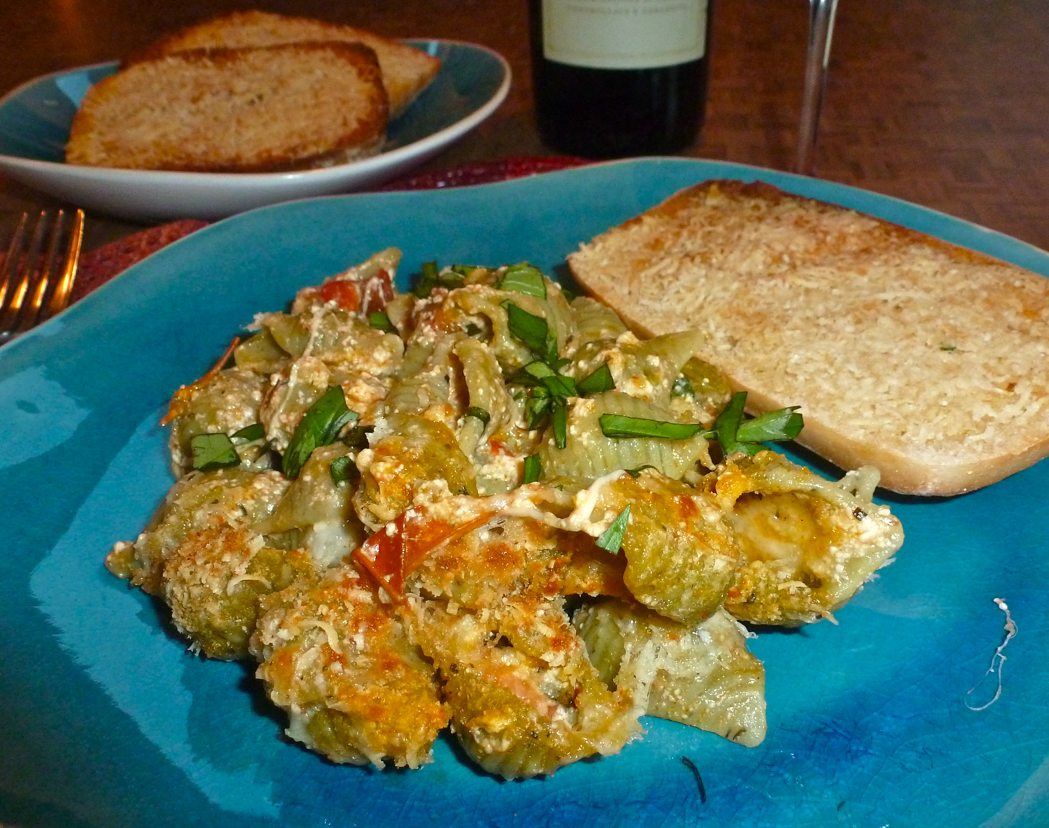 Um, YUM! The breadcrumbs were a good idea, because it gave a little crunch to an otherwise creamy dish. I think next time, I’ll add other veggies like zucchini and mushroom for more variation. Any small pasta would work, too. Lazy Bliss Baked Shells were a total success, and took hardly any effort. John had seconds.