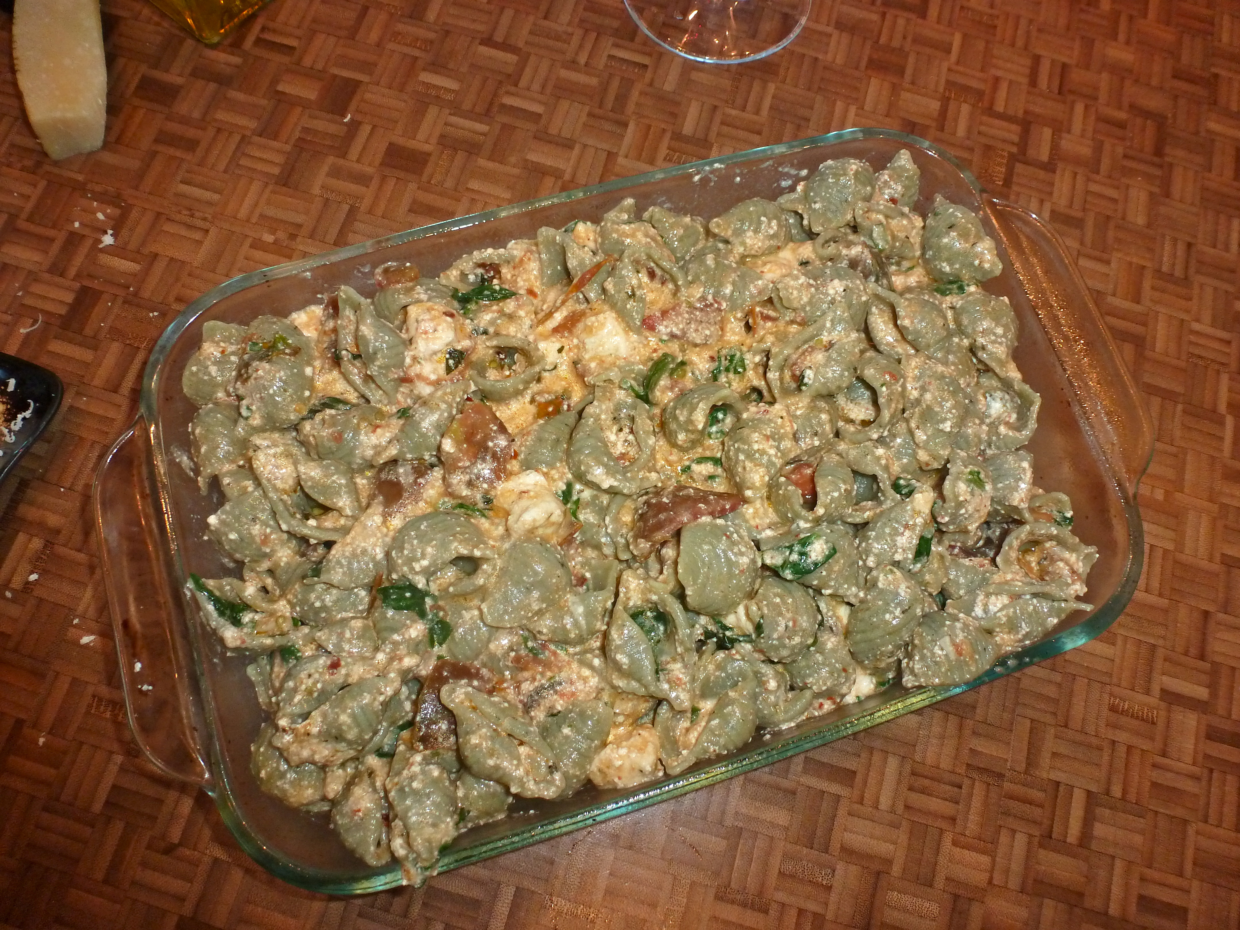 Last night, John was planning on making one of his specialties: grilled salmon with a delicious cucumber-dill tzatziki sauce. But he wasn’t pleased with the salmon (he prefers his on the rare side). So I threw together an off-the-cuff pasta dish that took very little effort… and tasted great!